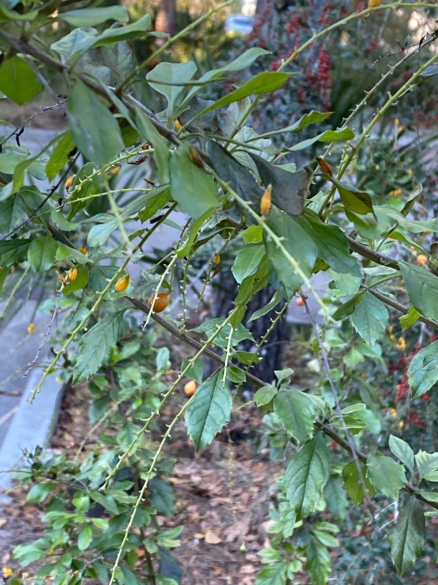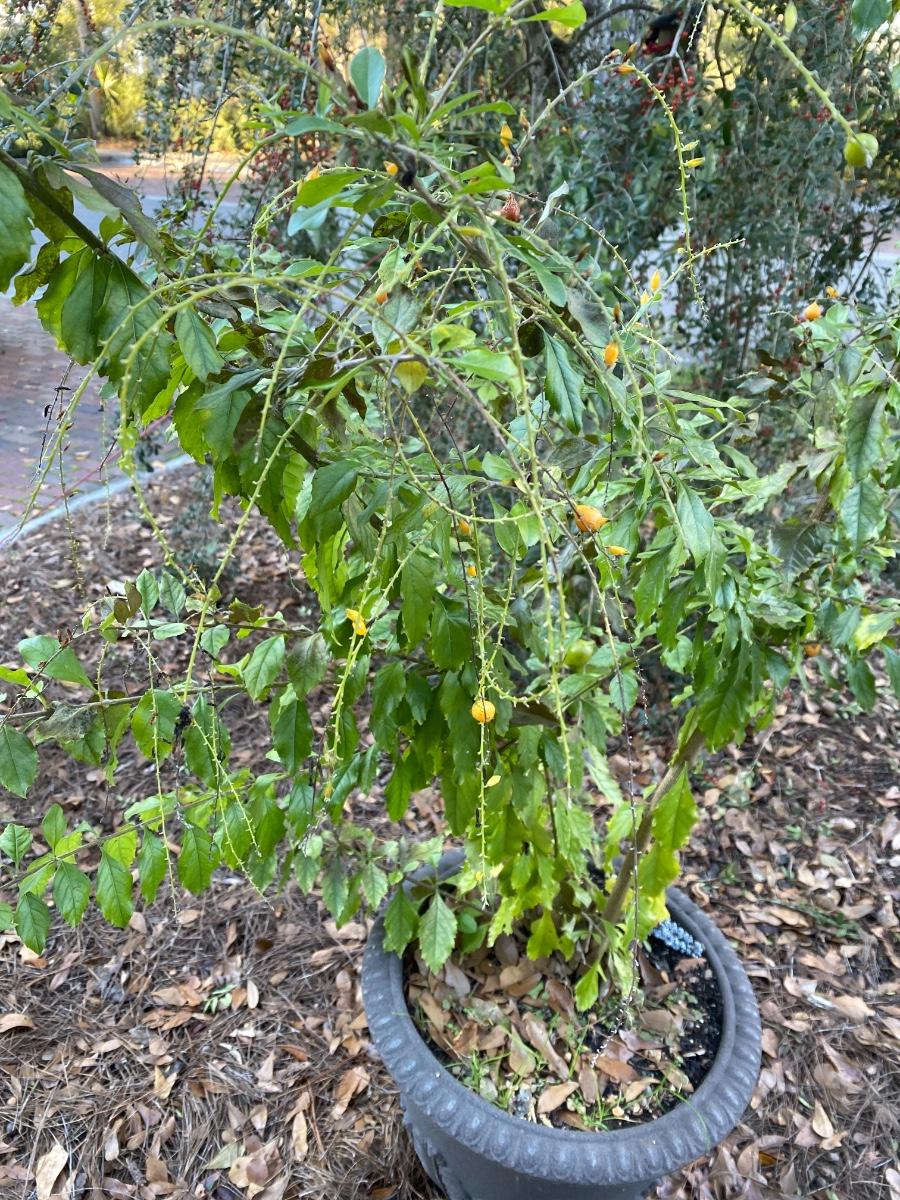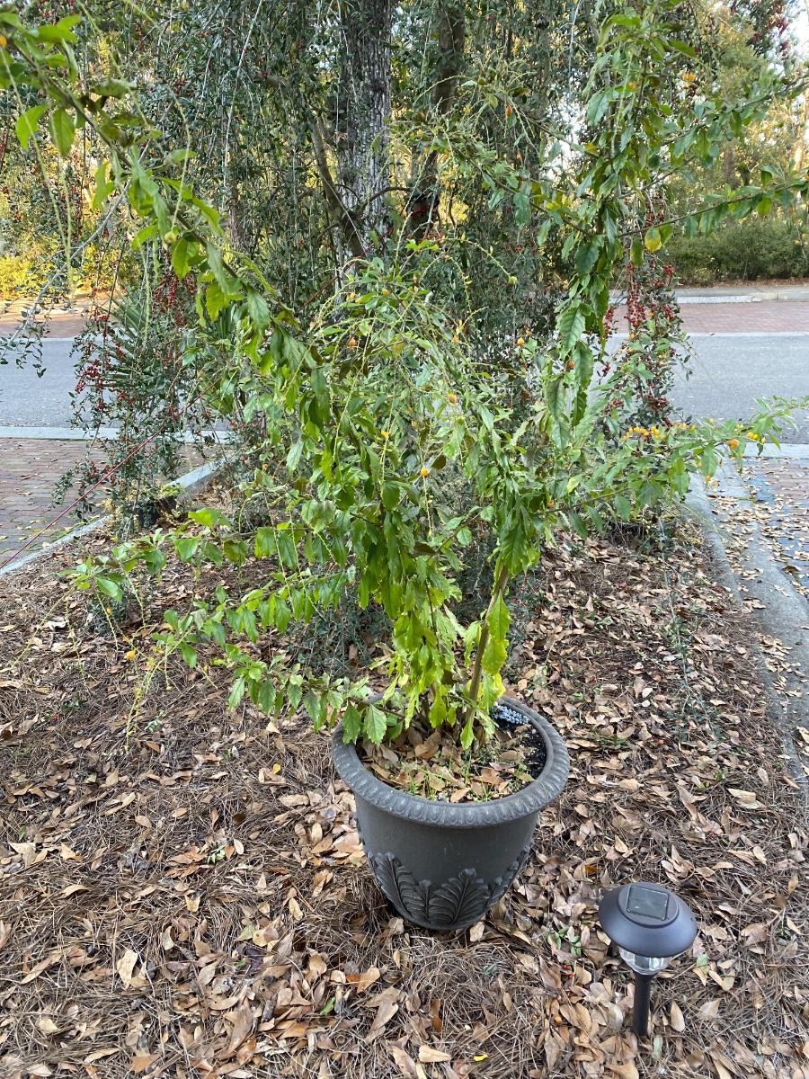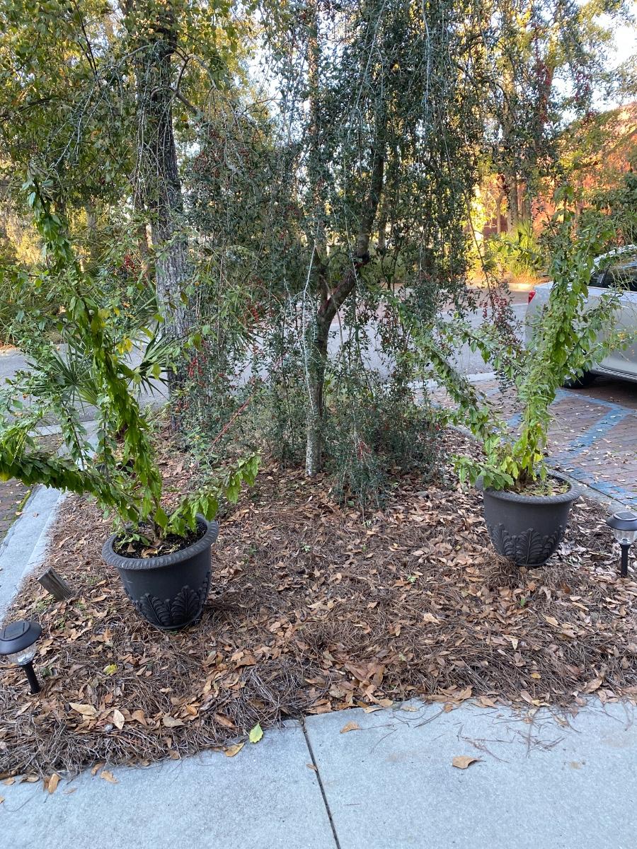 Pots are plastic. Each plant measures approximately 4 feet high. In front of house