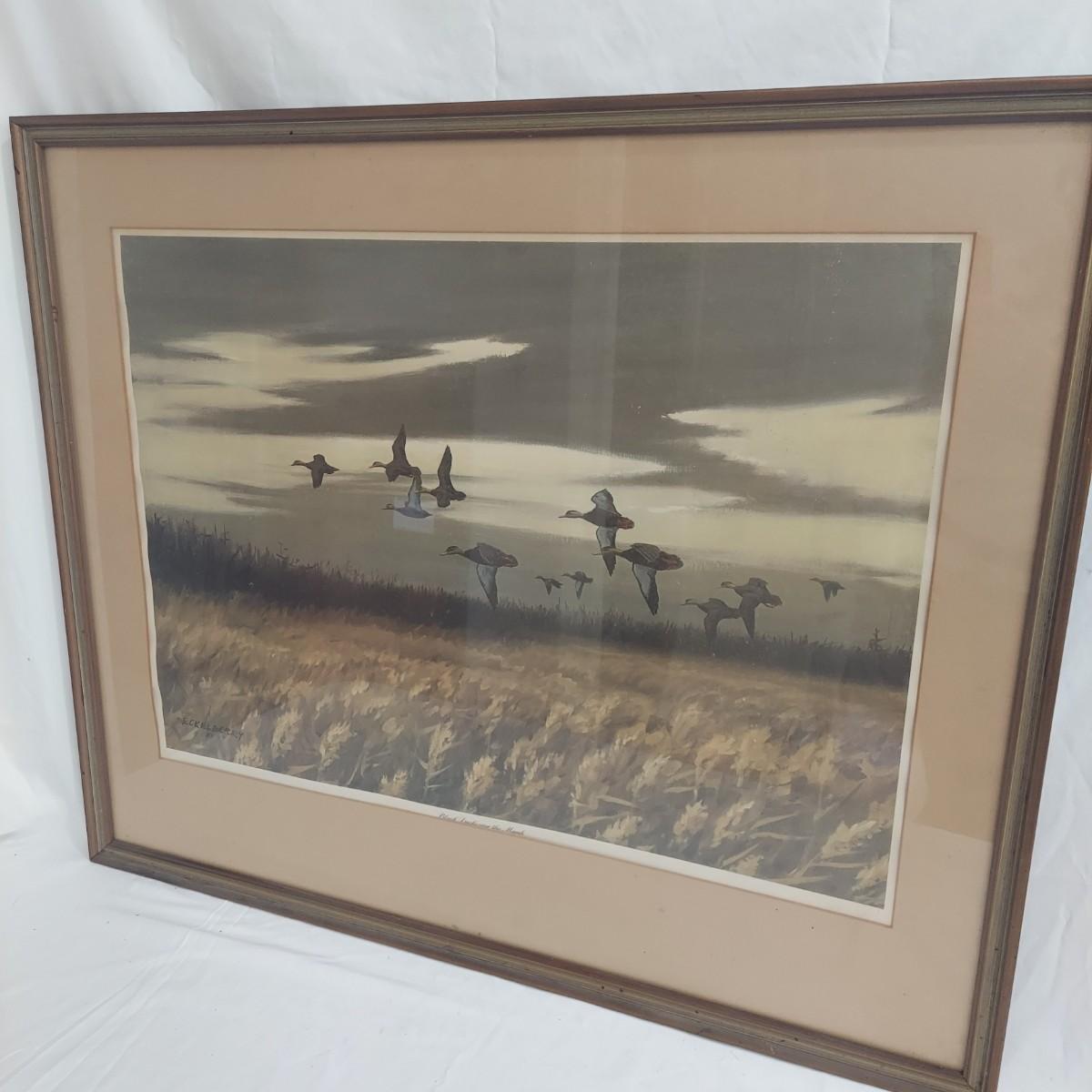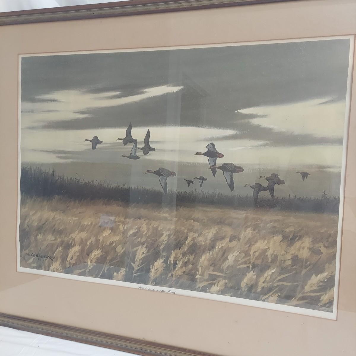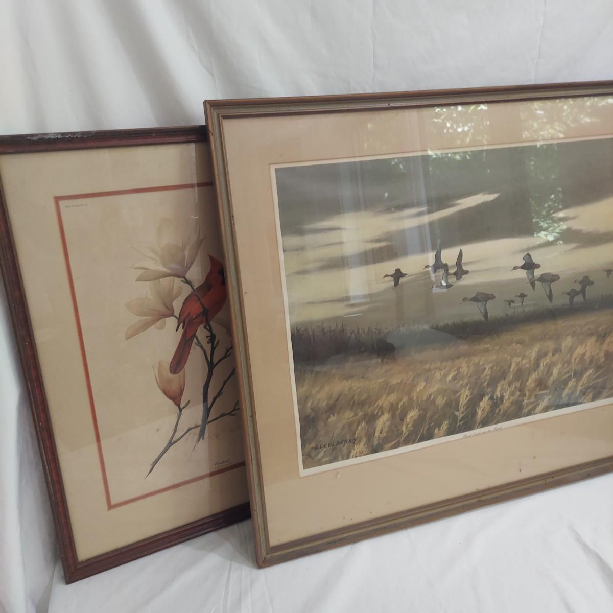 Two framed prints under glass by Don Richard Eckelberry. “Cardinal” signed print in a wood frame that measures 22” x 28"H. With “Black Ducks over the Marsh” in a frame that measures 36” x 30"H. Some condition issues. Please see photos for details. Shipping available. Shipping certain items can be costly. We suggest contacting our preferred local shipping provider, Postage Express, with dimensions and getting an estimate before bidding: (828) 255-9250 or shipping@postageexpressnc.com