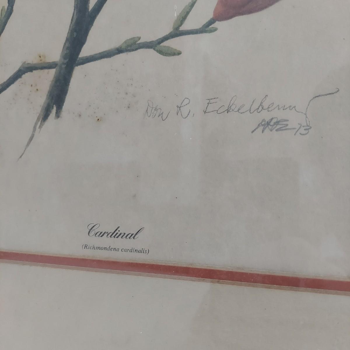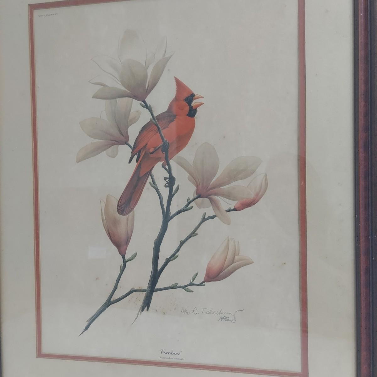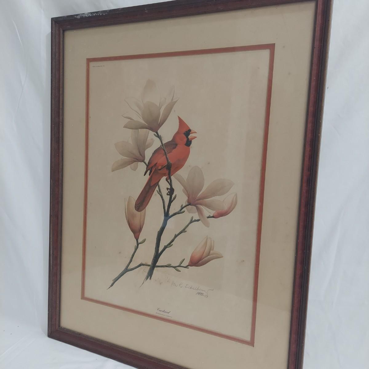 Two framed prints under glass by Don Richard Eckelberry. “Cardinal” signed print in a wood frame that measures 22” x 28"H. With “Black Ducks over the Marsh” in a frame that measures 36” x 30"H. Some condition issues. Please see photos for details. Shipping available. Shipping certain items can be costly. We suggest contacting our preferred local shipping provider, Postage Express, with dimensions and getting an estimate before bidding: (828) 255-9250 or shipping@postageexpressnc.com