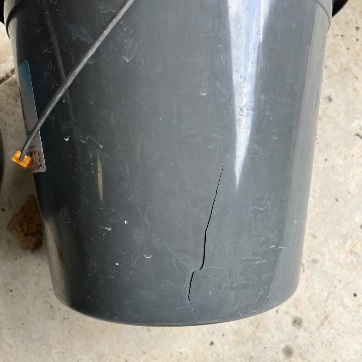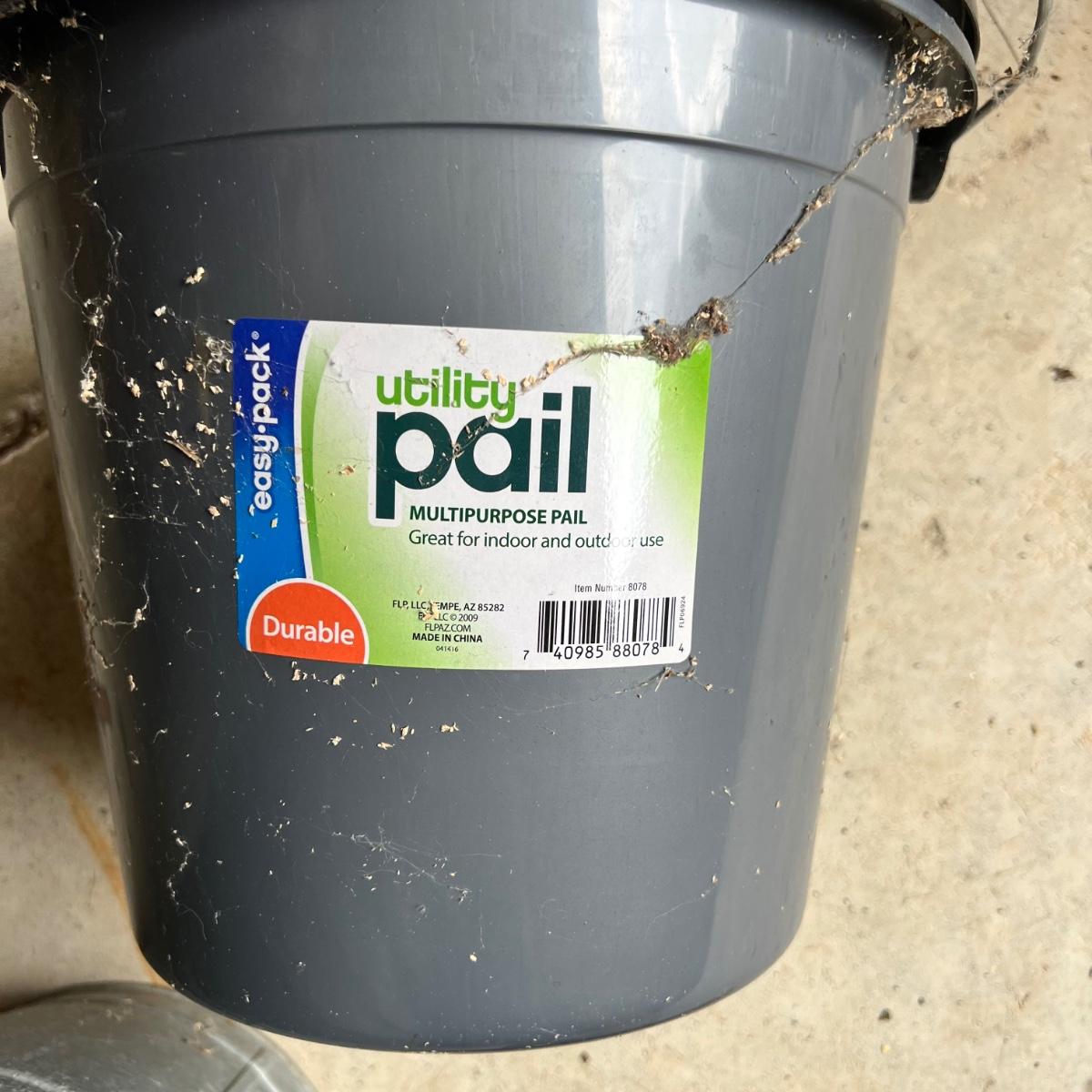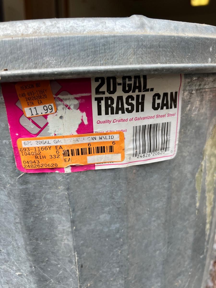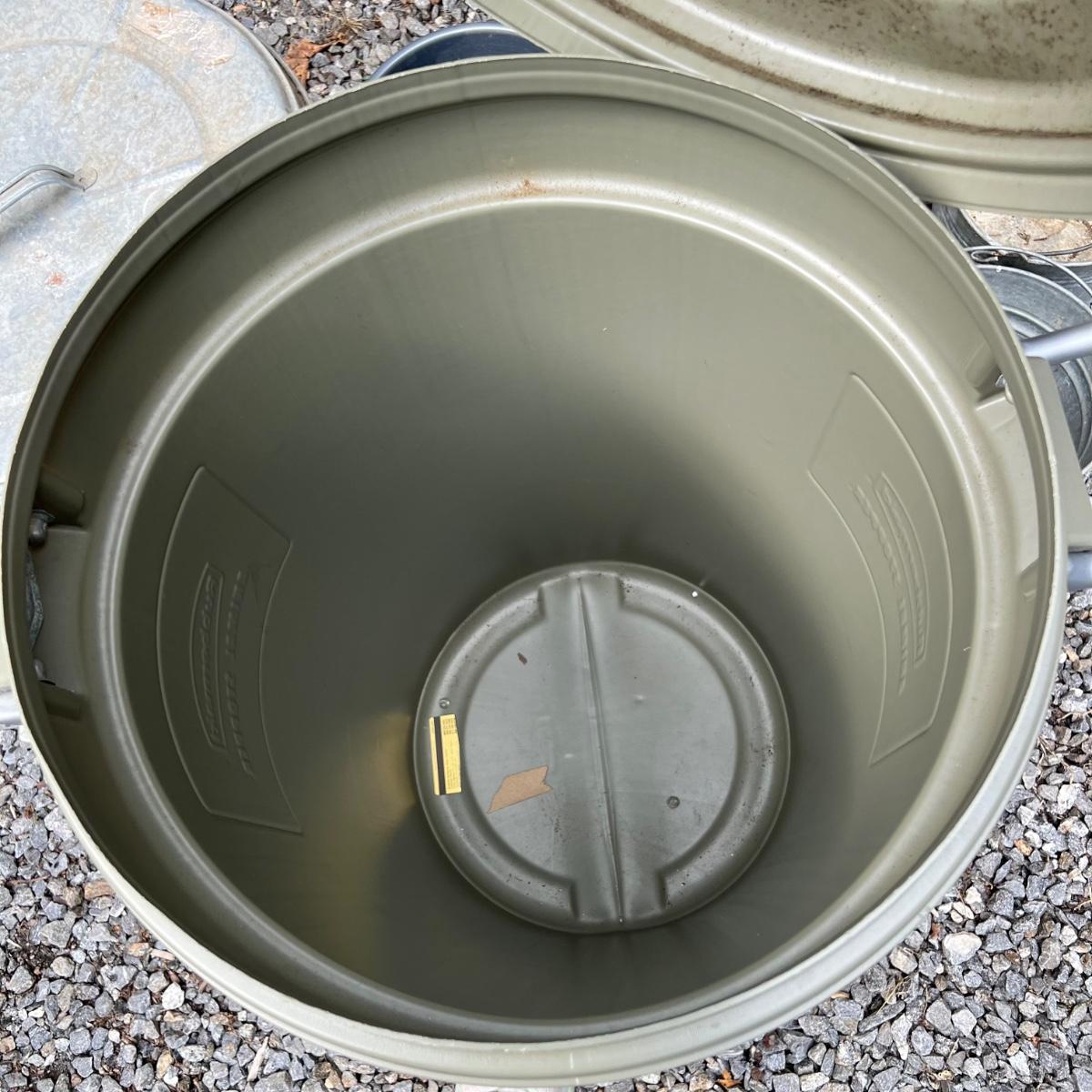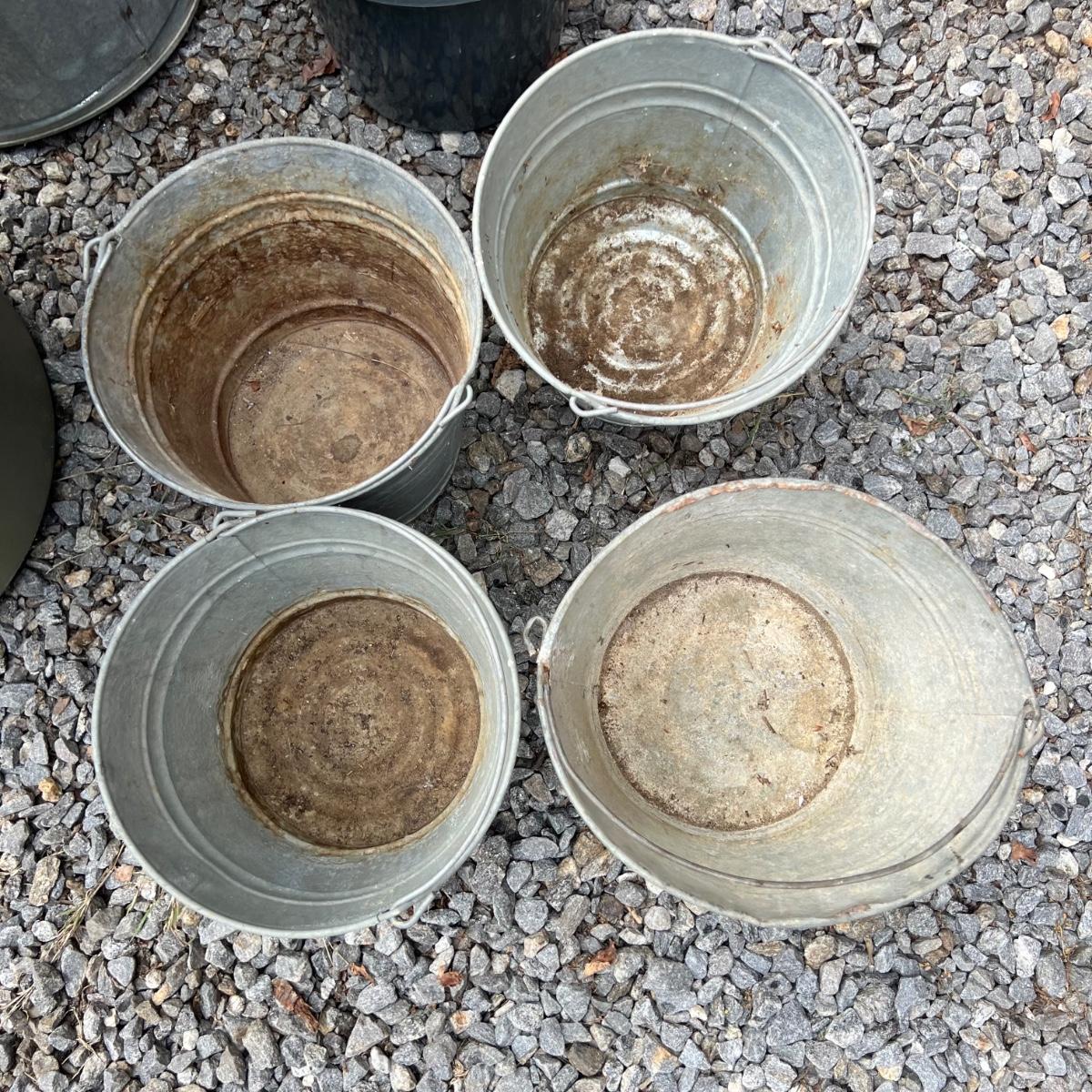 A Rubbermaid Animal Stopper 31.9 gallon garbage can and a 20 gallon metal trash can. Also two plastic pails as well as 4 metal pails with handles. All items have been used. One of smaller plastic pails with a handle has a crack on the outside - see pictures included.