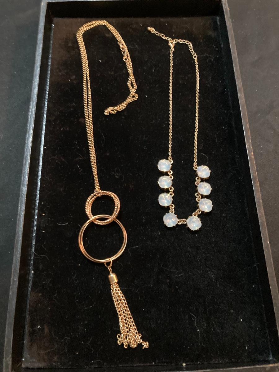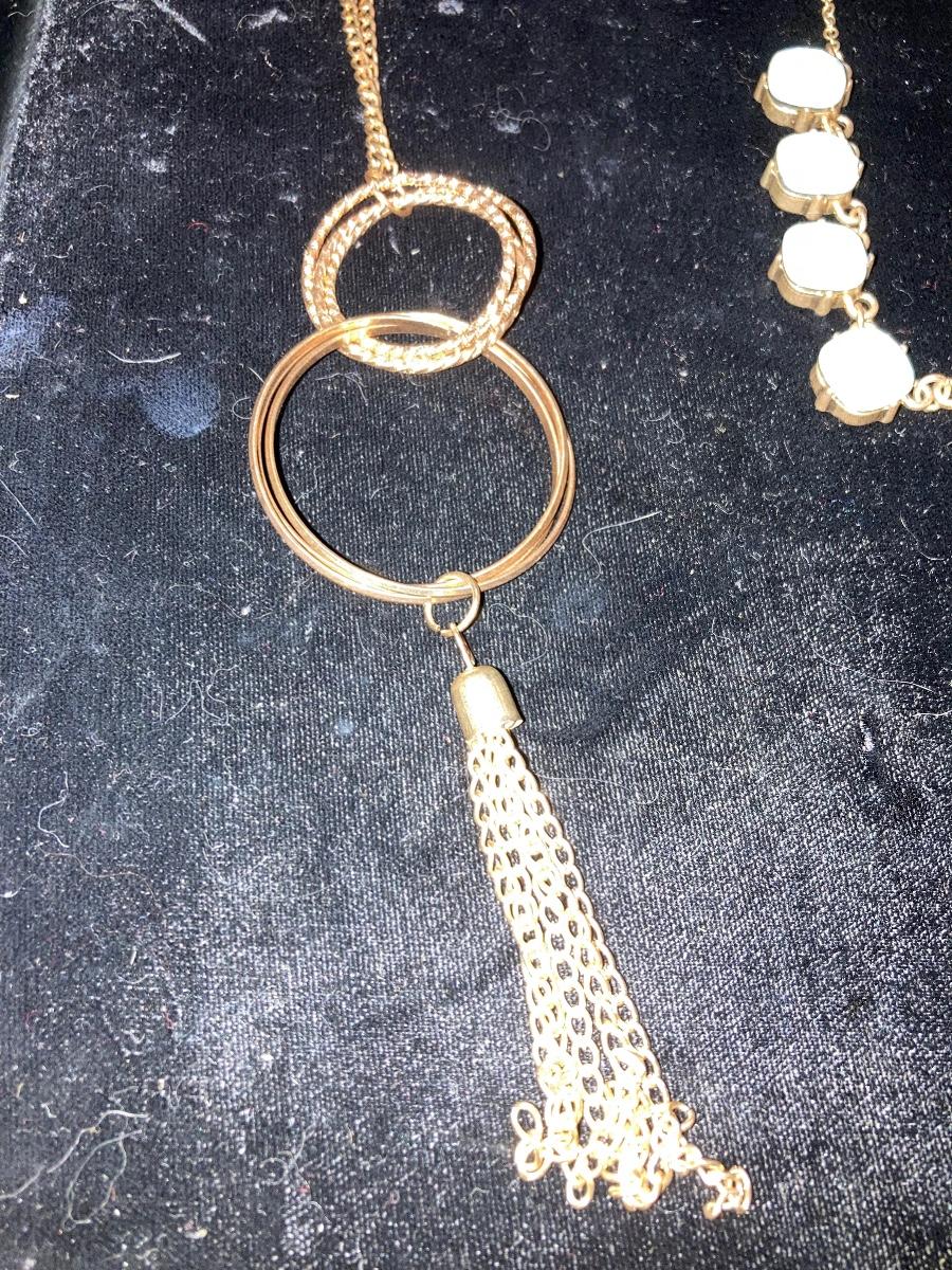 Two Large Gold Tone Necklaces with Hoops and Stones