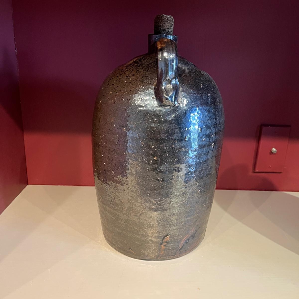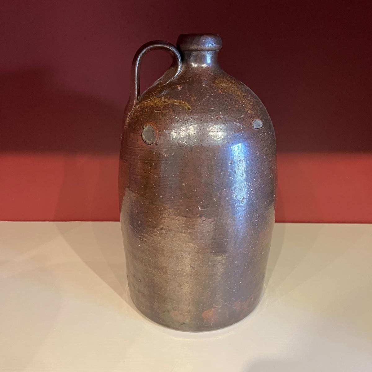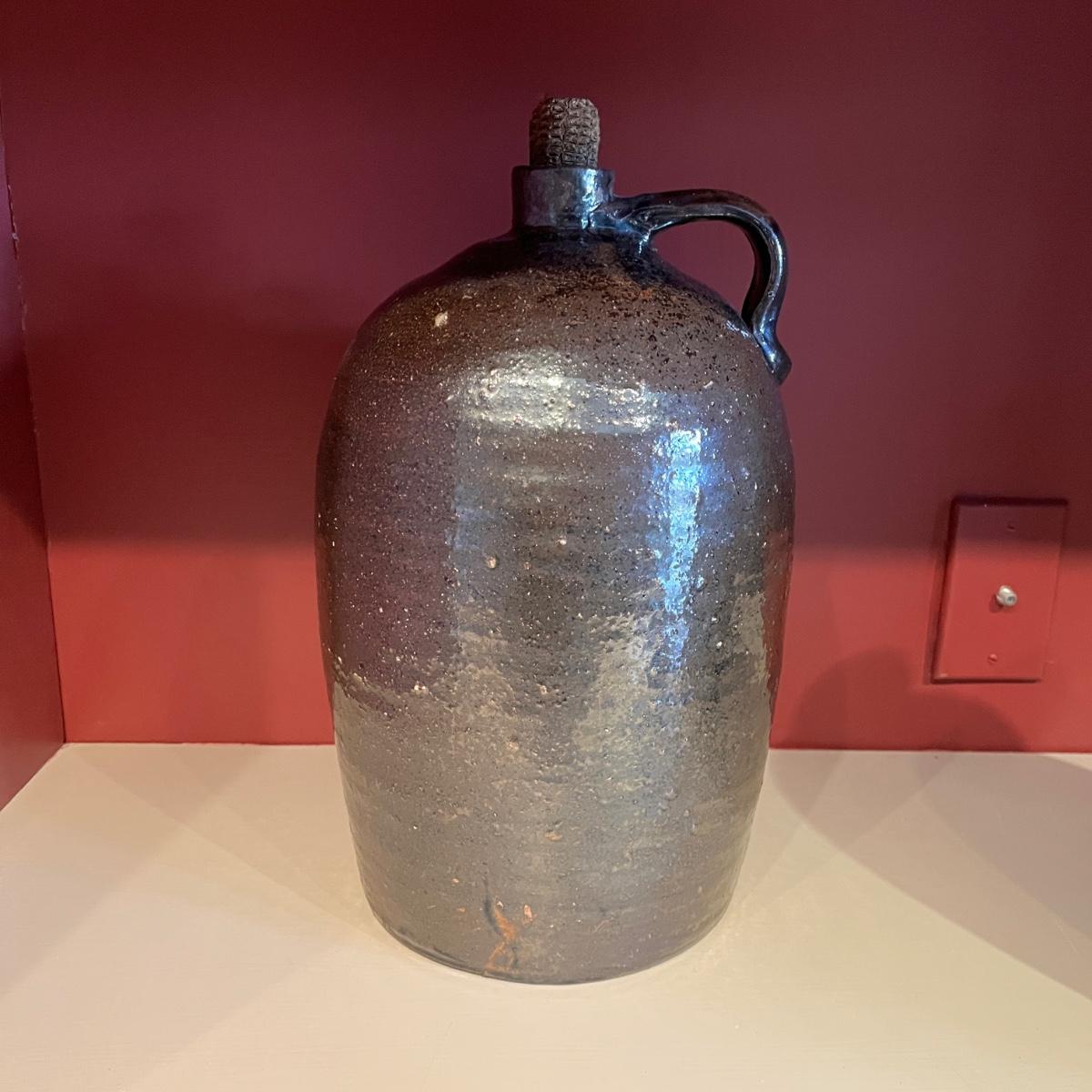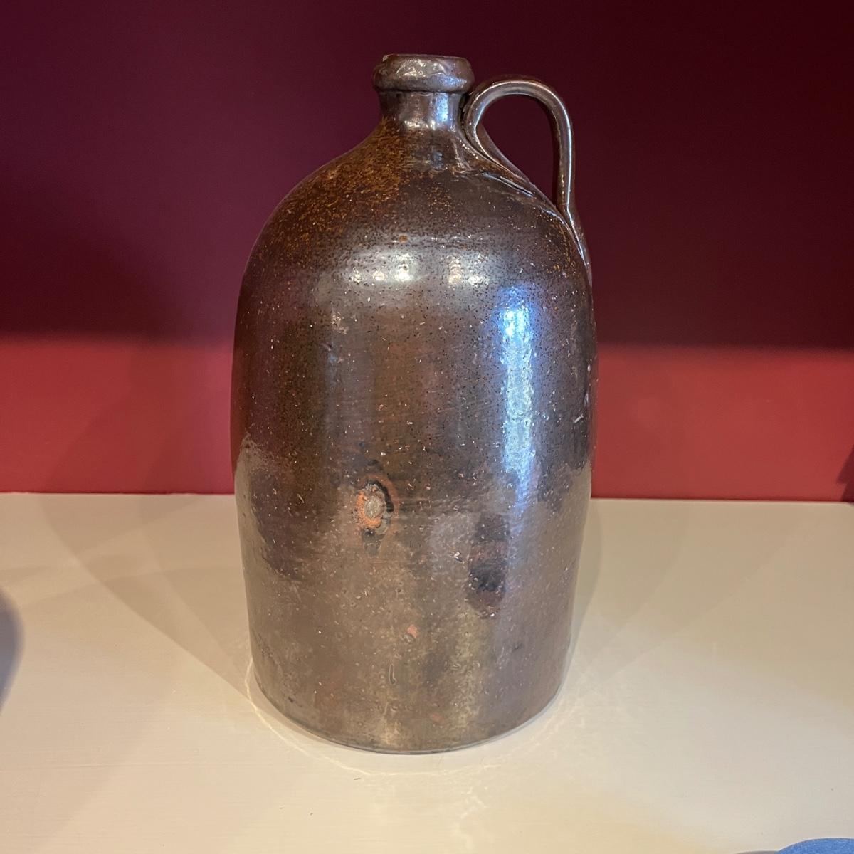 Lot contains a two gallon Ironstone pottery jug with corn cob top and a smaller Ironstone jug. Two gallon jug measures 8”D x 14”H.