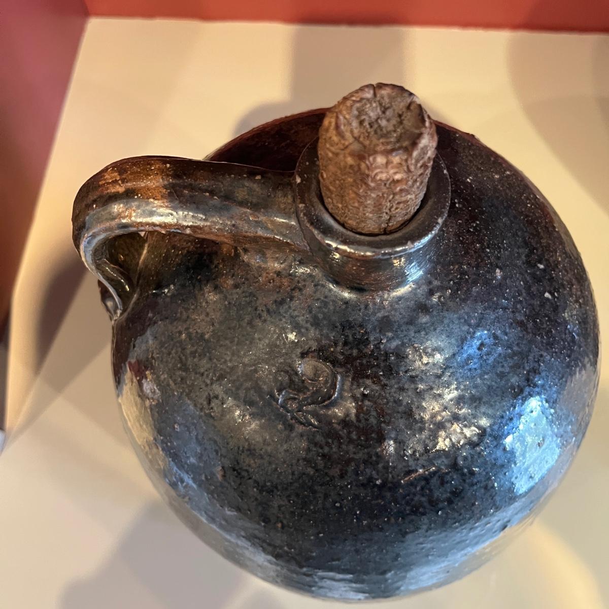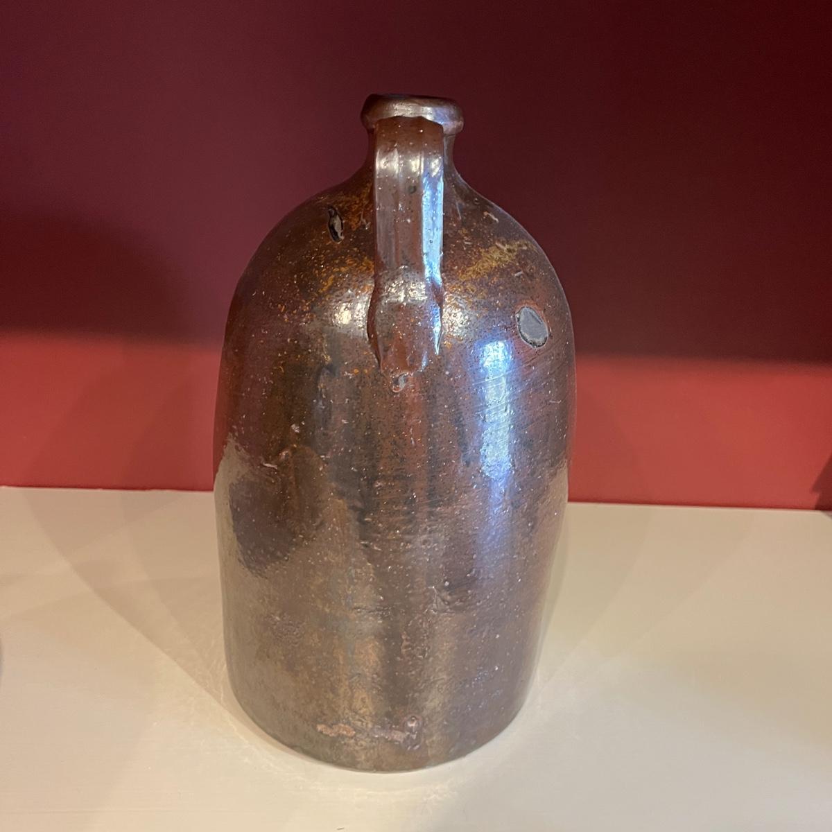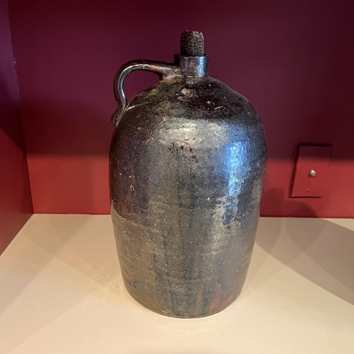 Lot contains a two gallon Ironstone pottery jug with corn cob top and a smaller Ironstone jug. Two gallon jug measures 8”D x 14”H.