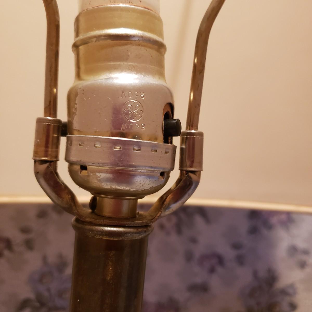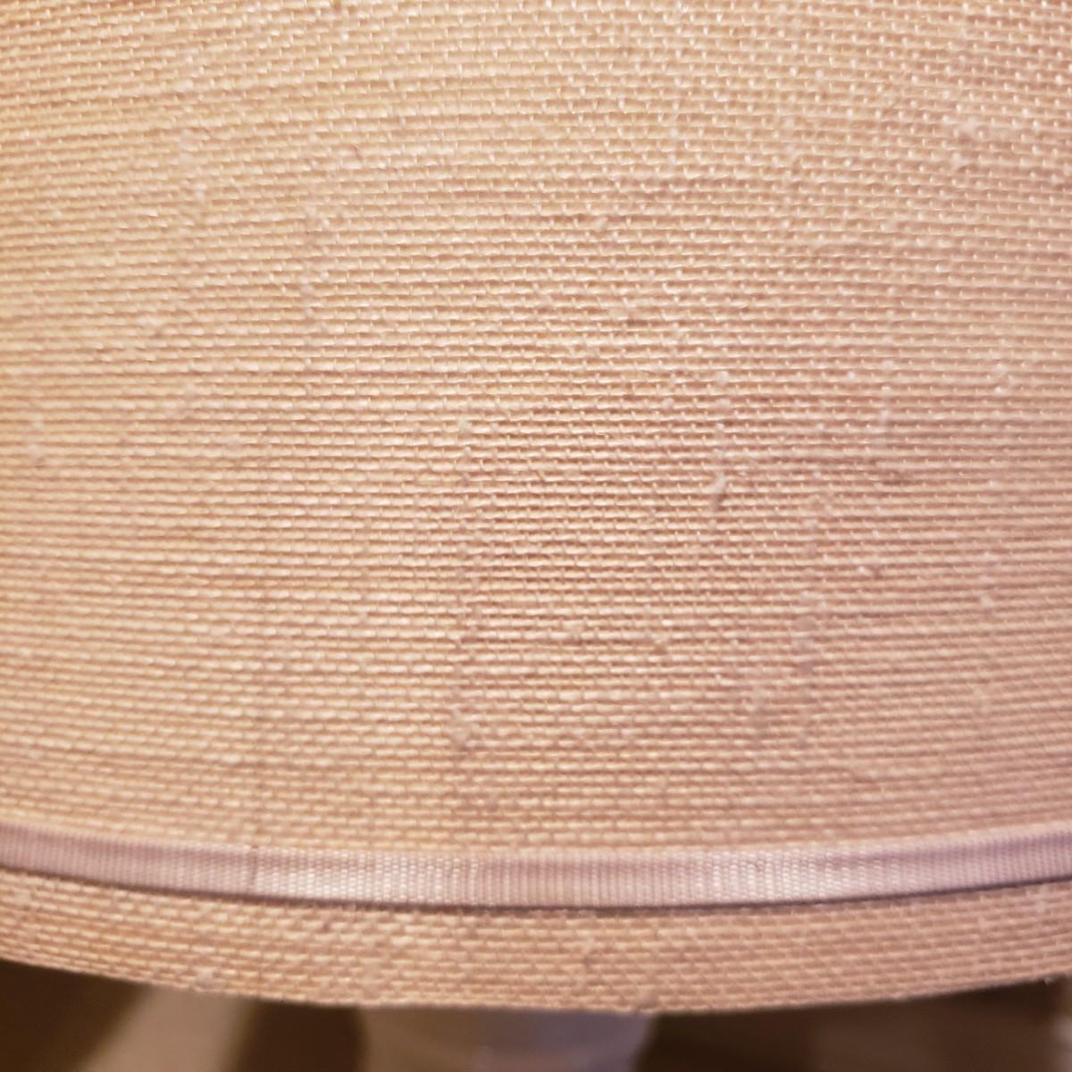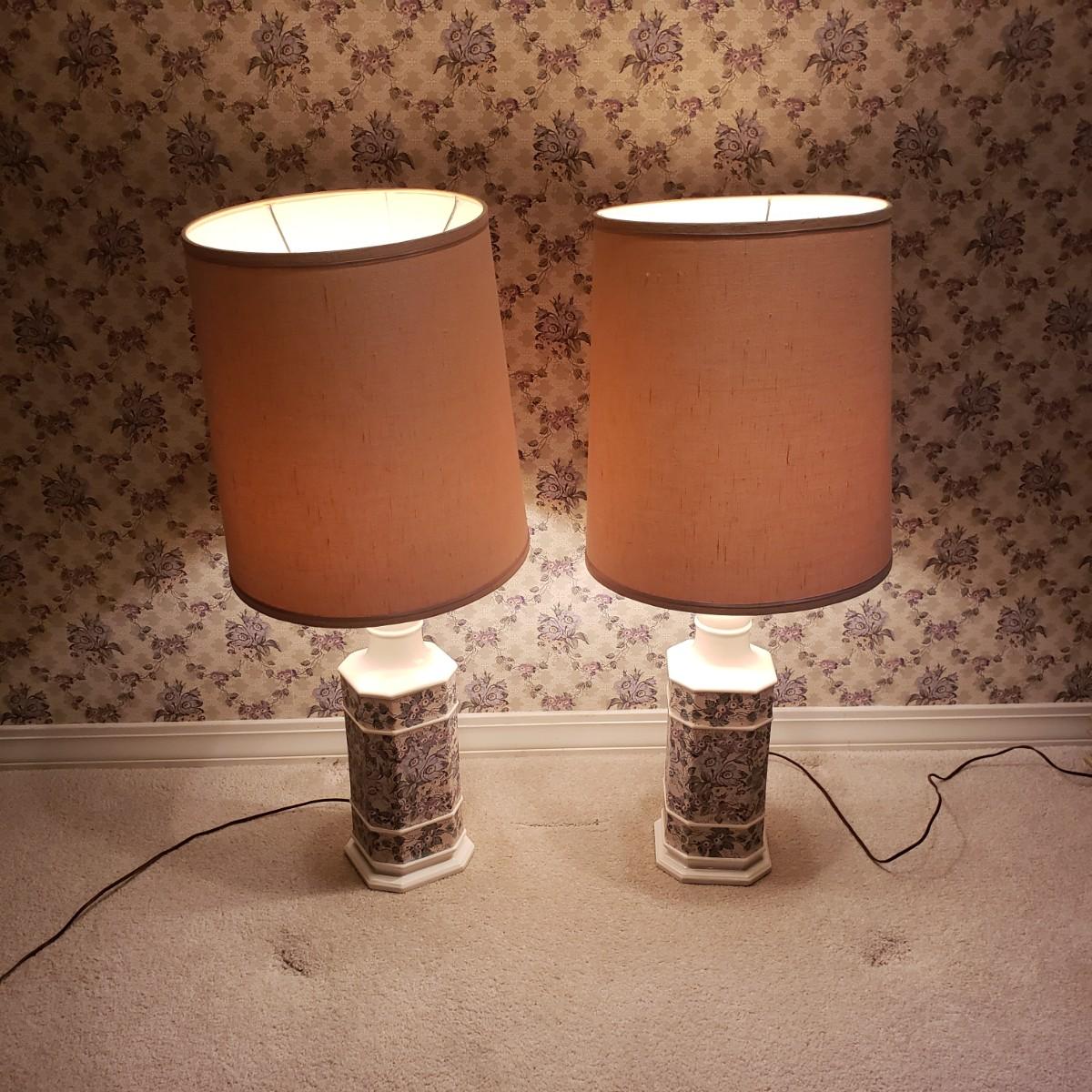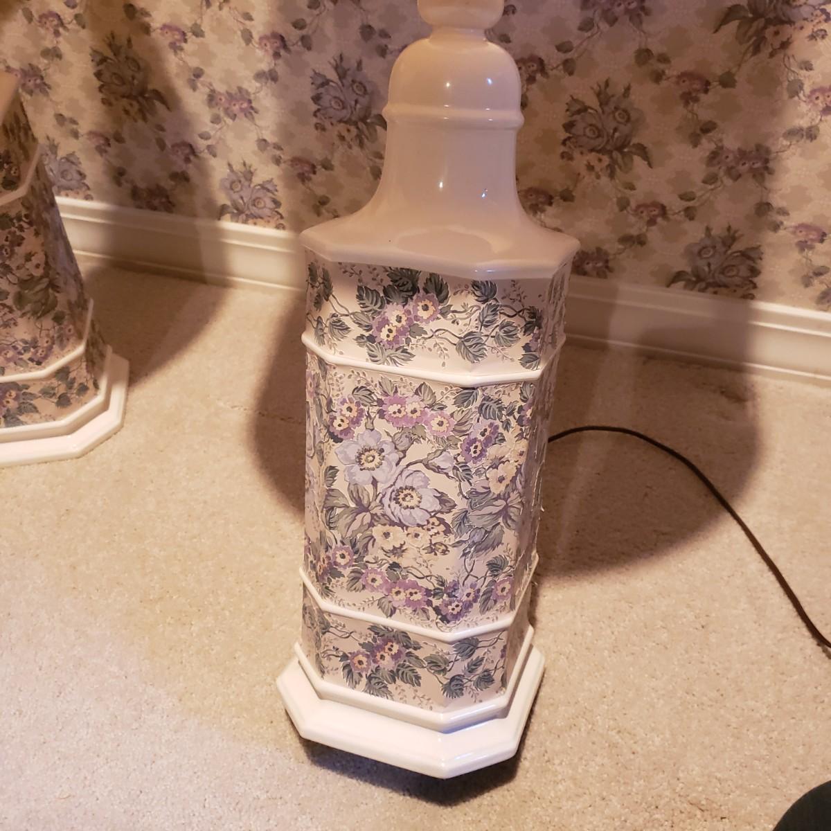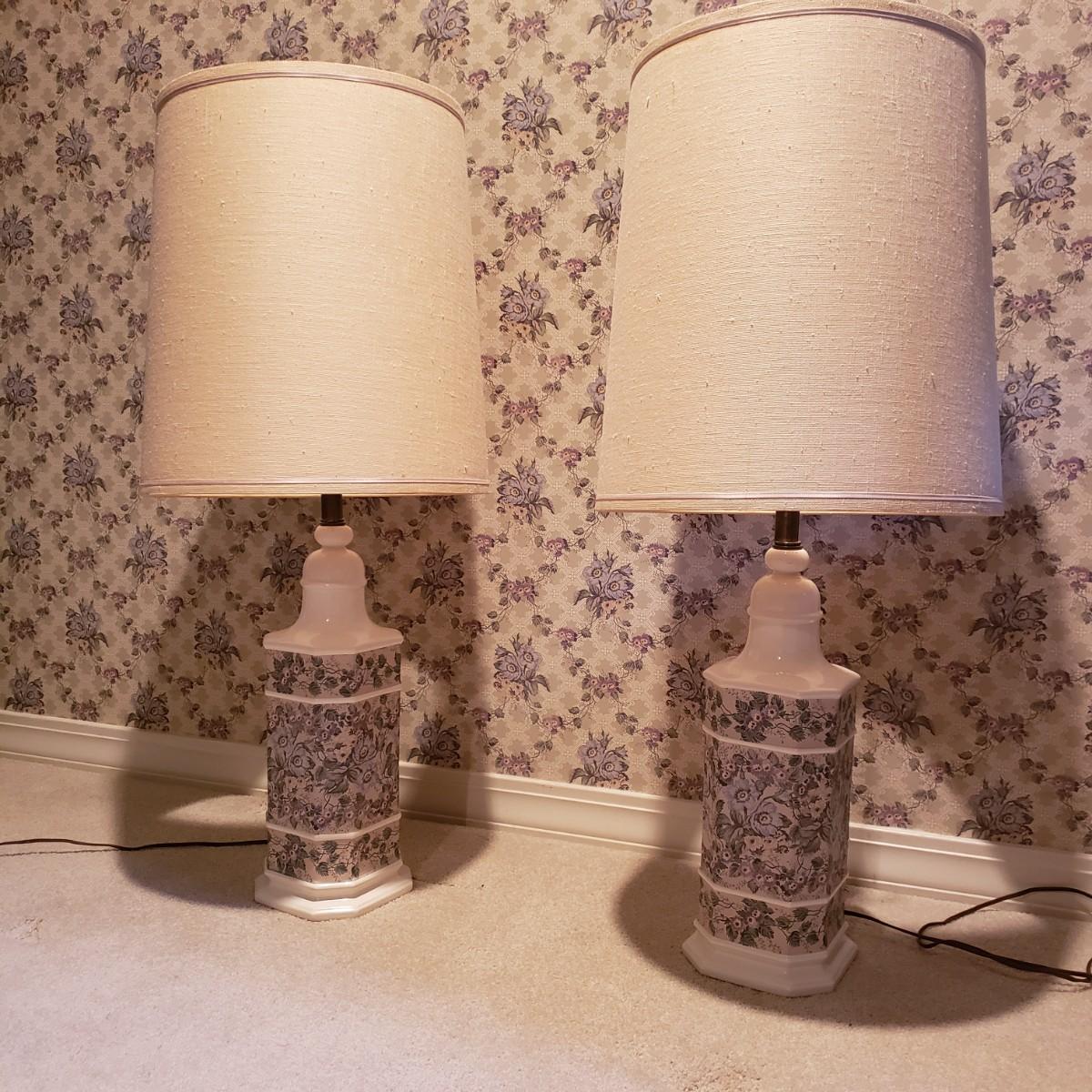 These two large matching white ceramic lamps (7" x 39"H) have what appears to be a decoupage floral print. Both lamps powered on when plugged in. One lamp has a three way switch, while the other has a push on and off switch. The lamp shades (14"D x 18"H) are a tweed like material with a satin ribbon around the top and bottom edges.