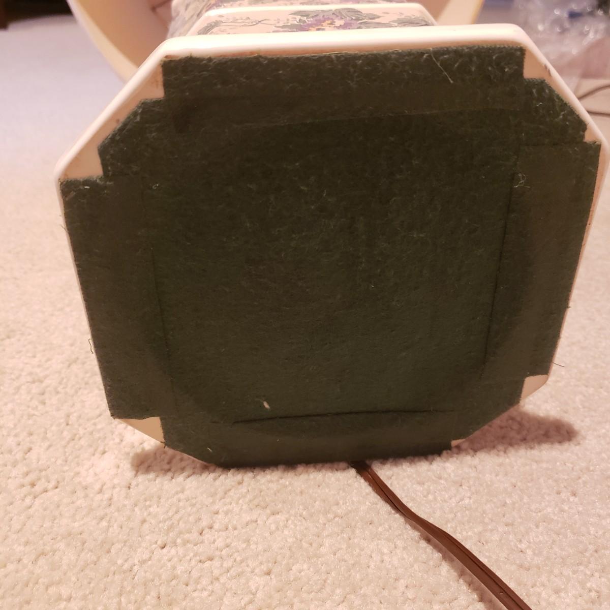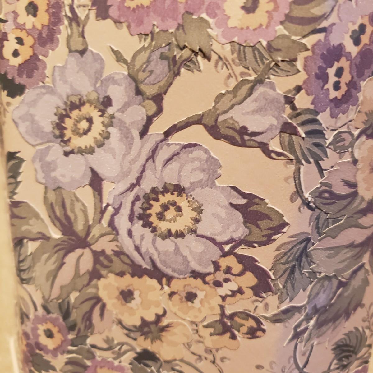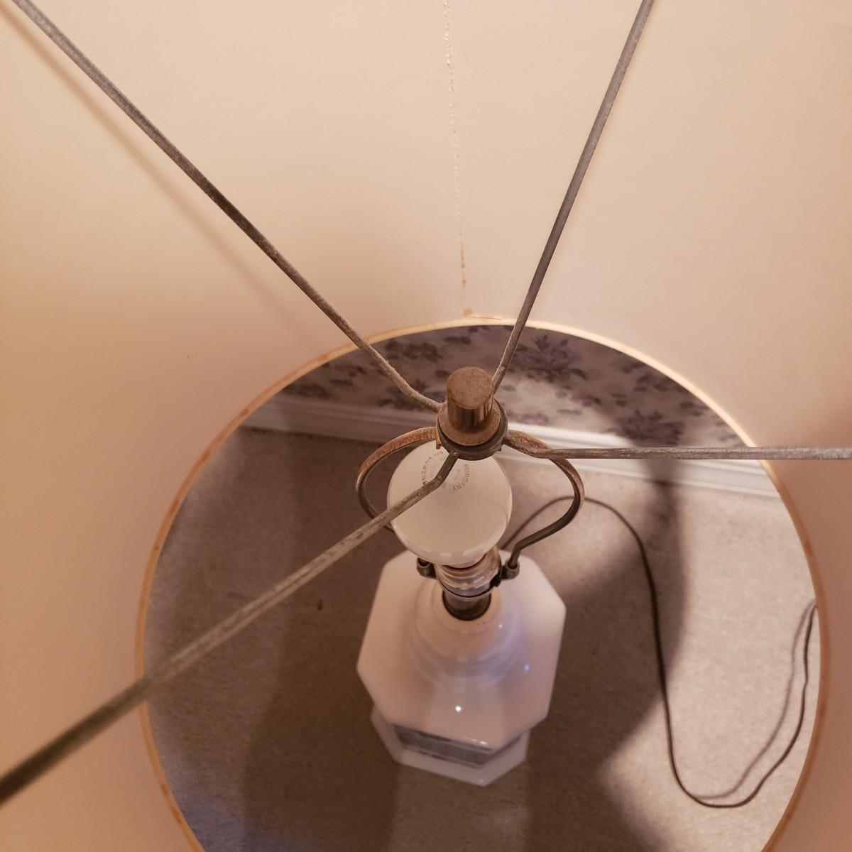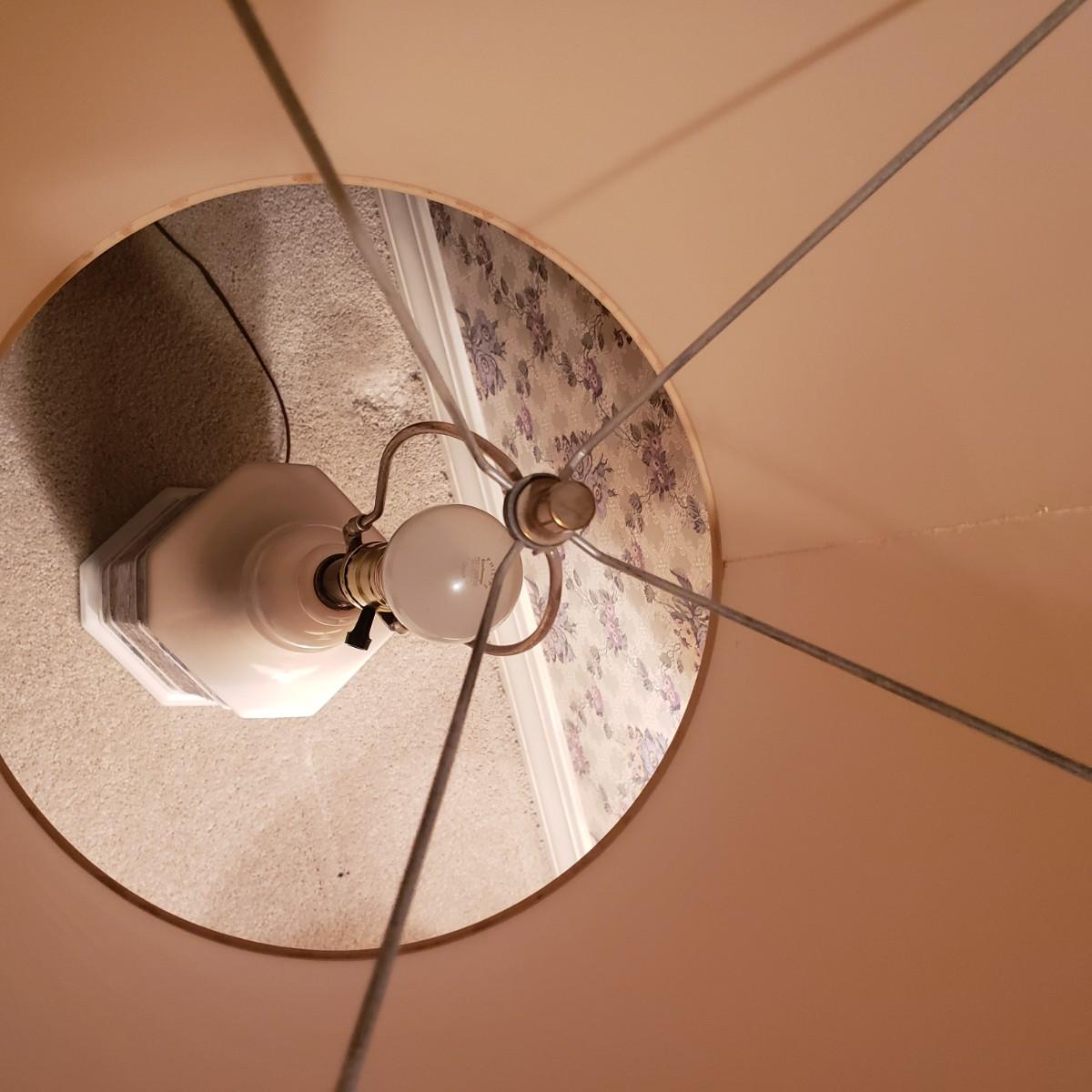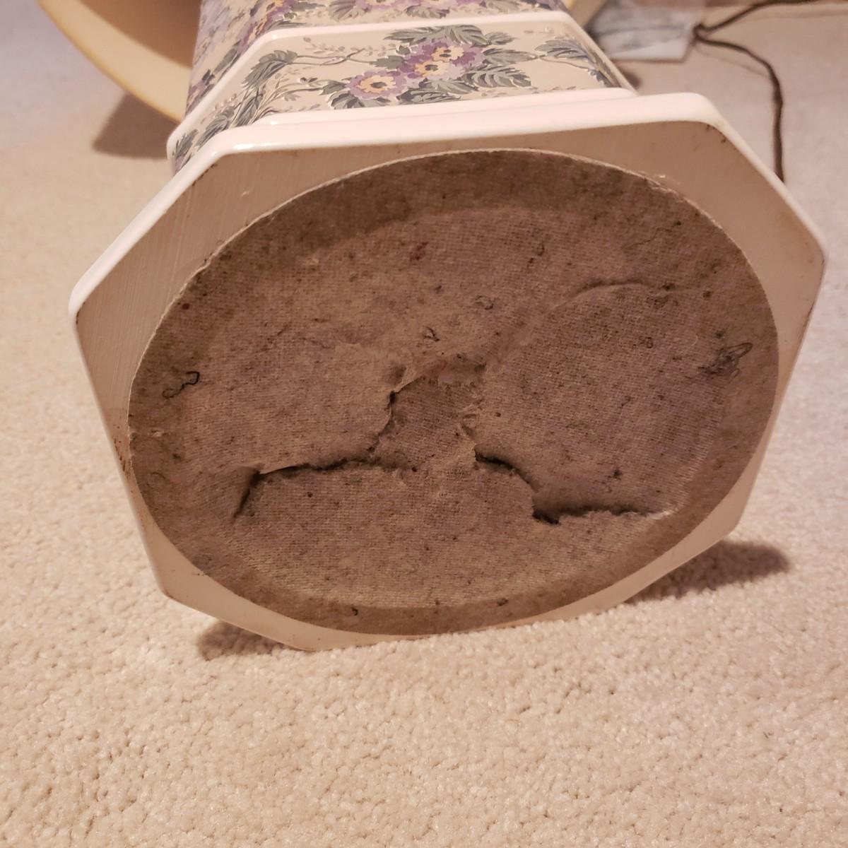 These two large matching white ceramic lamps (7" x 39"H) have what appears to be a decoupage floral print. Both lamps powered on when plugged in. One lamp has a three way switch, while the other has a push on and off switch. The lamp shades (14"D x 18"H) are a tweed like material with a satin ribbon around the top and bottom edges.