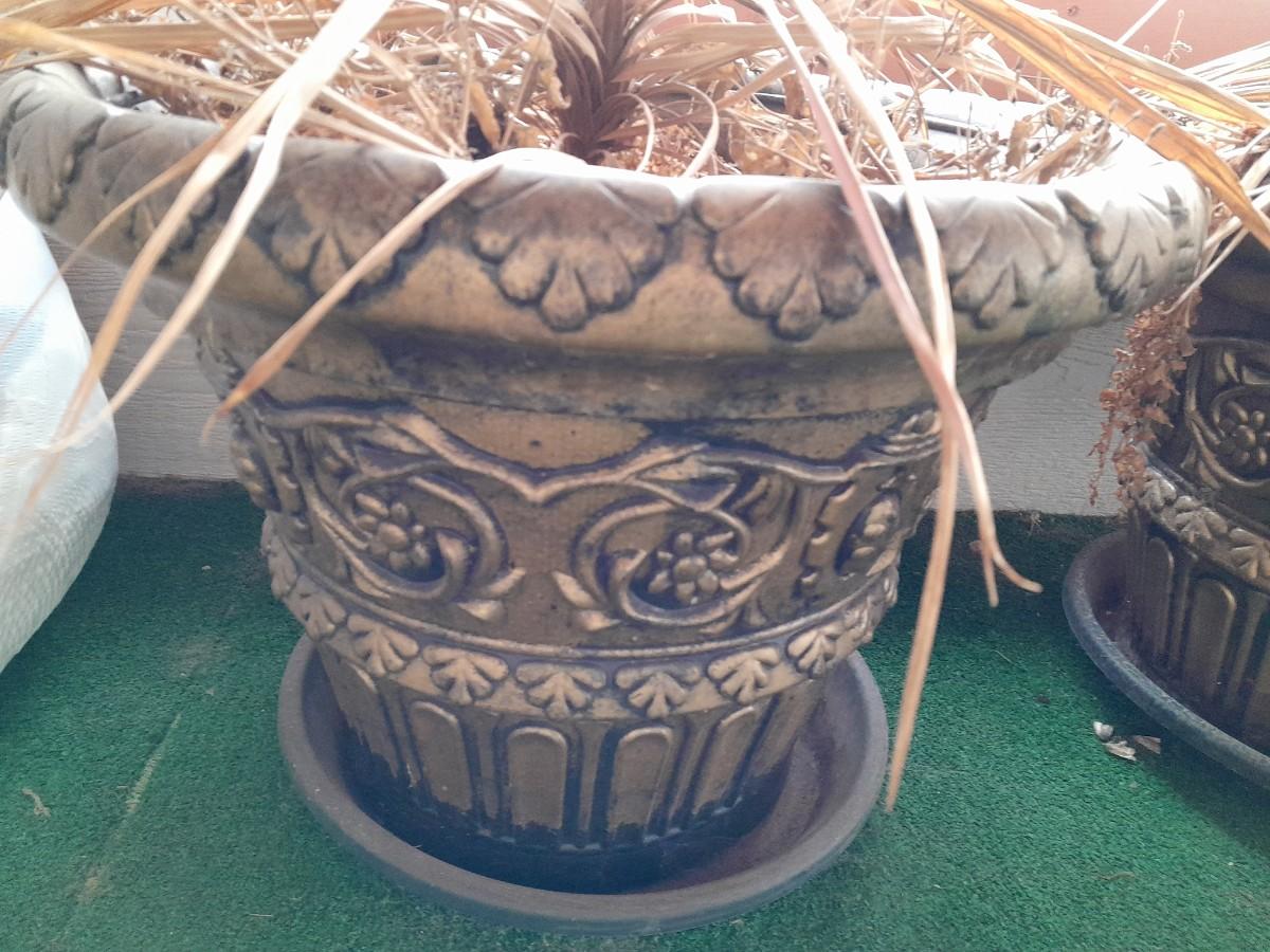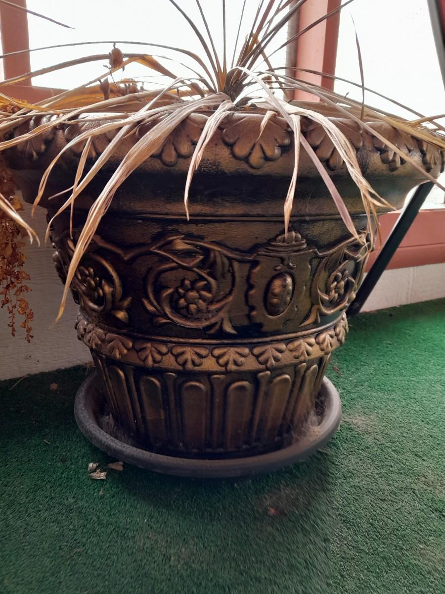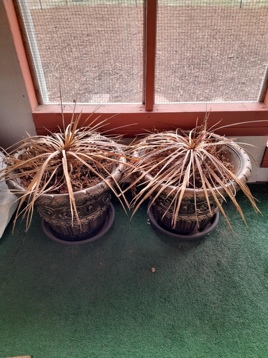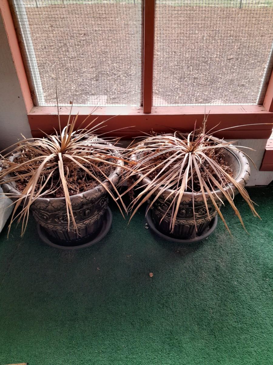 TWO LARGE PLASTIC MATCHING FLOWERPOTS WITH DRIED FOLLIAGE ARRANGEMENTS ˜†