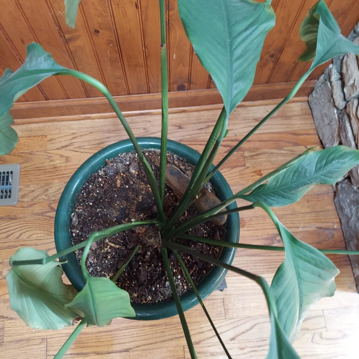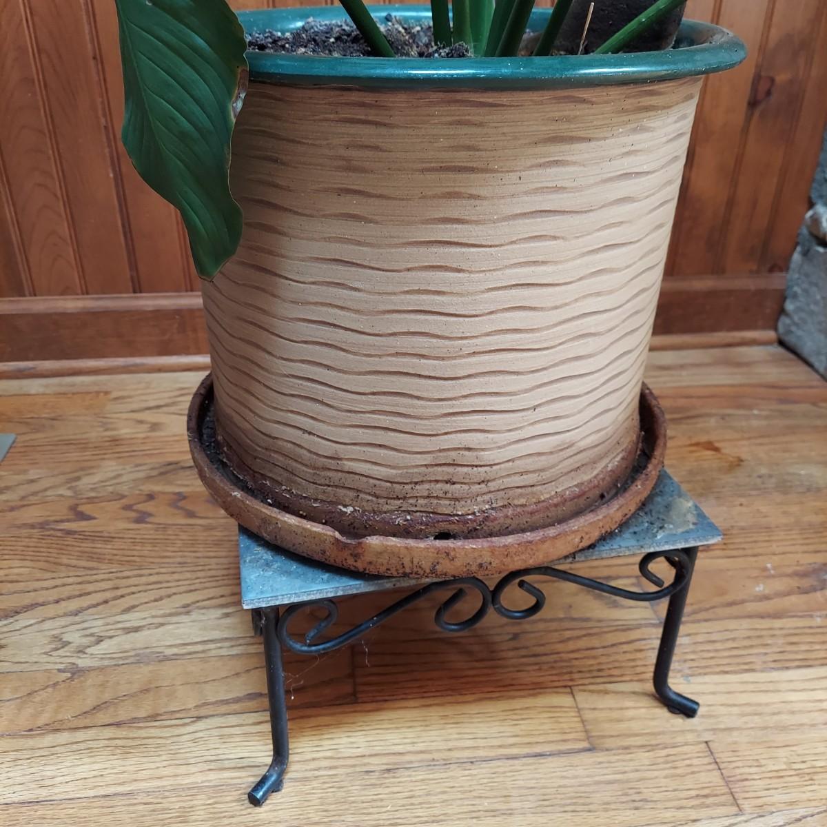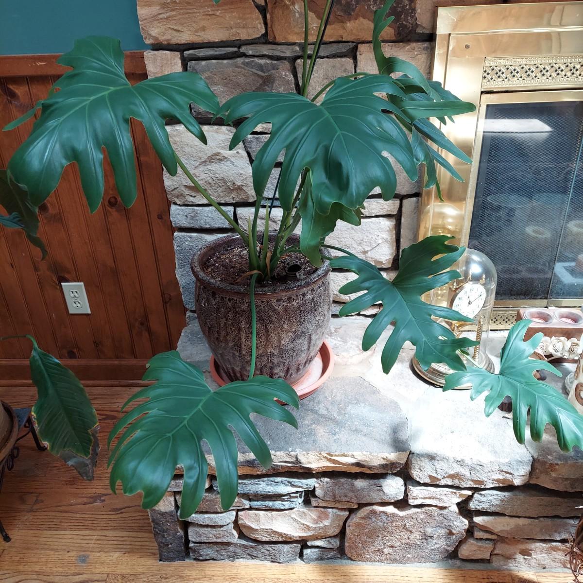 Two large tropical house plants in ceramic pots. The largest plant appears to be a Philodendron variety and is approximately 40" tall. The other appears to be a Peace Lily that's 35" tall. The Lily is on a wrought iron stand. Local Pickup Only.