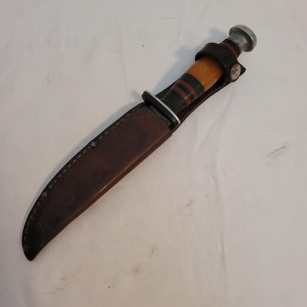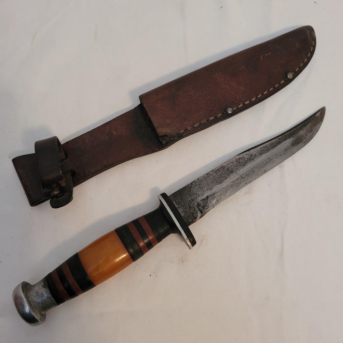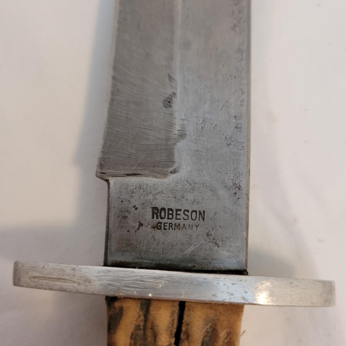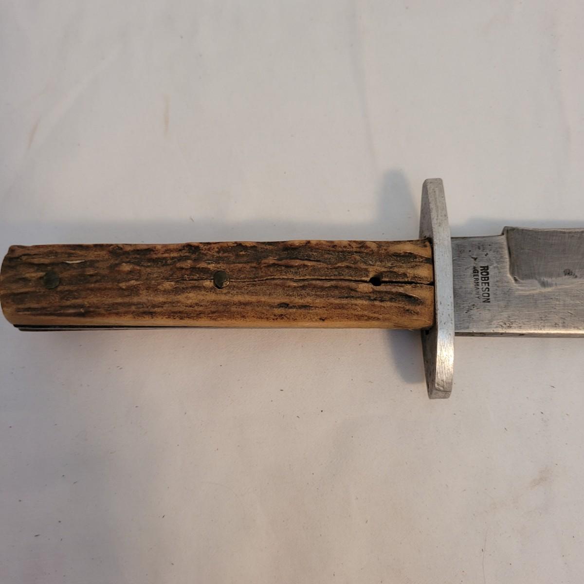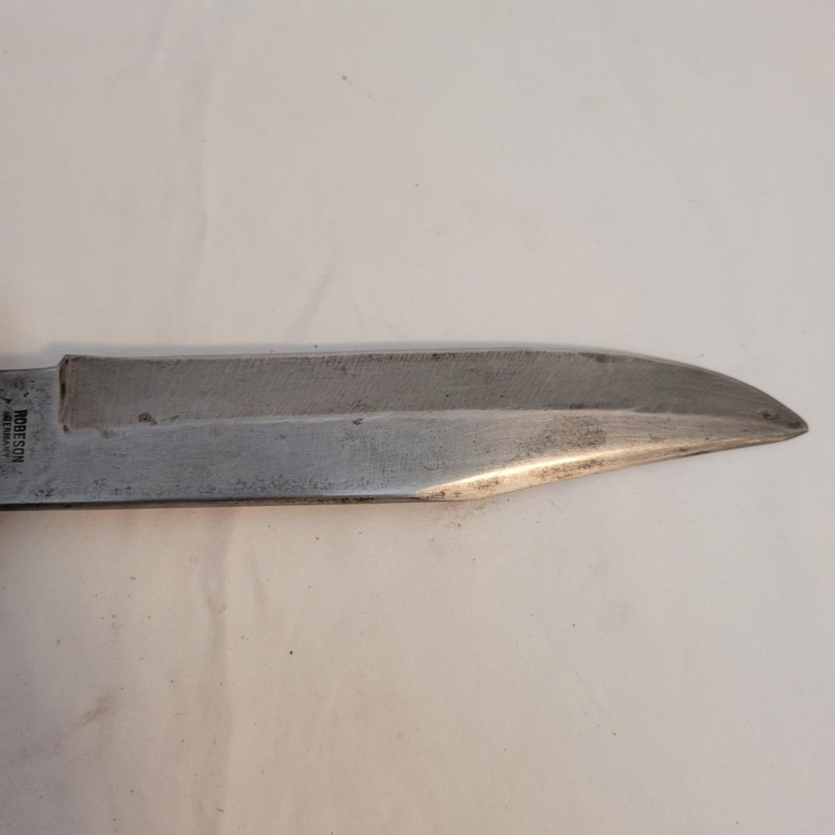This lot includes two large hunting or fishing Knives. The larger knife has a wooden handle and leather holster. The blade is made from solid steel and bears the mark of Robeson of Germany. It measures just under 12" in length. The second knife has a multicolored wood and steel handle and leather holster. It does not appear to have a makers mark. It measures 9" in length.
