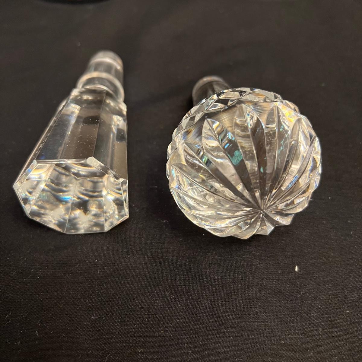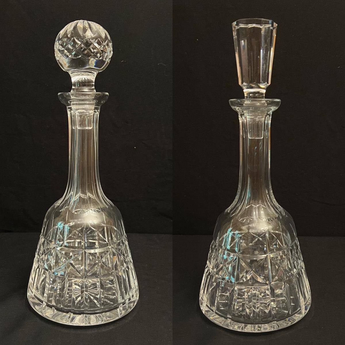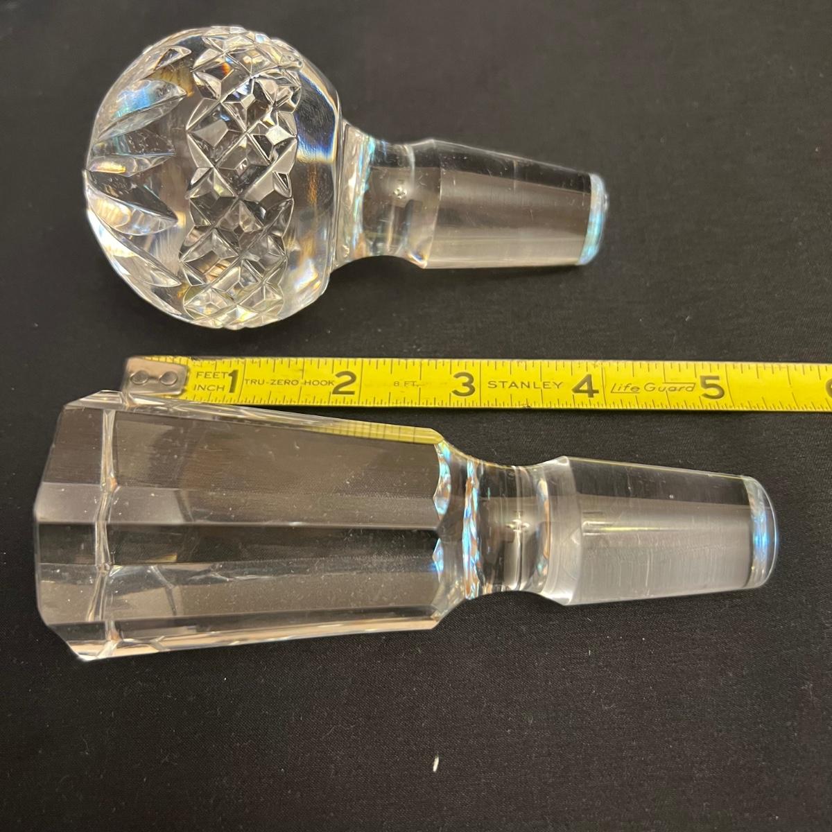 These two tall Waterford crystal decanters appear to be their Kylemore design with different stopper tops. The matching bodies measure 5”D (base) x 10”H. See image for measurements for stoppers.