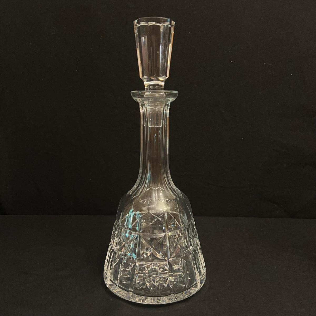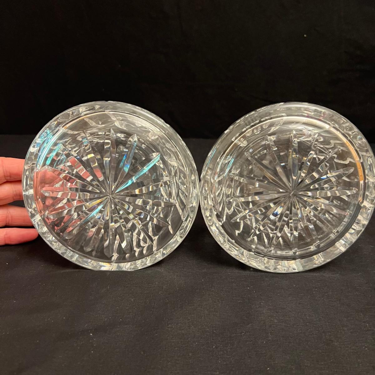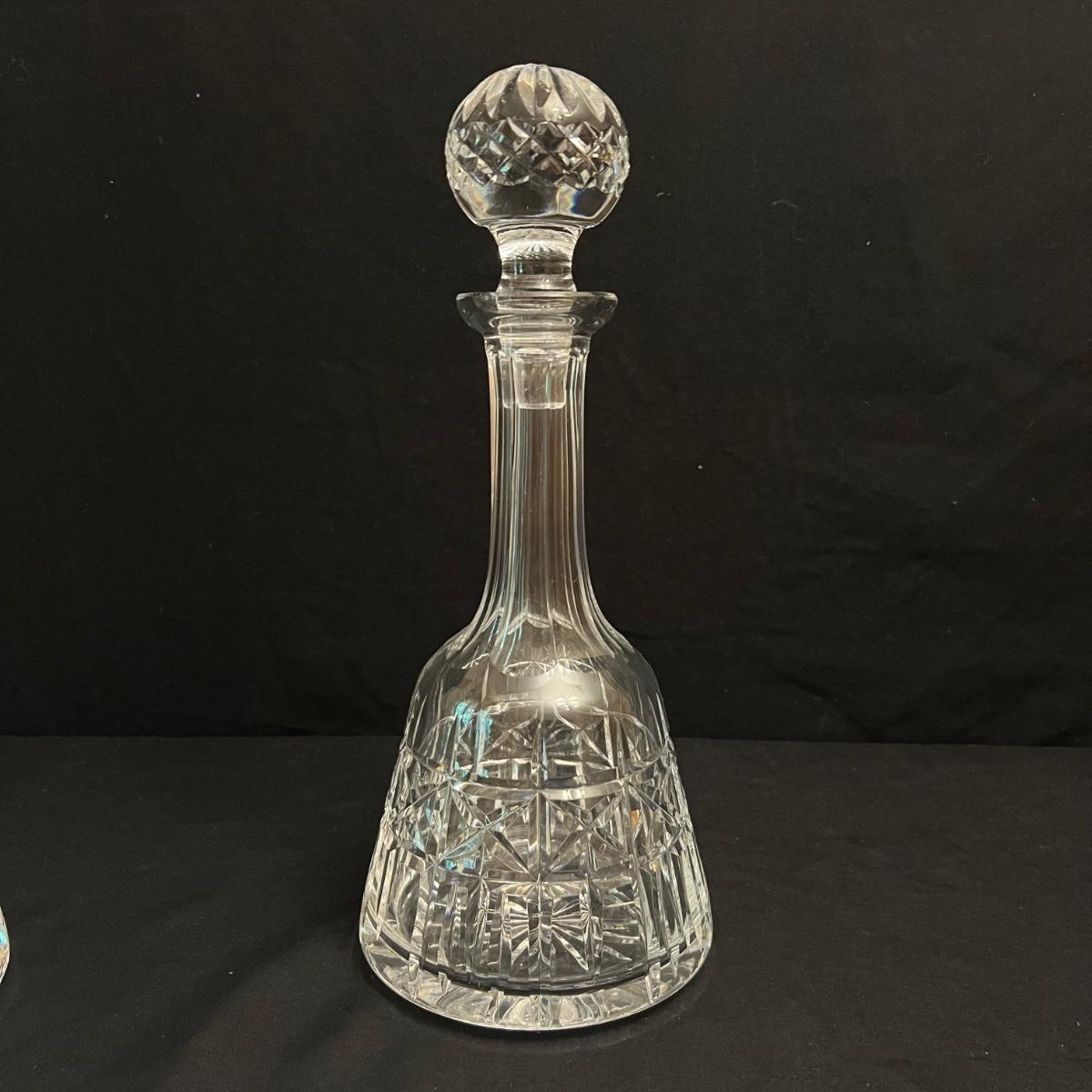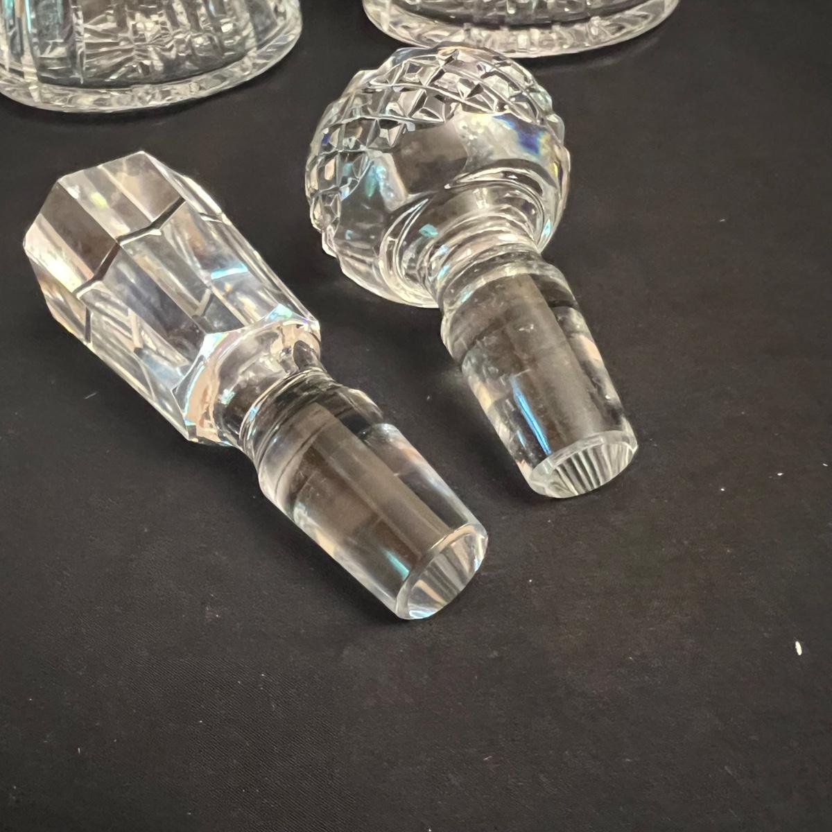 These two tall Waterford crystal decanters appear to be their Kylemore design with different stopper tops. The matching bodies measure 5”D (base) x 10”H. See image for measurements for stoppers.