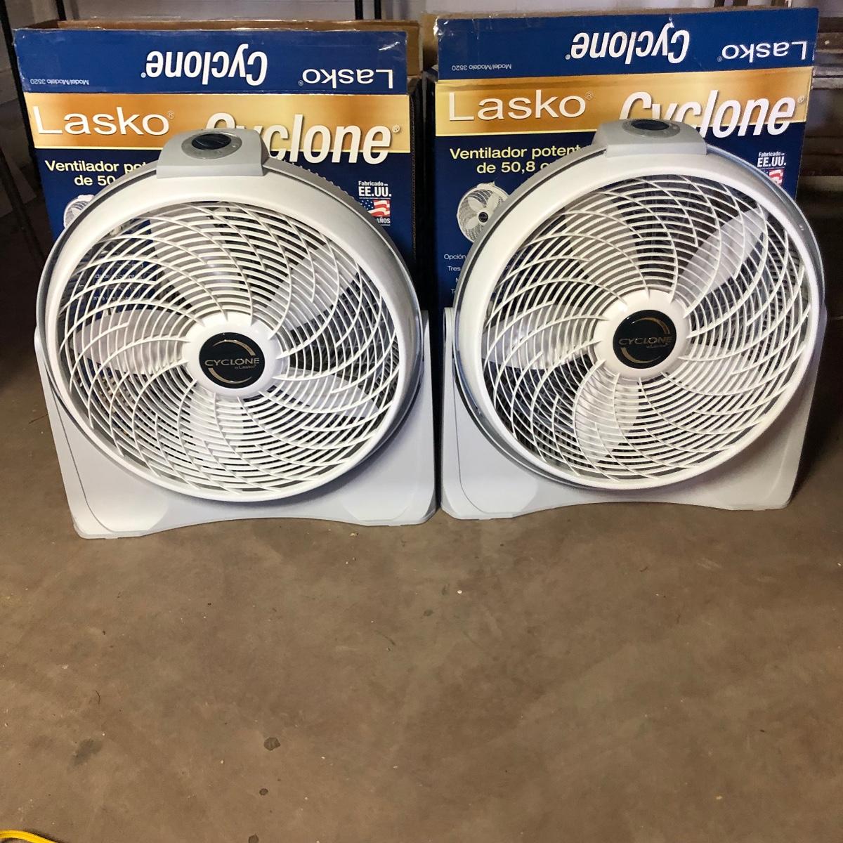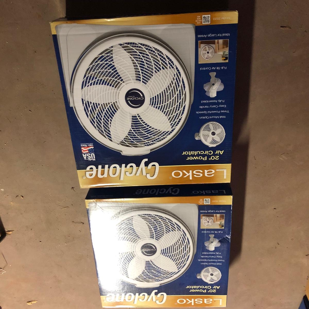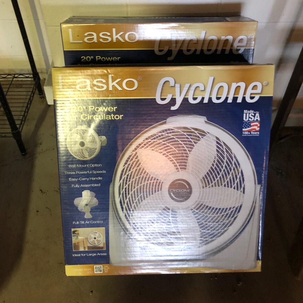 Lot includes two Lasko Cyclone 20” fans model # 3520. Both fans have box and worked when tested. Fans are wall mountable and have three speeds.