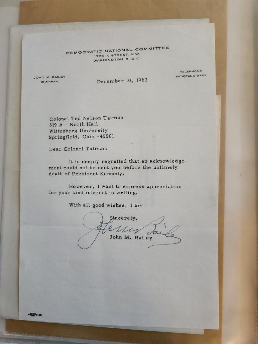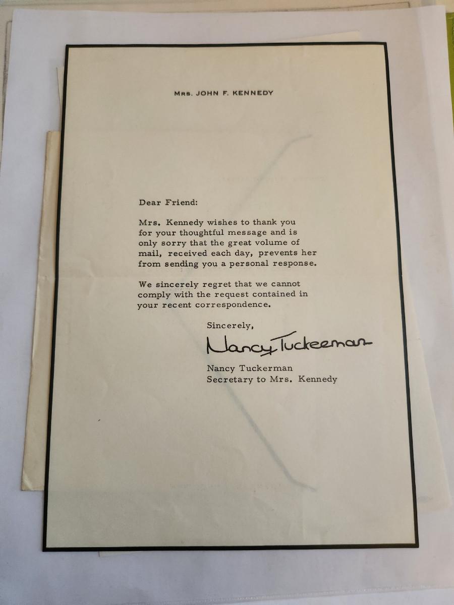 This auction lot is for Two Letters Regarding the Death of President John Kennedy. The first of these is a stock note sent to the thousand who had written to express their feelings - that letter is signed by a Secretary to Mrs. Kennedy, it comes with the franked envelope in which it was mailed. Also included in this lot is a letter from John Bailey - the Chairman of the Democratic National Committee, responding to a request prior to the President's death.