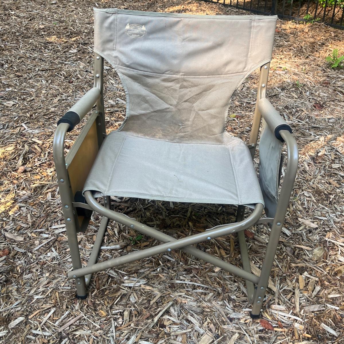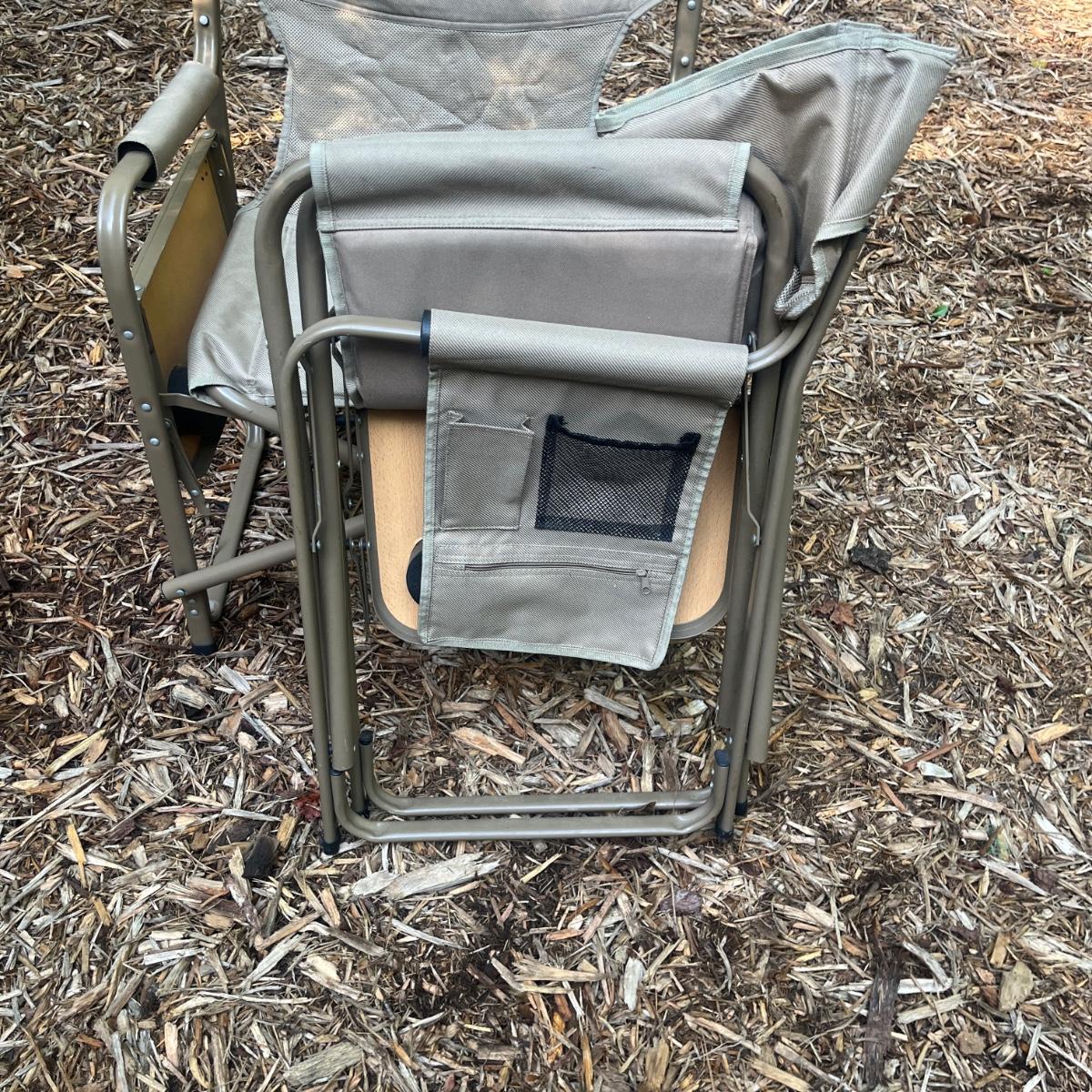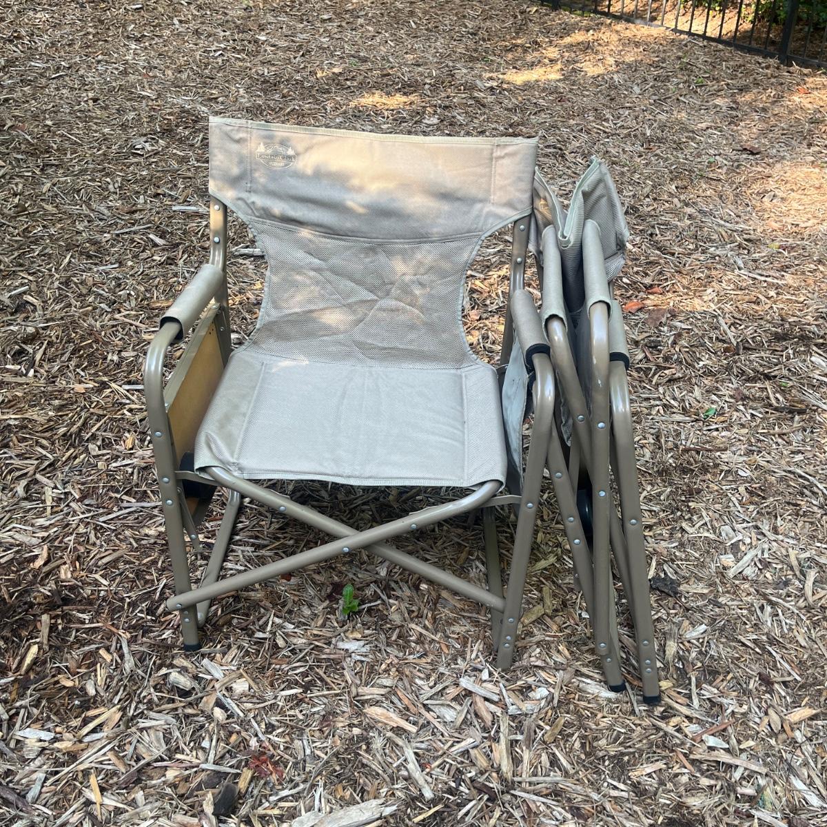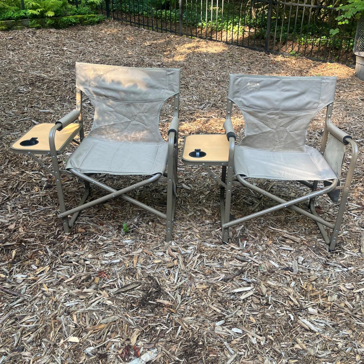 Lot includes two Lewis & Clark folding chairs with attached folding side table and storage bag. Chairs each measure 26” x 20” x 33”H with a 18” seat height when open. One side table has crack, see pictures.