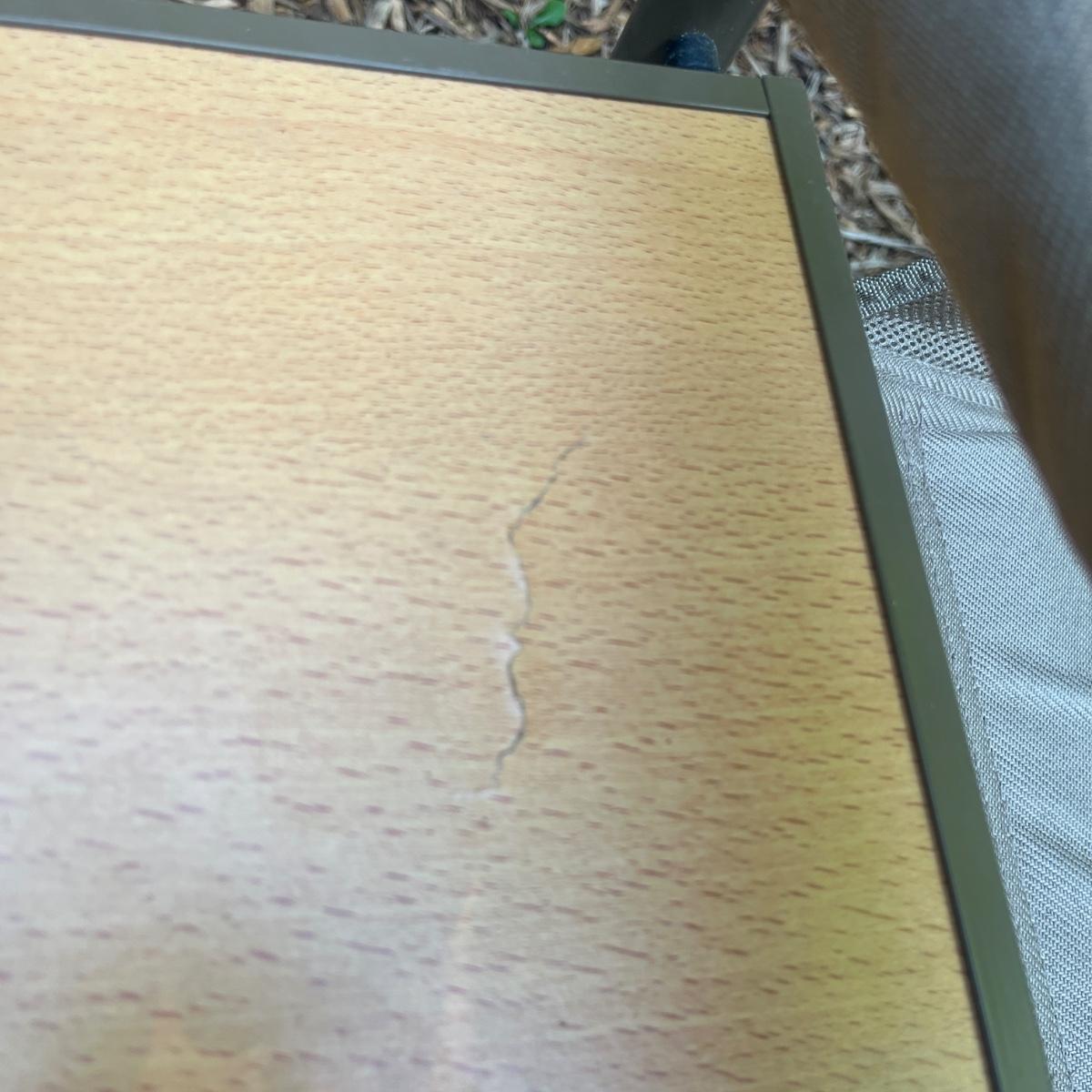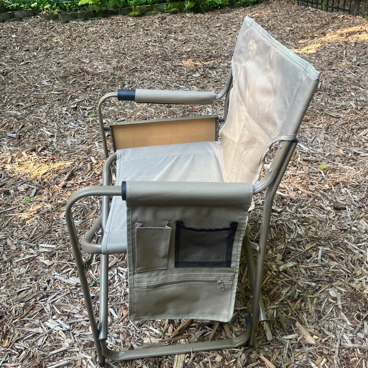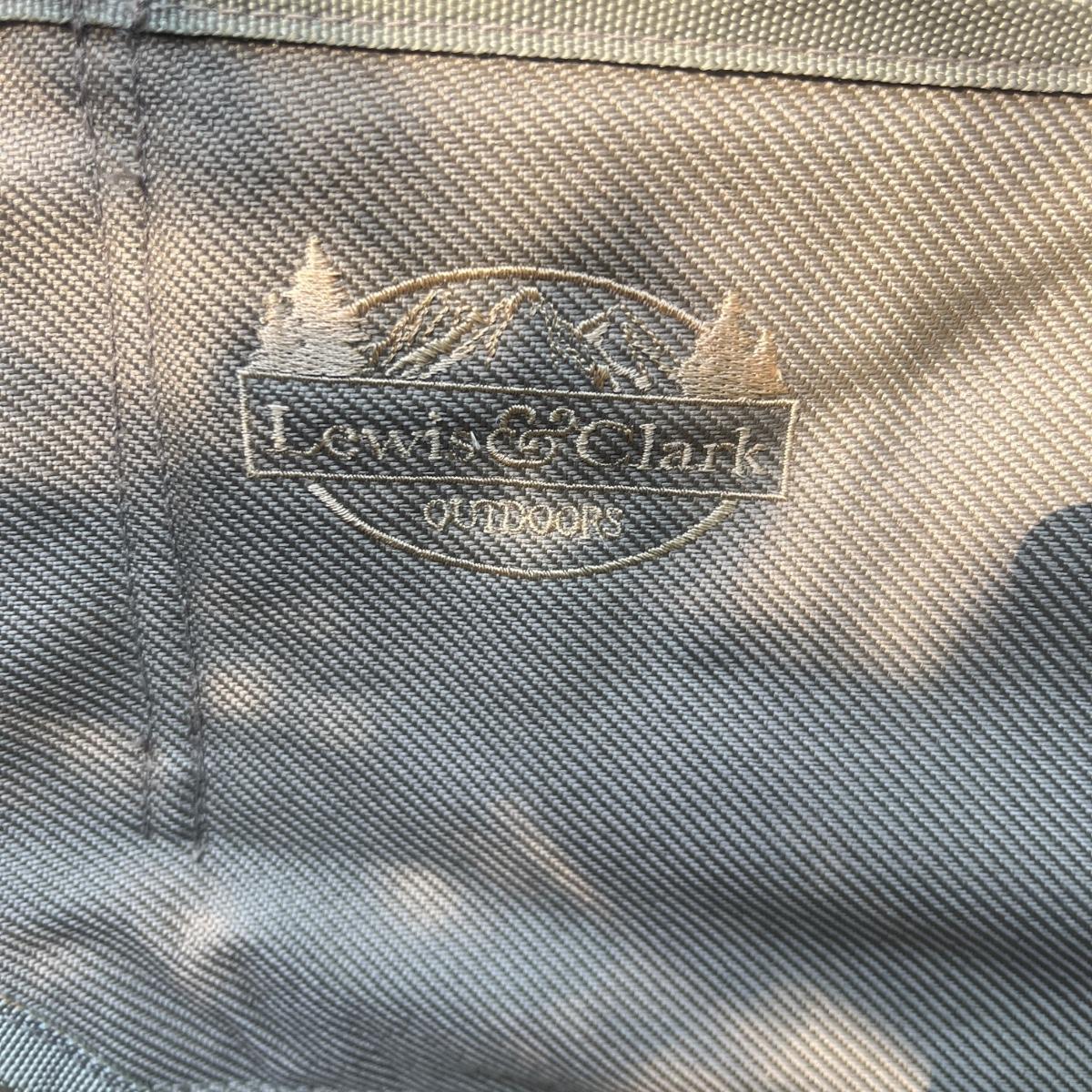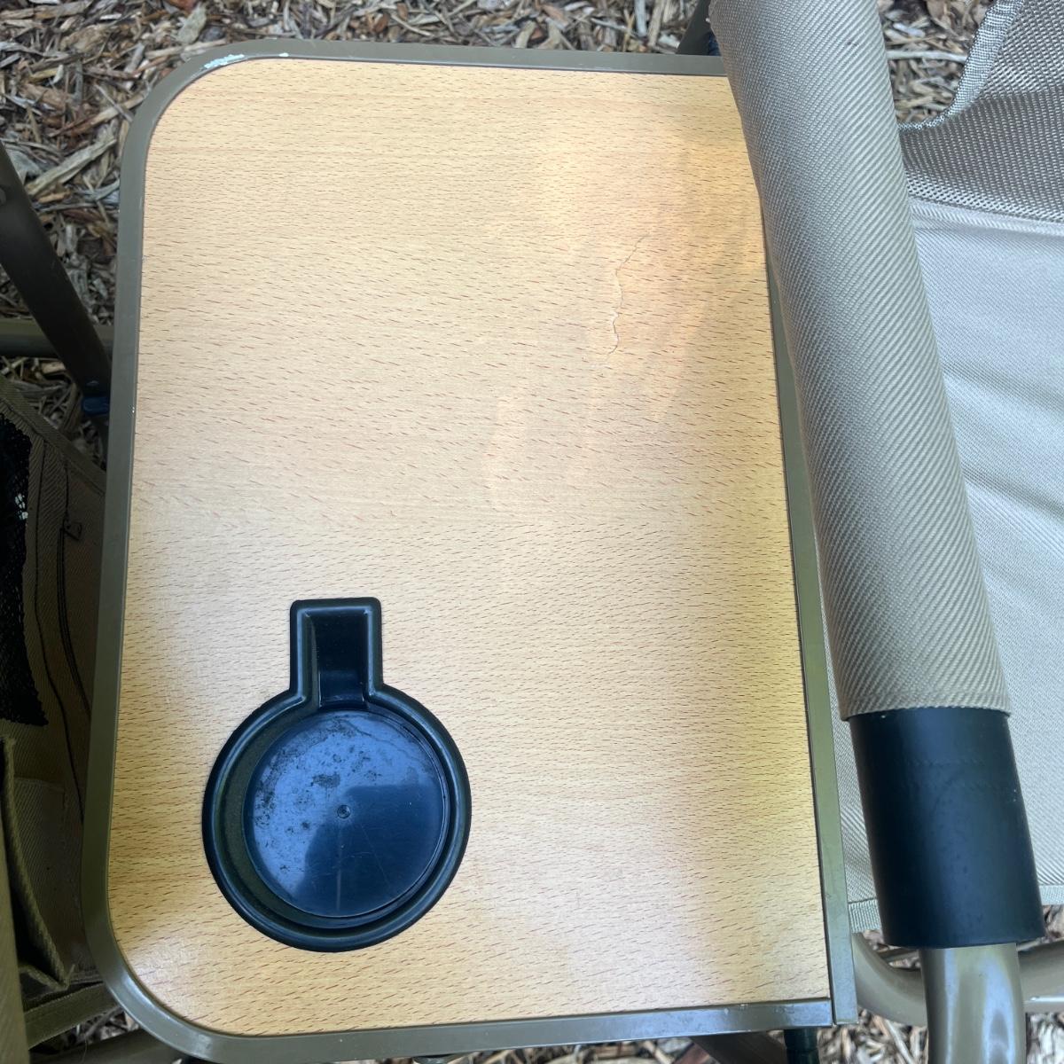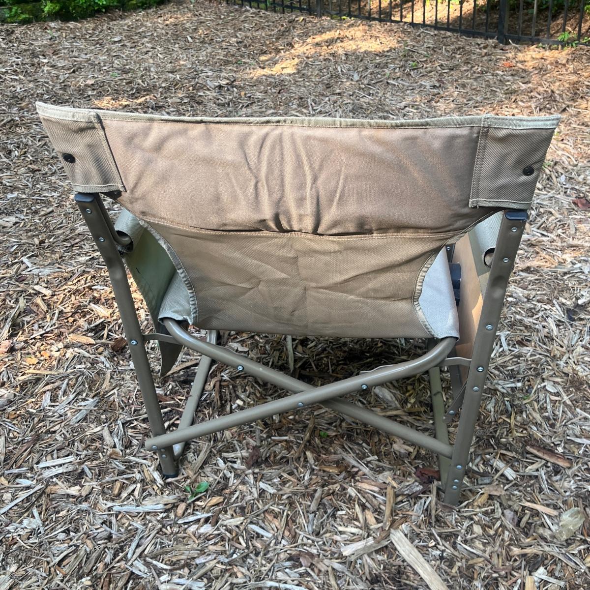 Lot includes two Lewis & Clark folding chairs with attached folding side table and storage bag. Chairs each measure 26” x 20” x 33”H with a 18” seat height when open. One side table has crack, see pictures.