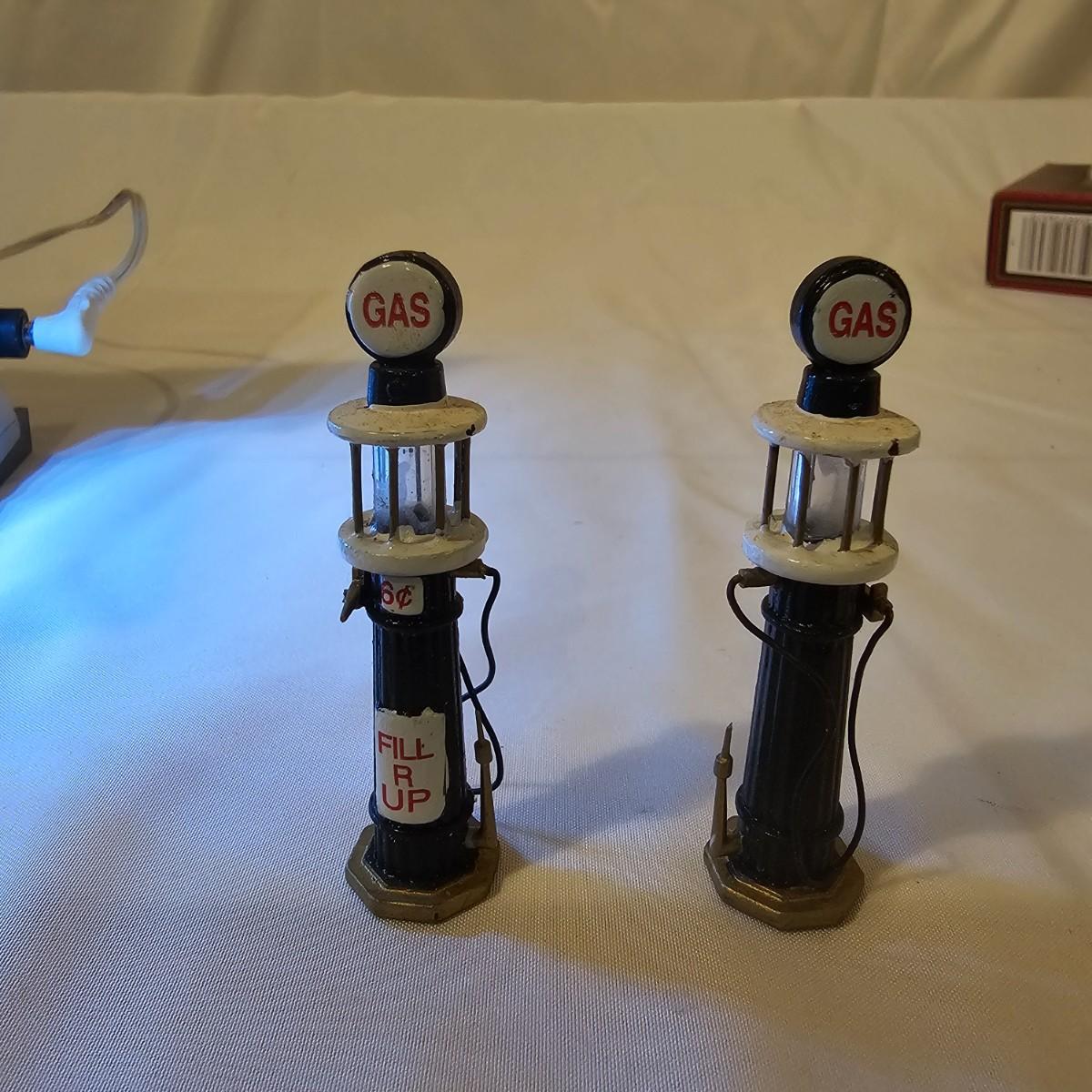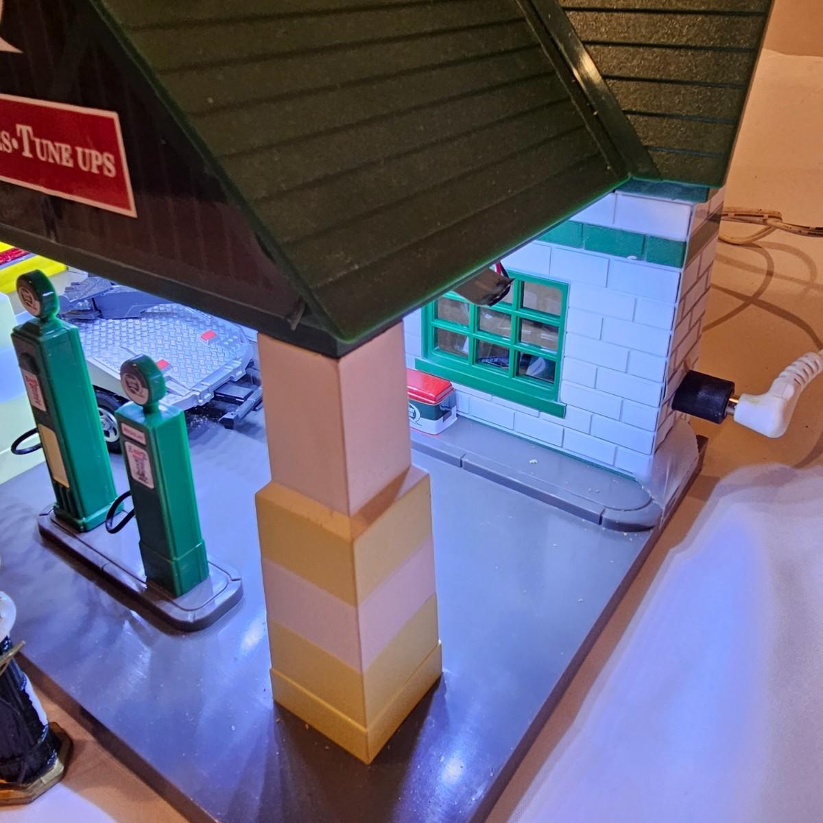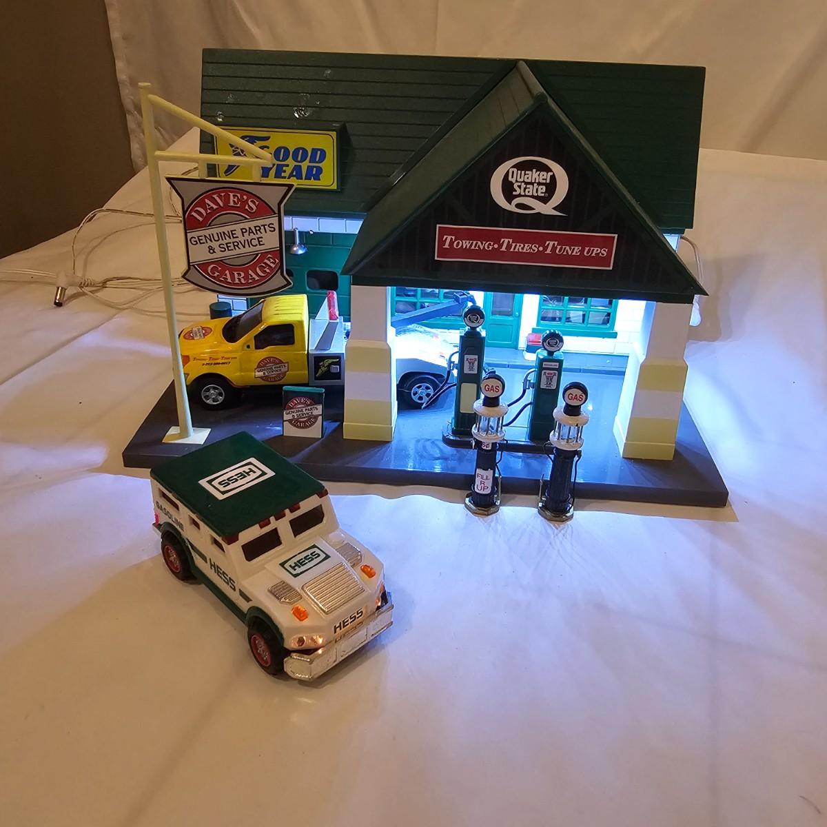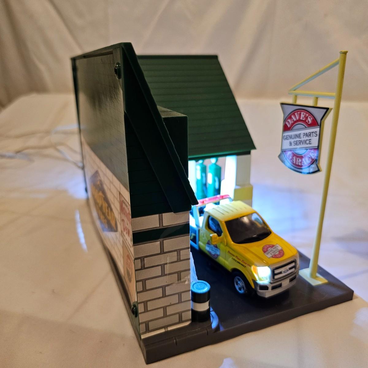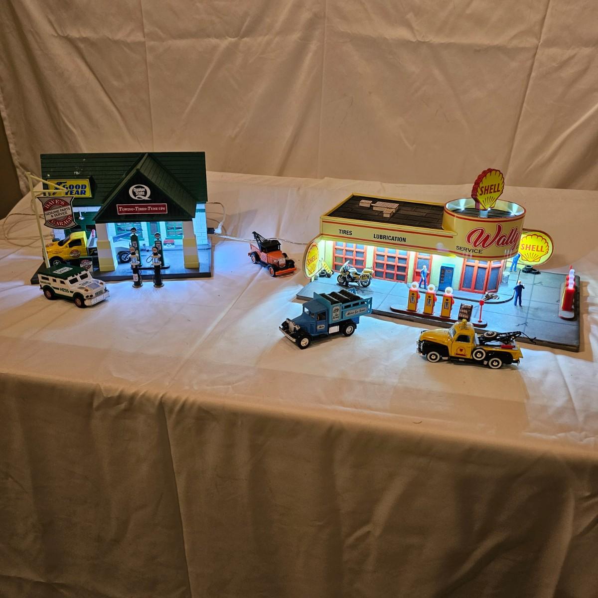 A pair of illuminated service stations, one with an animated rotating sign. Dave's Garage has drive thru pumps, a lighted wrecker and lots of signage. Two extra metal gas pumps included. Building measures 11" x 6.5" x 7" H. Runs on AC adapter, included. Wally's Service Station has a rotating Shell logo on the roof and lots of other lighting as well. 15" x 9.5" x 7"H. Also included are some extra wrecker vehicles, a motorcycle and a Hess gas truck that is battery run and lights up, tested working. Please note the AC adapter provided has three individual plugs to run both of these structures and also one more. See photos for details. Shipping available.Please note that any price tag seen on an item was not put there by Sterling Transitions and does not reflect the current value of the item.