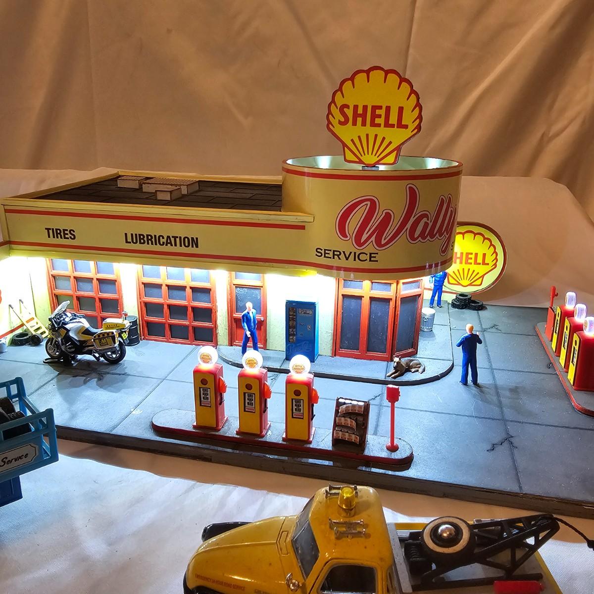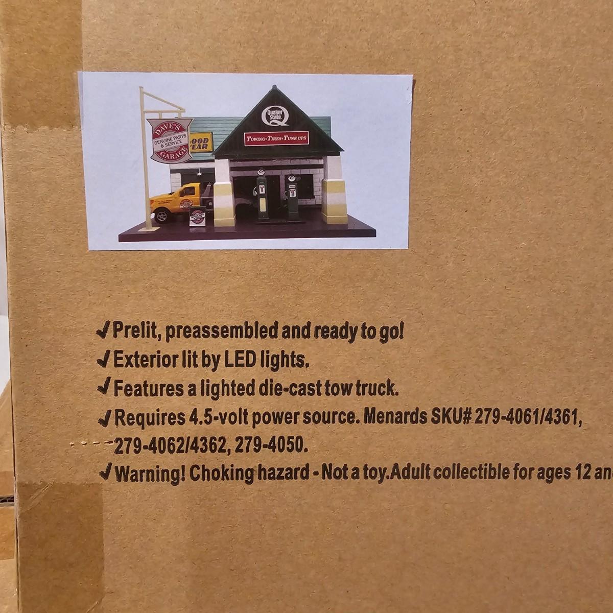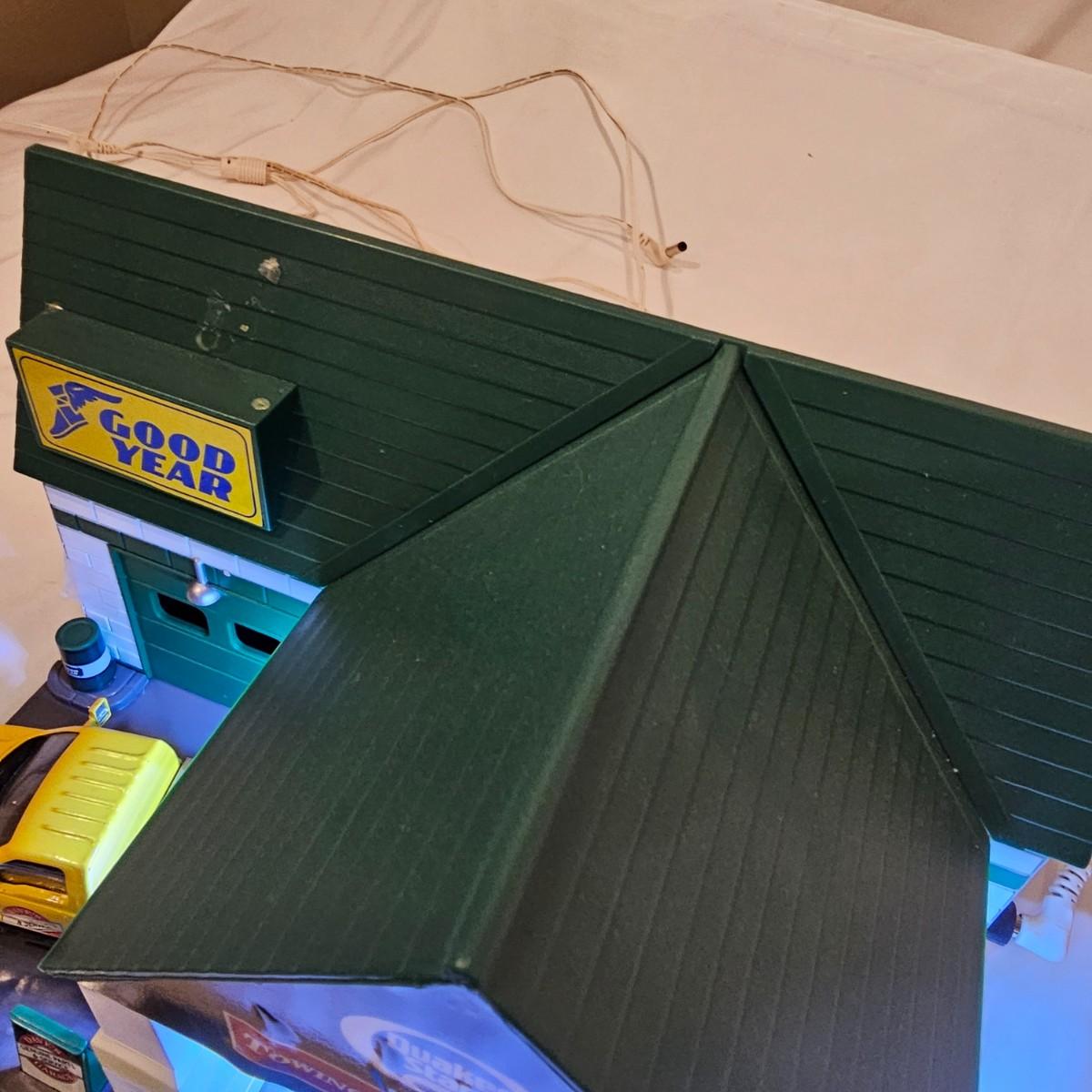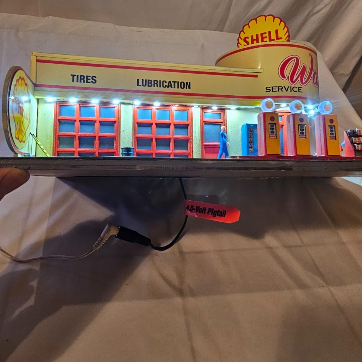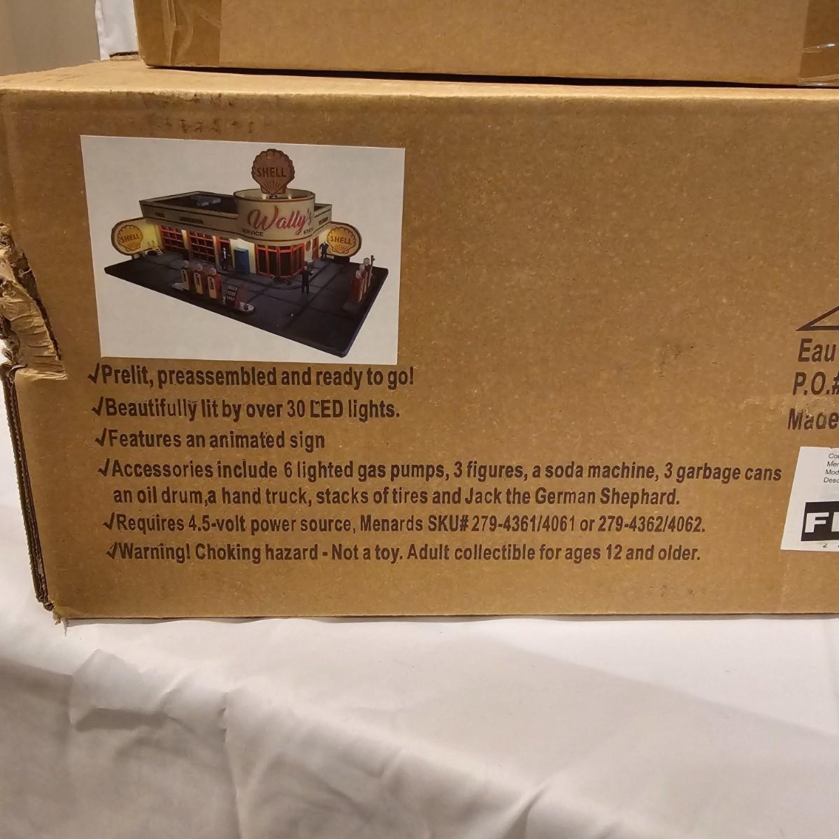 A pair of illuminated service stations, one with an animated rotating sign. Dave's Garage has drive thru pumps, a lighted wrecker and lots of signage. Two extra metal gas pumps included. Building measures 11" x 6.5" x 7" H. Runs on AC adapter, included. Wally's Service Station has a rotating Shell logo on the roof and lots of other lighting as well. 15" x 9.5" x 7"H. Also included are some extra wrecker vehicles, a motorcycle and a Hess gas truck that is battery run and lights up, tested working. Please note the AC adapter provided has three individual plugs to run both of these structures and also one more. See photos for details. Shipping available.Please note that any price tag seen on an item was not put there by Sterling Transitions and does not reflect the current value of the item.