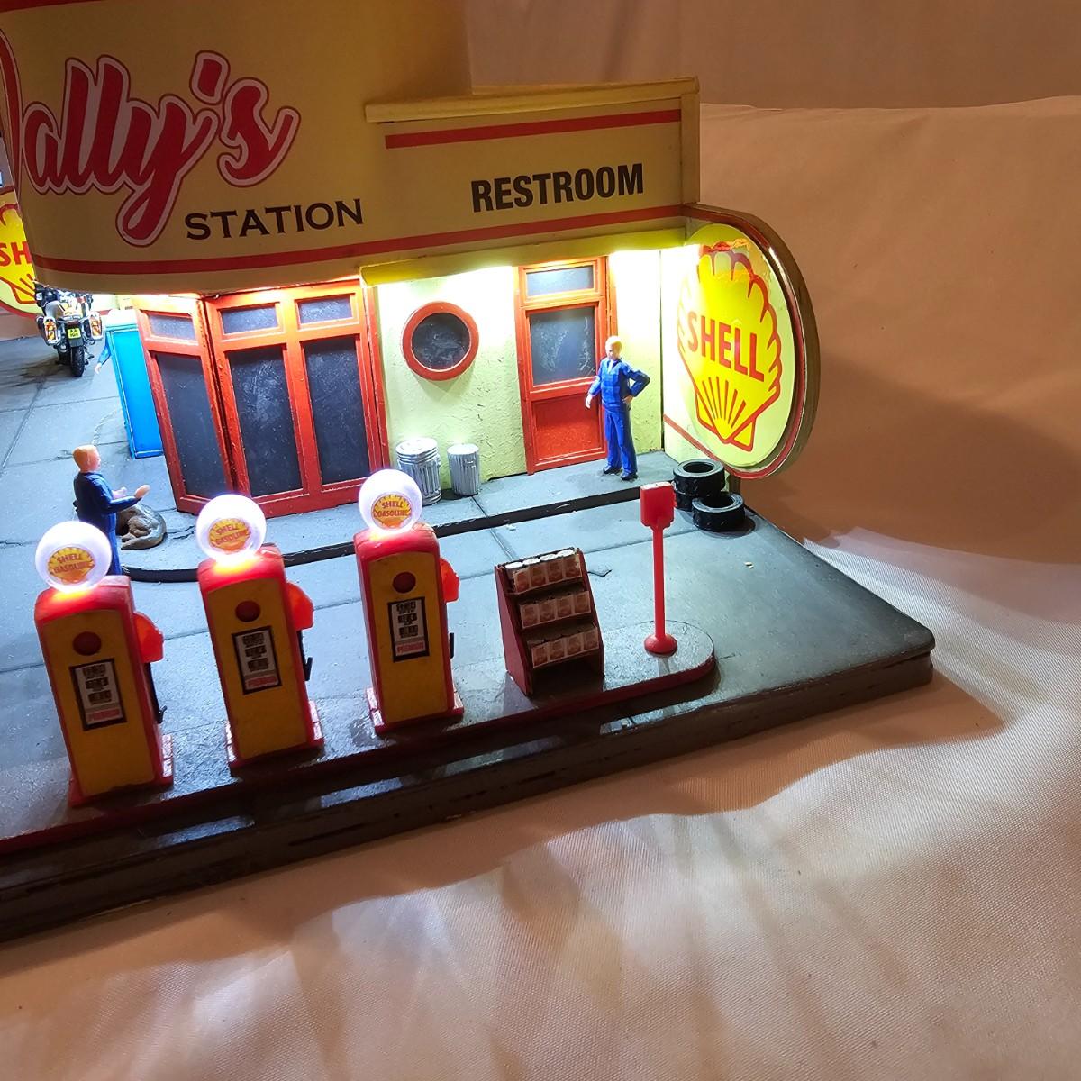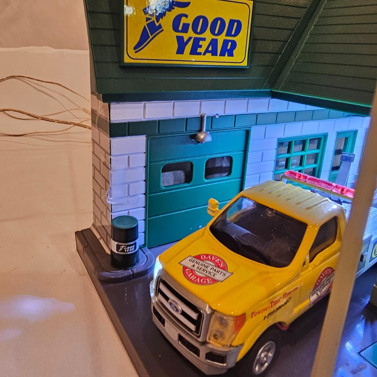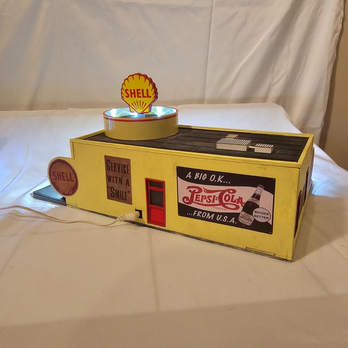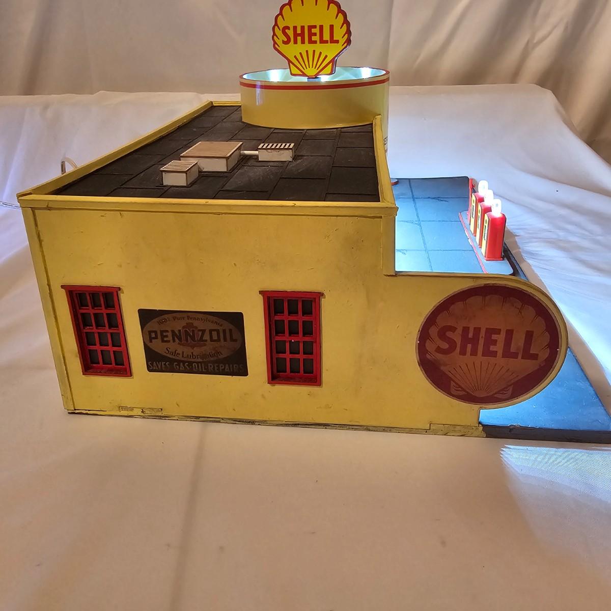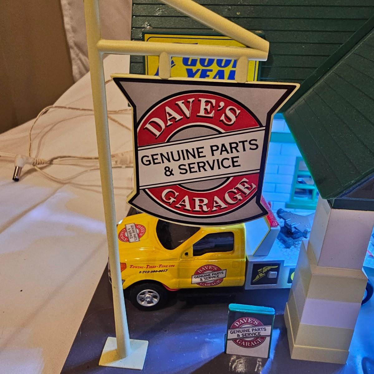 A pair of illuminated service stations, one with an animated rotating sign. Dave's Garage has drive thru pumps, a lighted wrecker and lots of signage. Two extra metal gas pumps included. Building measures 11" x 6.5" x 7" H. Runs on AC adapter, included. Wally's Service Station has a rotating Shell logo on the roof and lots of other lighting as well. 15" x 9.5" x 7"H. Also included are some extra wrecker vehicles, a motorcycle and a Hess gas truck that is battery run and lights up, tested working. Please note the AC adapter provided has three individual plugs to run both of these structures and also one more. See photos for details. Shipping available.Please note that any price tag seen on an item was not put there by Sterling Transitions and does not reflect the current value of the item.