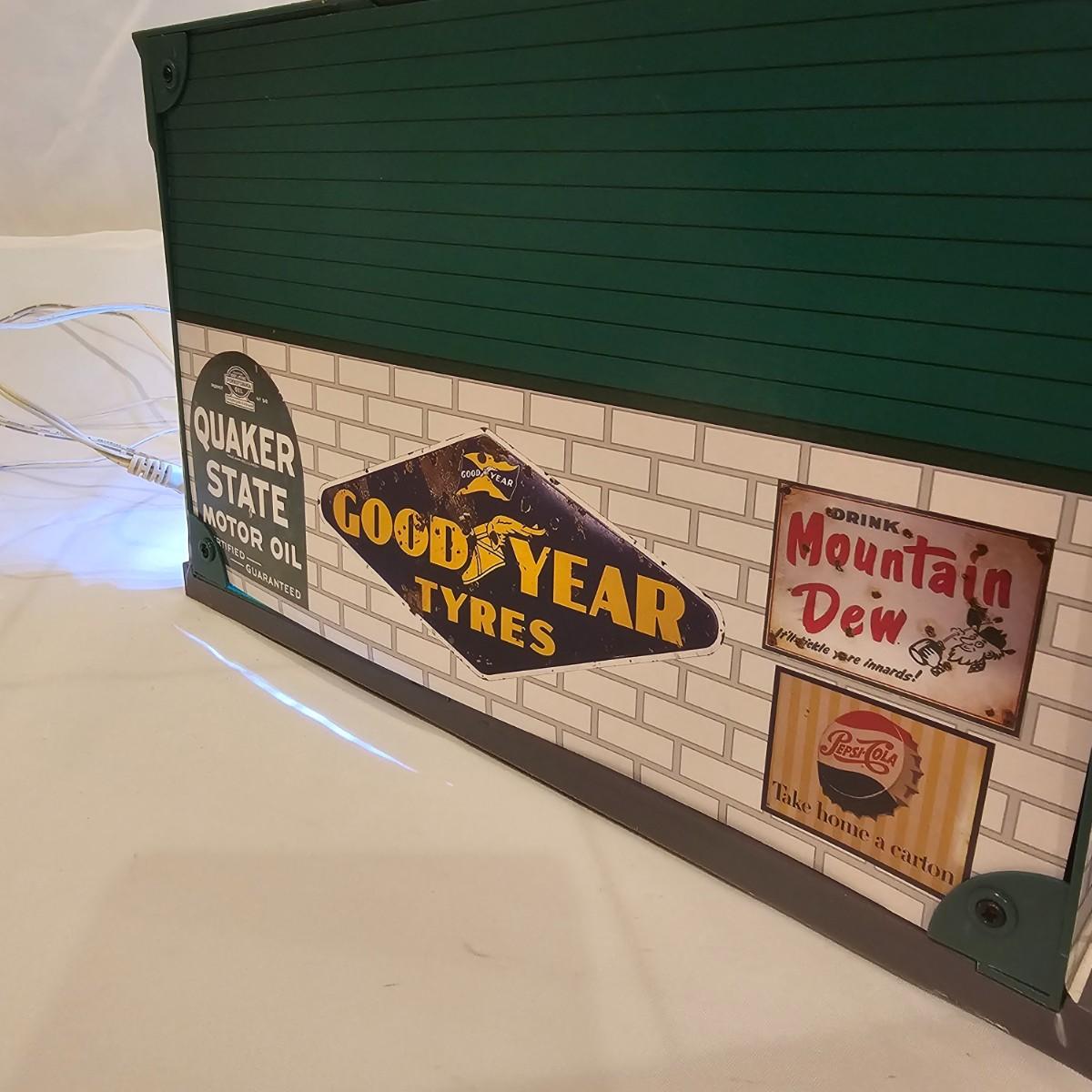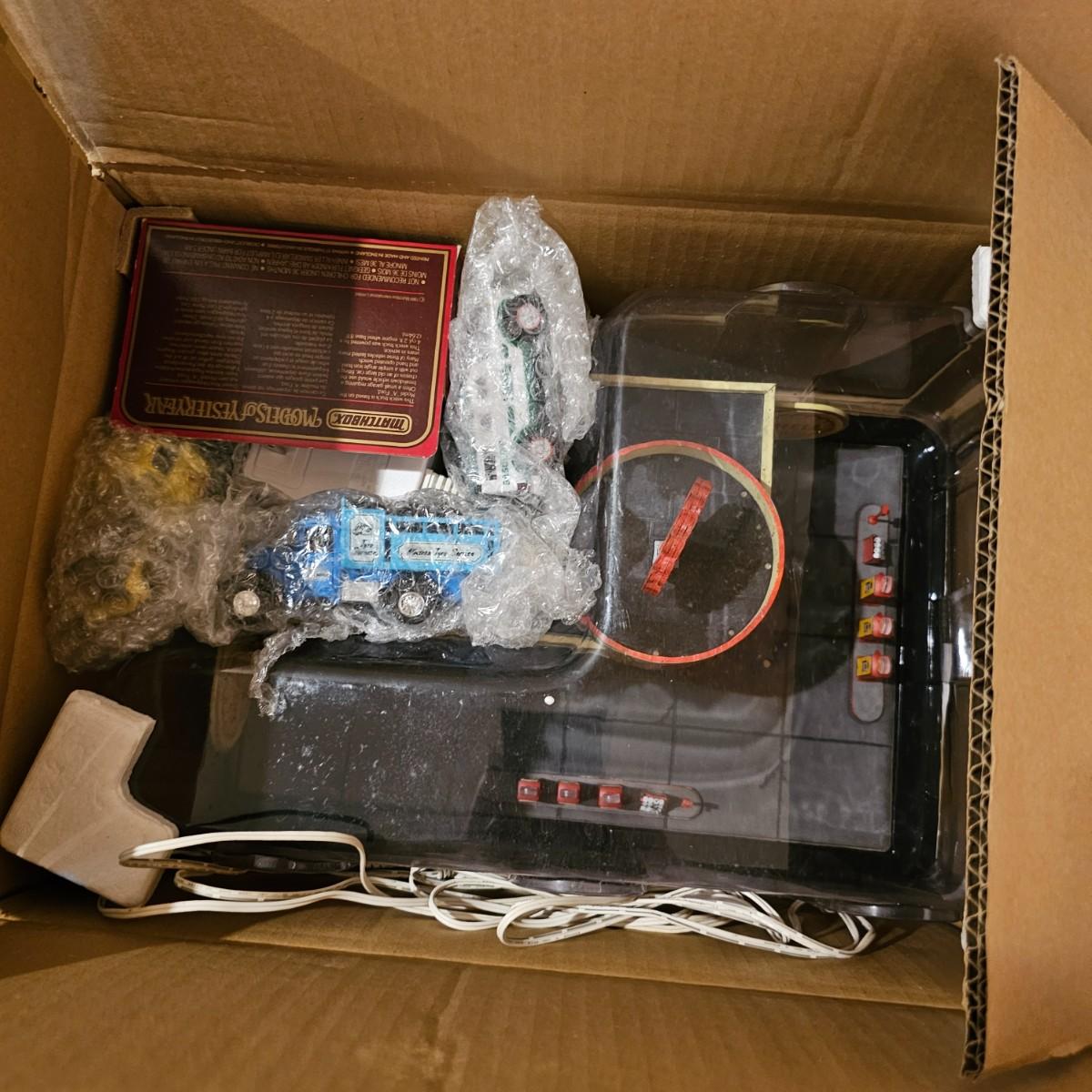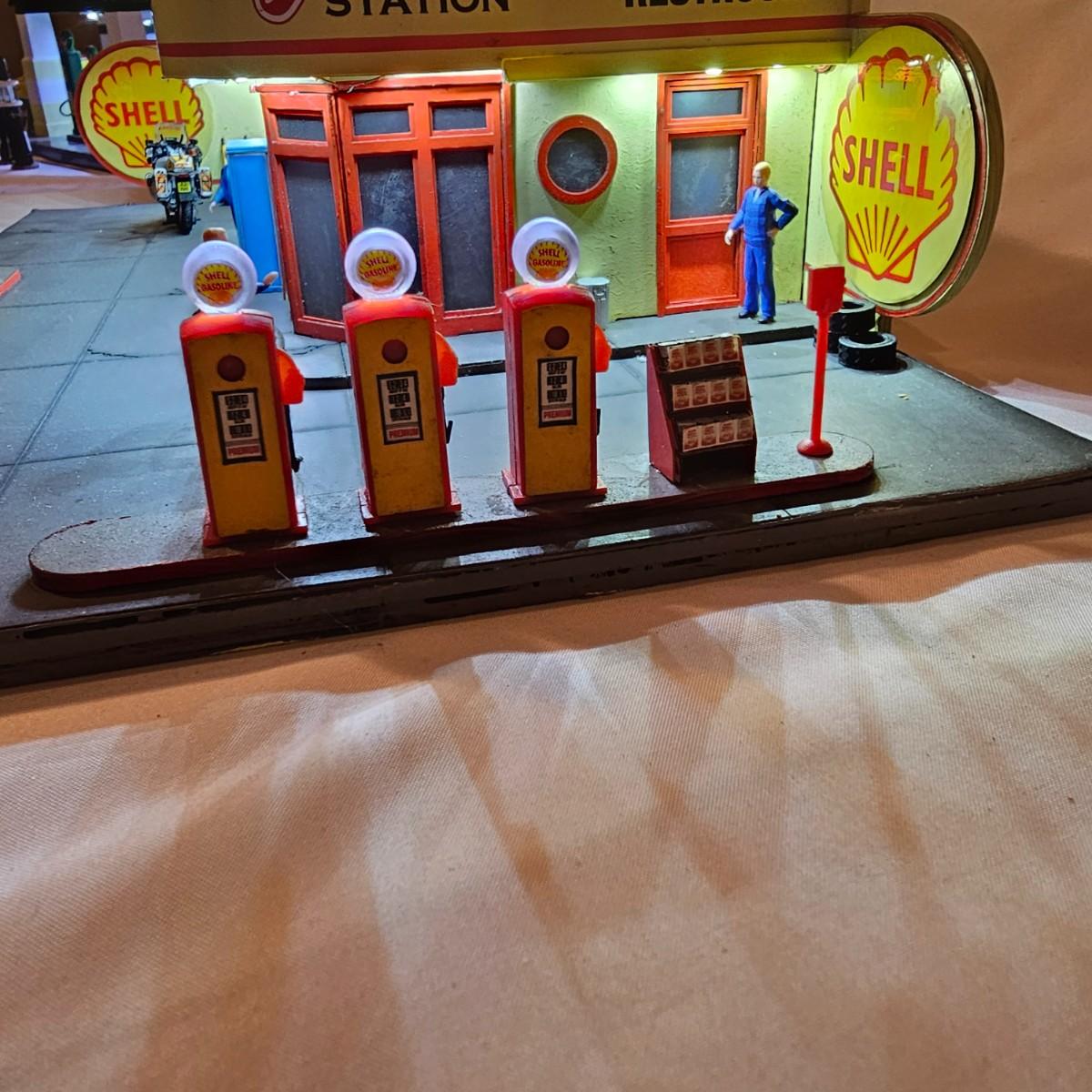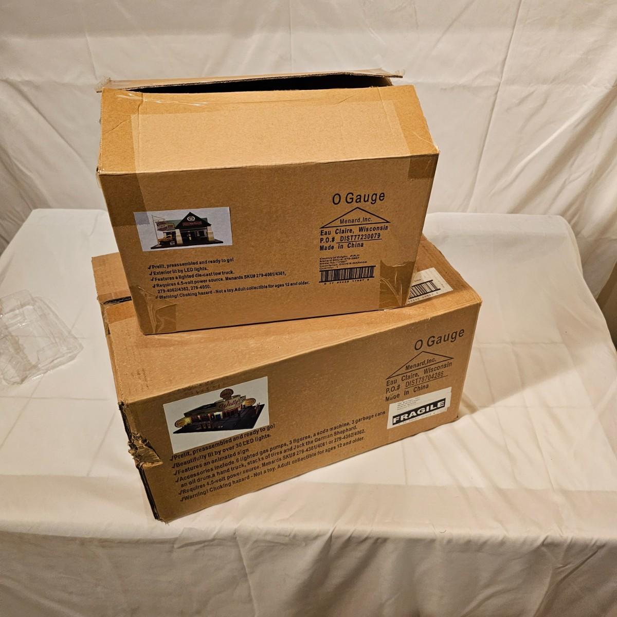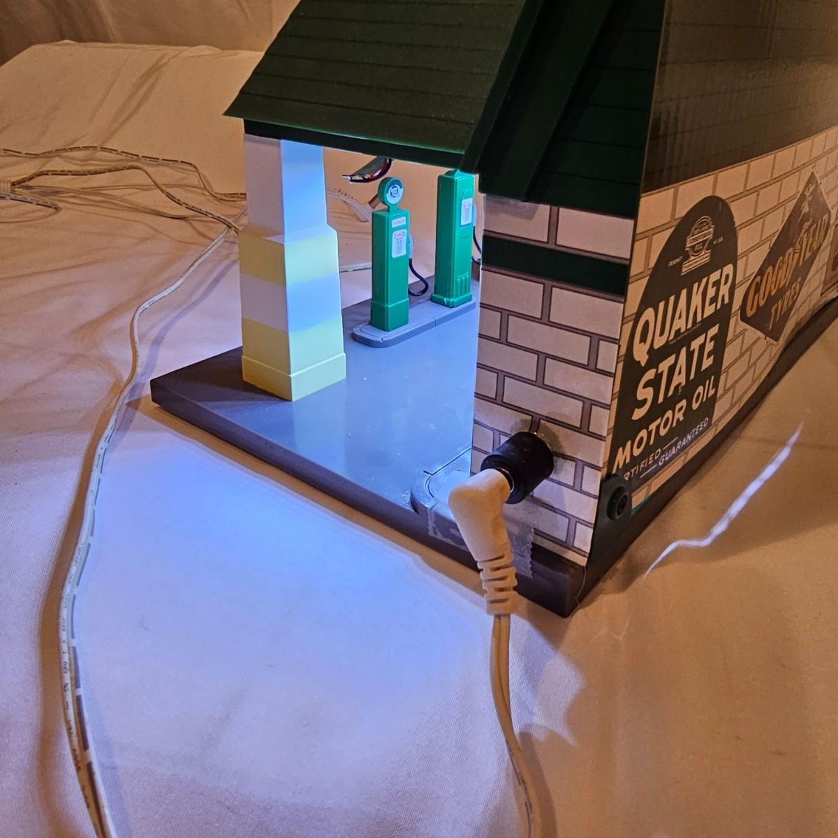 A pair of illuminated service stations, one with an animated rotating sign. Dave's Garage has drive thru pumps, a lighted wrecker and lots of signage. Two extra metal gas pumps included. Building measures 11" x 6.5" x 7" H. Runs on AC adapter, included. Wally's Service Station has a rotating Shell logo on the roof and lots of other lighting as well. 15" x 9.5" x 7"H. Also included are some extra wrecker vehicles, a motorcycle and a Hess gas truck that is battery run and lights up, tested working. Please note the AC adapter provided has three individual plugs to run both of these structures and also one more. See photos for details. Shipping available.Please note that any price tag seen on an item was not put there by Sterling Transitions and does not reflect the current value of the item.