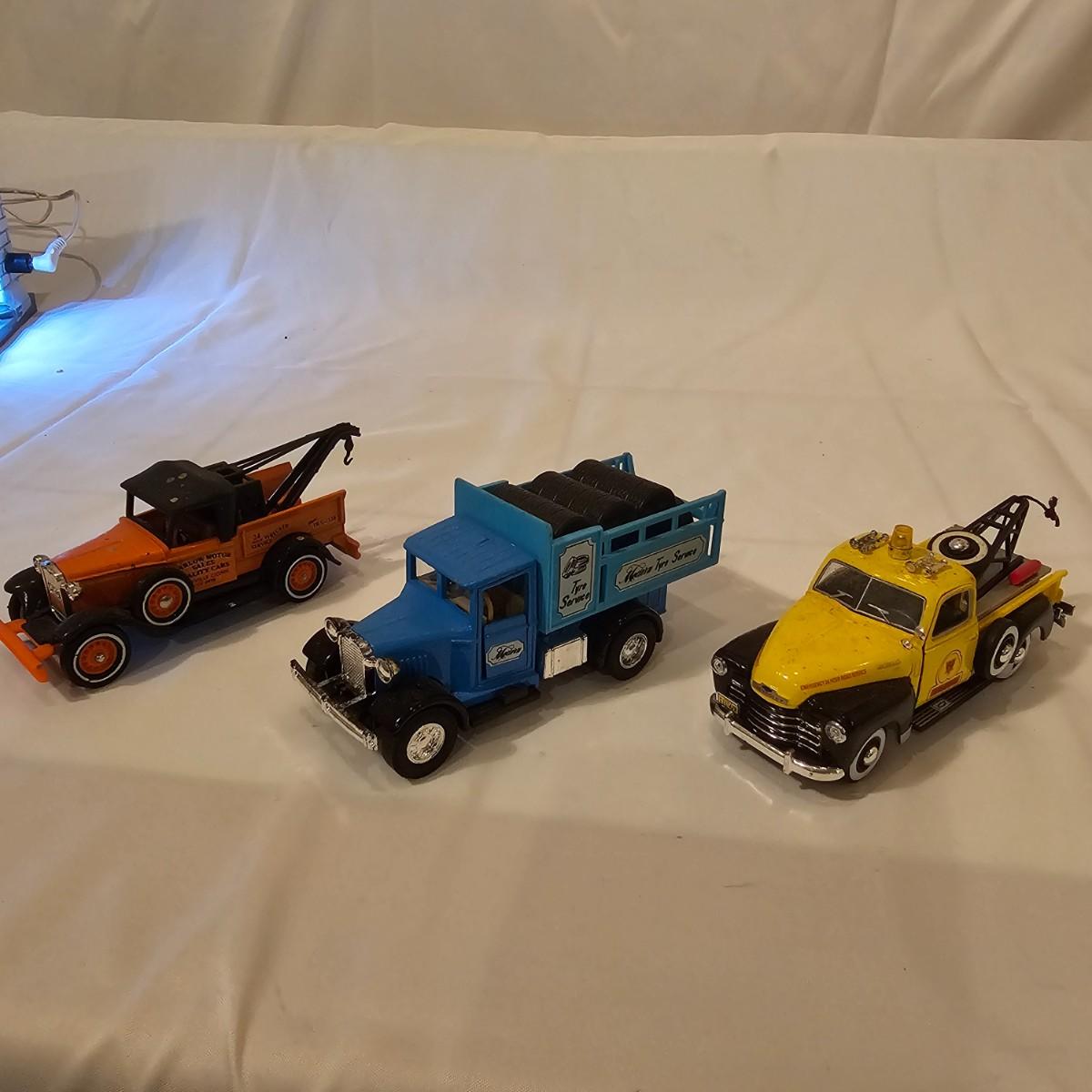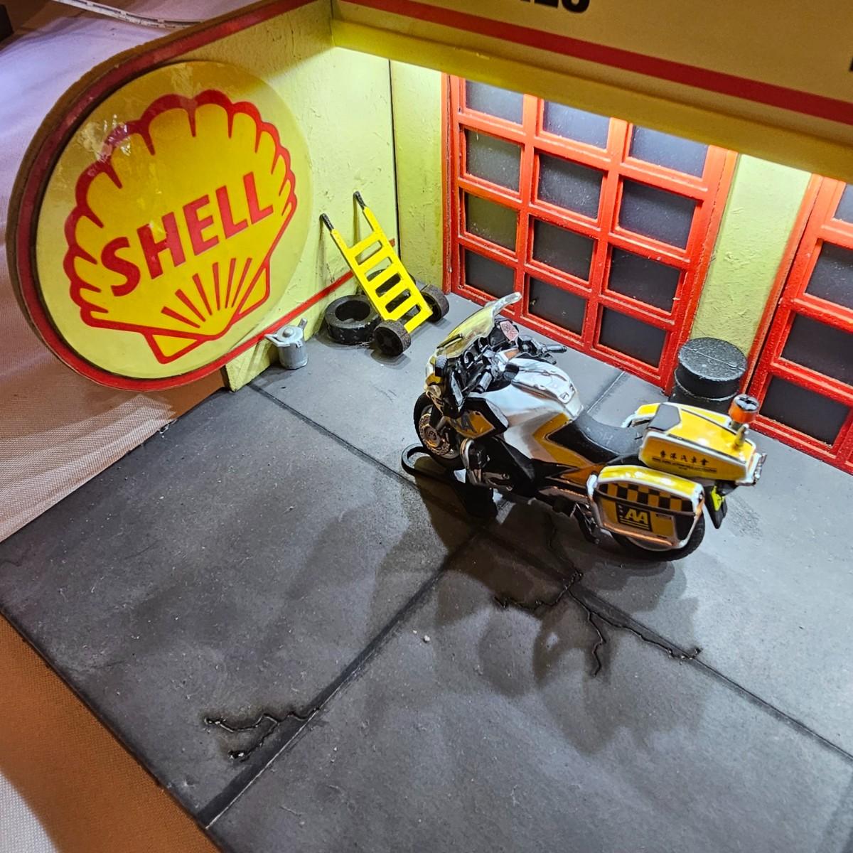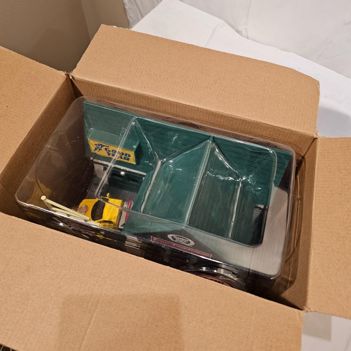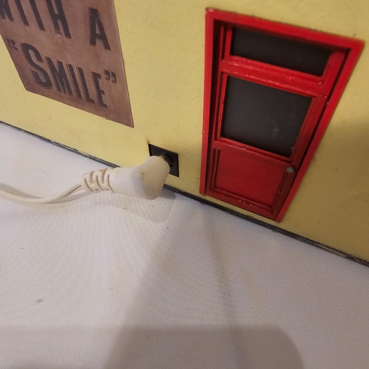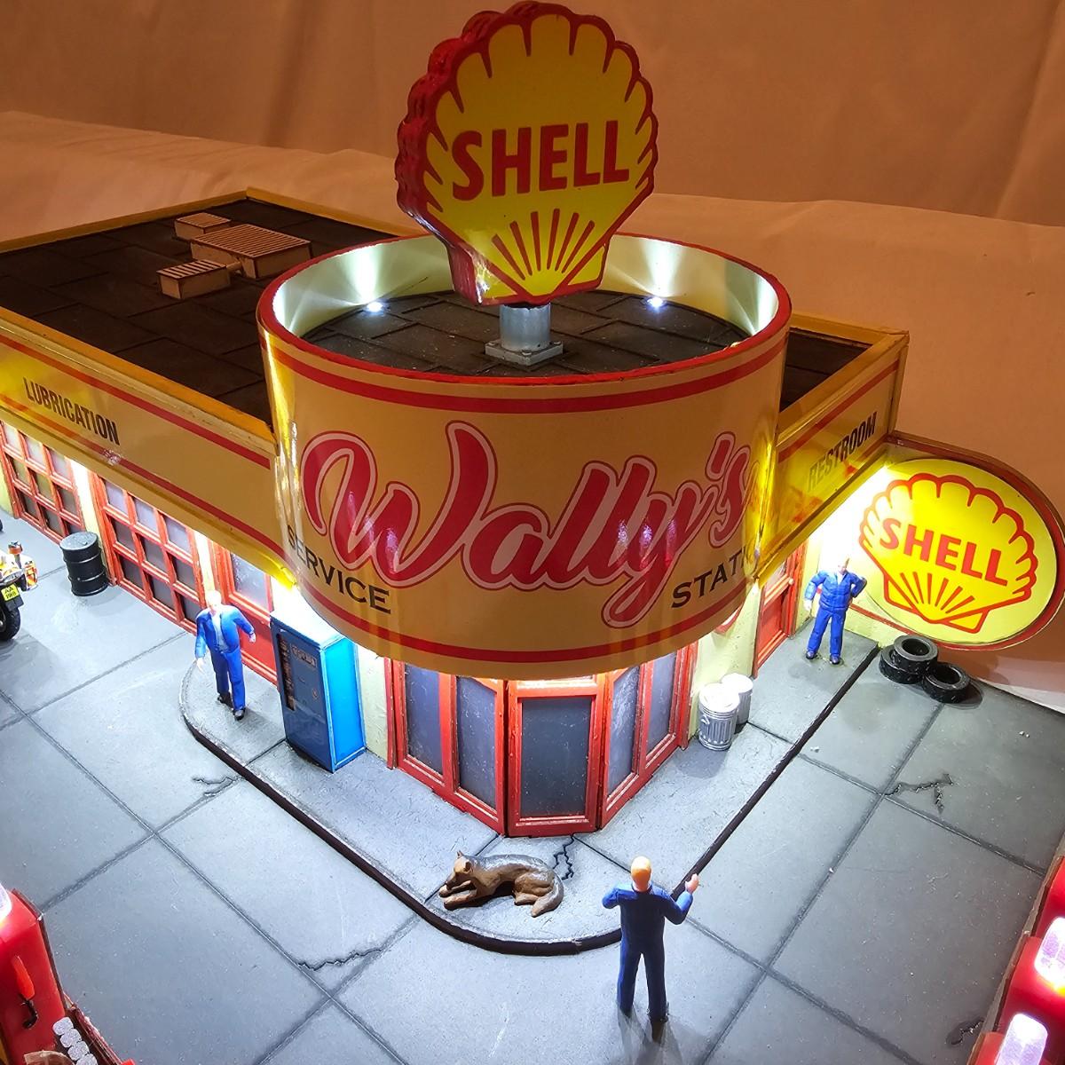 A pair of illuminated service stations, one with an animated rotating sign. Dave's Garage has drive thru pumps, a lighted wrecker and lots of signage. Two extra metal gas pumps included. Building measures 11" x 6.5" x 7" H. Runs on AC adapter, included. Wally's Service Station has a rotating Shell logo on the roof and lots of other lighting as well. 15" x 9.5" x 7"H. Also included are some extra wrecker vehicles, a motorcycle and a Hess gas truck that is battery run and lights up, tested working. Please note the AC adapter provided has three individual plugs to run both of these structures and also one more. See photos for details. Shipping available.Please note that any price tag seen on an item was not put there by Sterling Transitions and does not reflect the current value of the item.