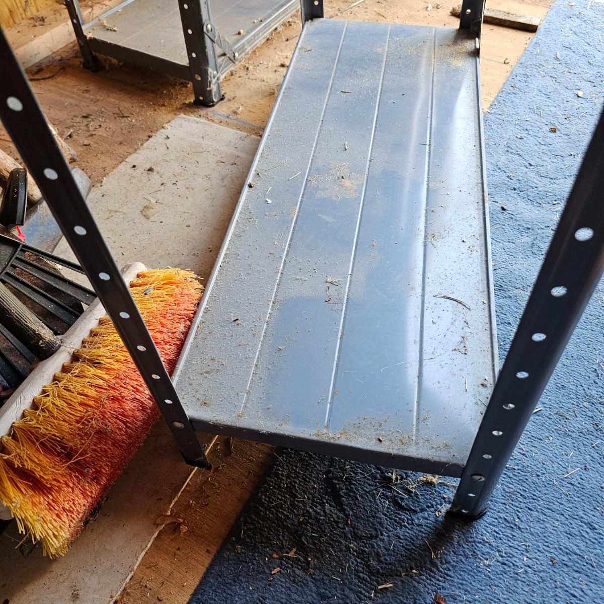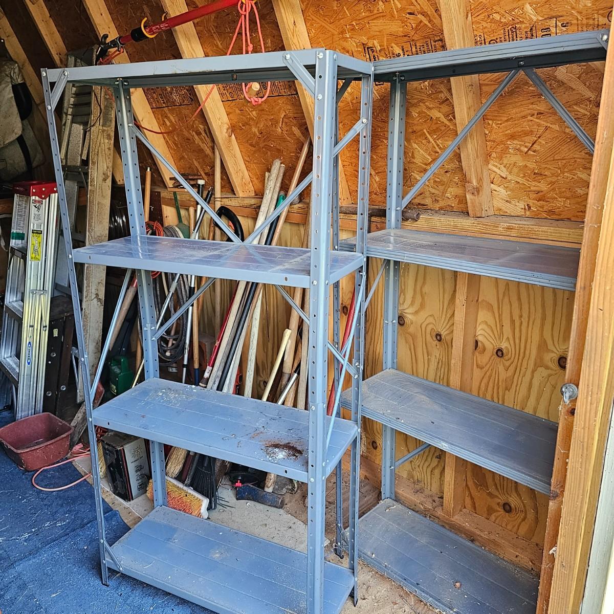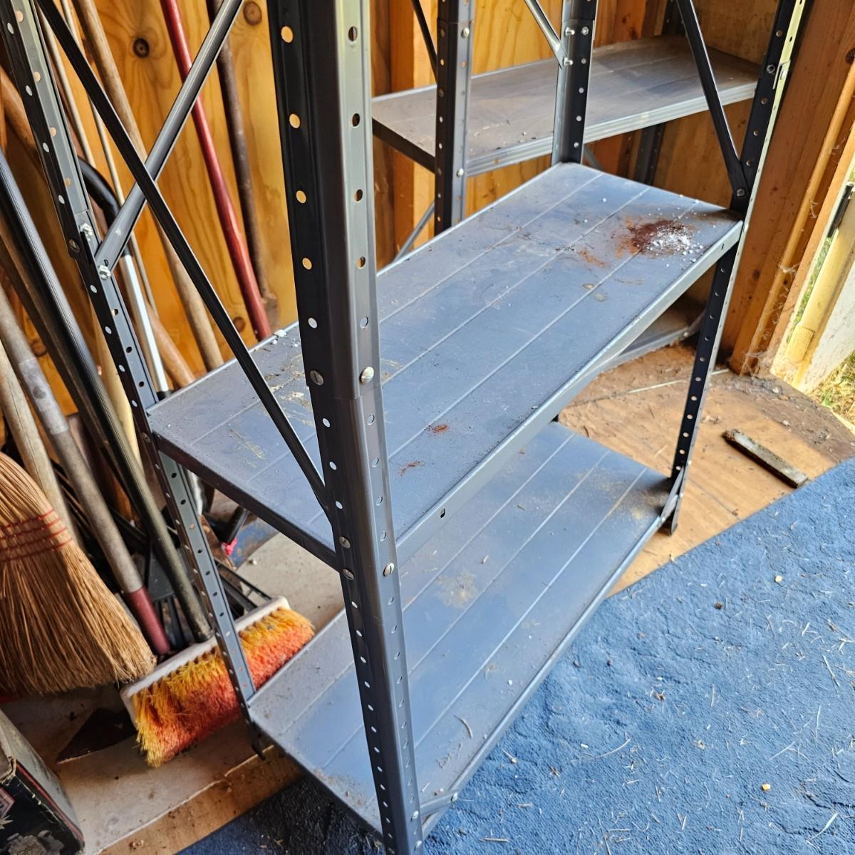 A pair of lightweight utility shelf units. Four shelves each, some adjustable. Each unit measures 30" x 11.5" x 61"H. Some stains from use, see photos for details. Local pickup only.
