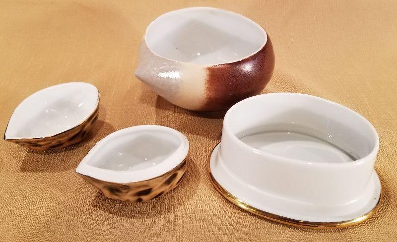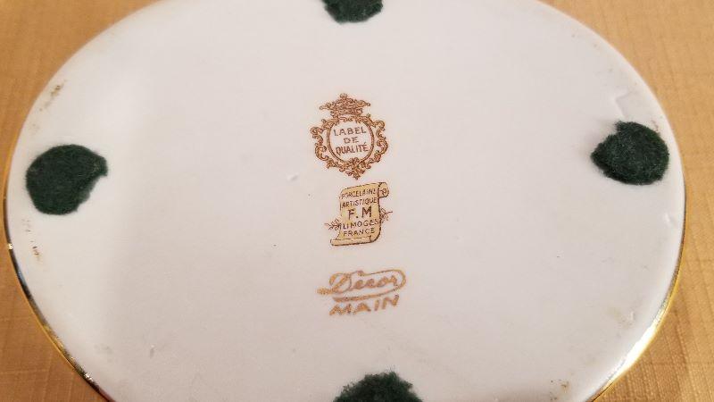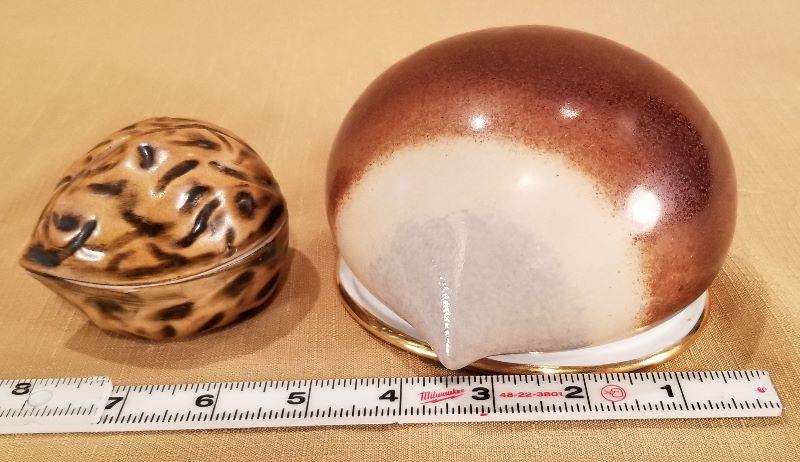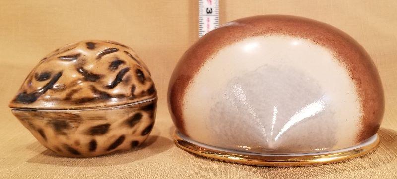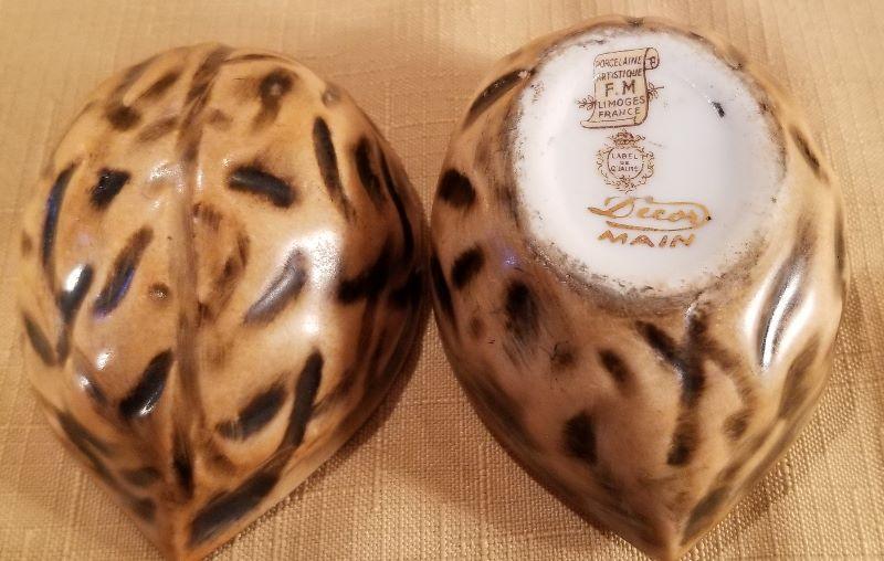 These beautiful Limoges Porcelain Nut Boxes are quite unique. One is a Walnut and we think the other is a Chestnut. Both are marked Décor Main - F.M. Limoge, France “Label De Qualite”. Both are in excellent condition. Very nice decorator pieces.