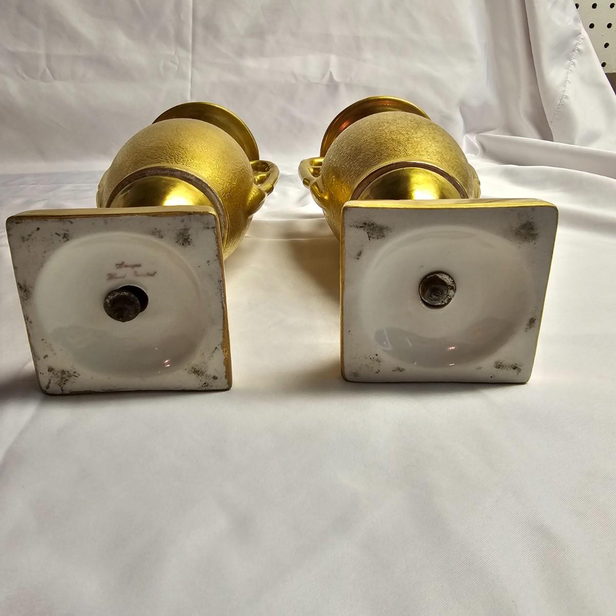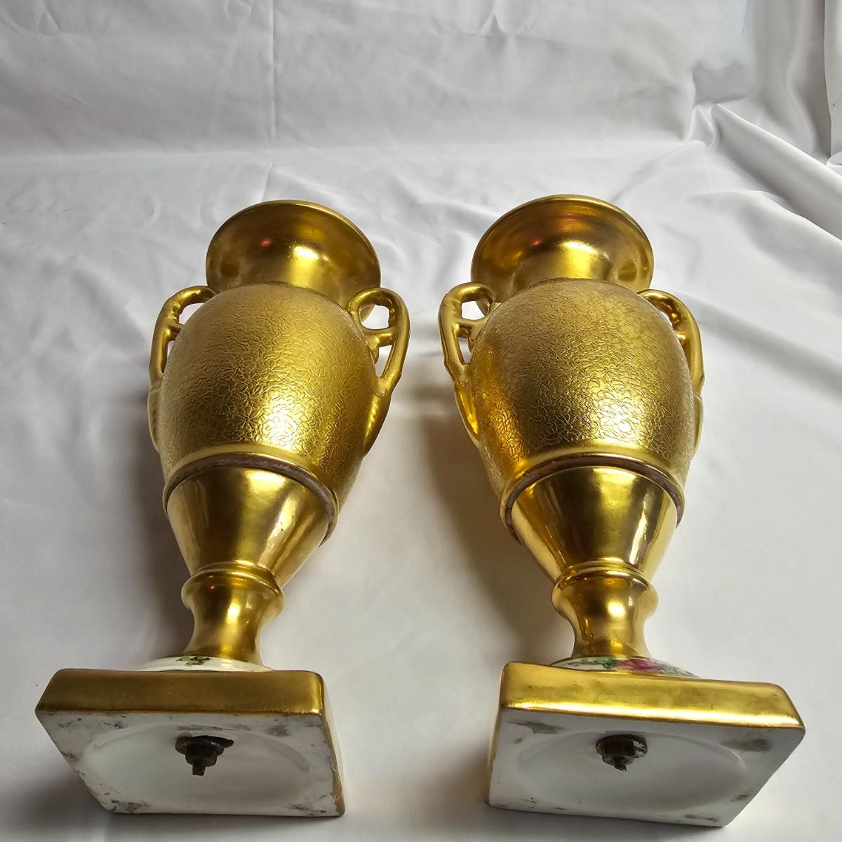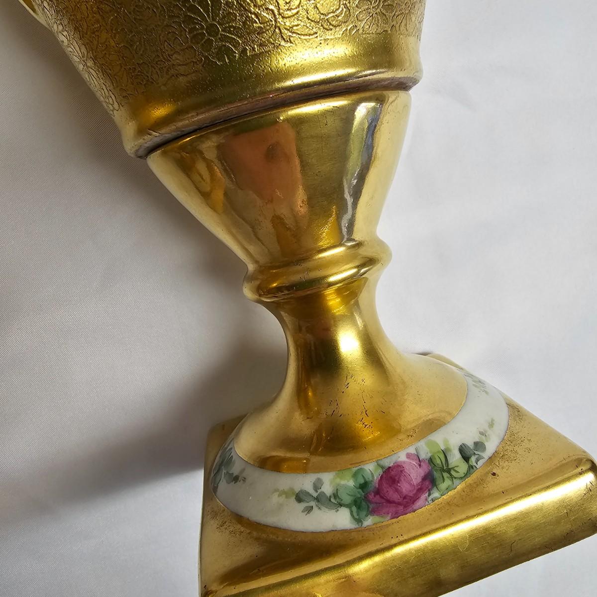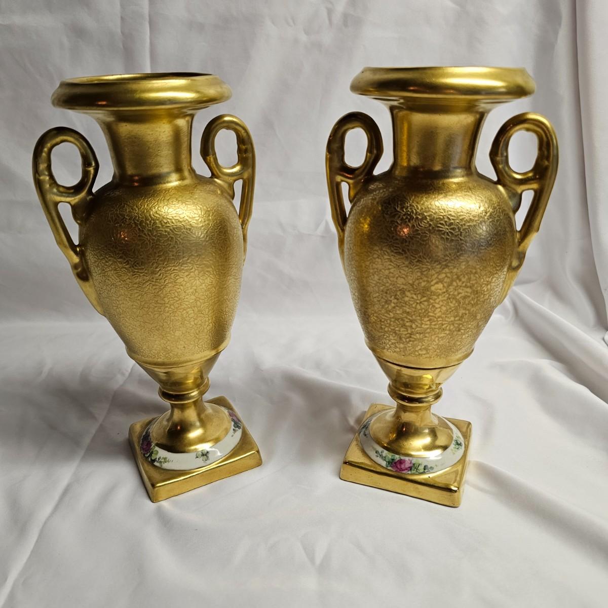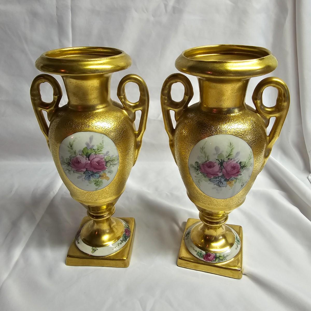 A pair of gold hand painted Limoges urns, one is saigned. Ceramic with floral painted fronts and base. Urns are 5" x 10"H, have swirled handle design. Some minor discoloration on bases, see photos for details. Shipping available.