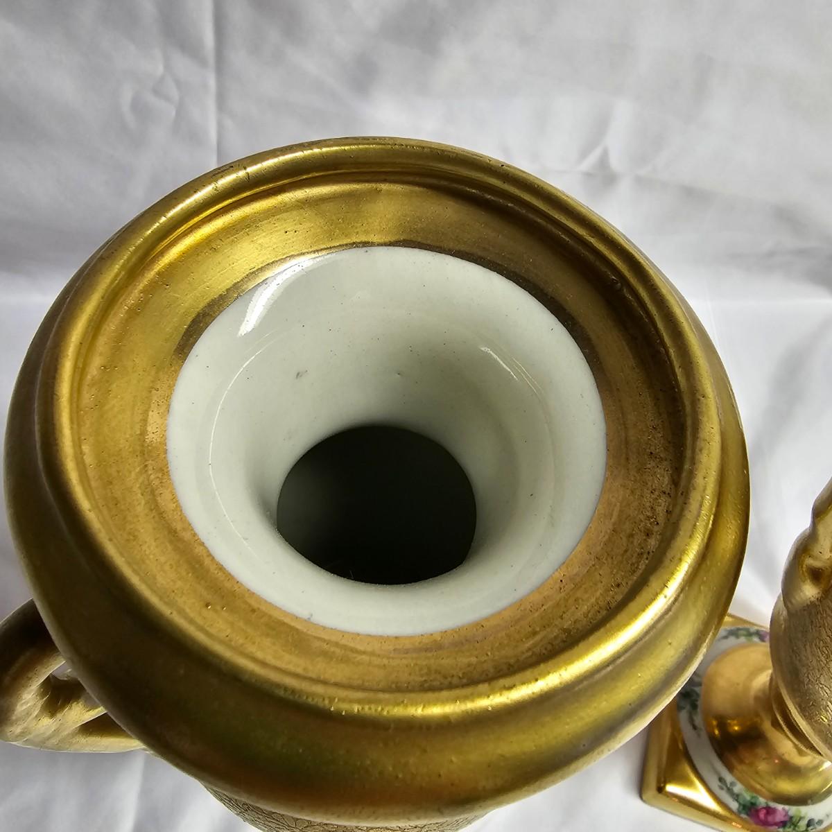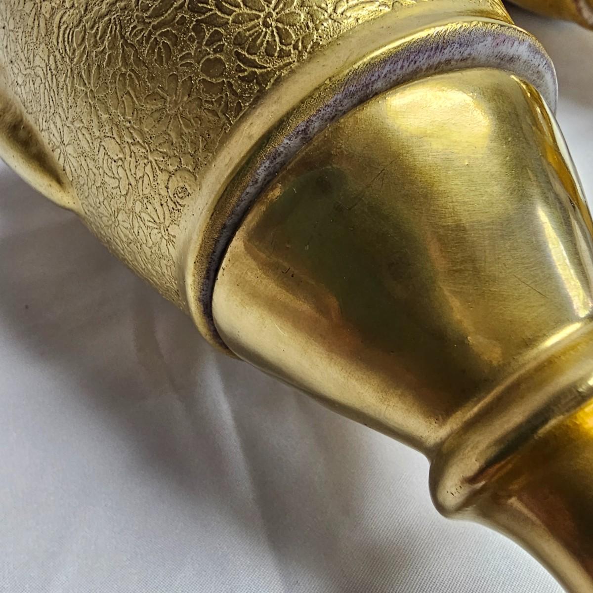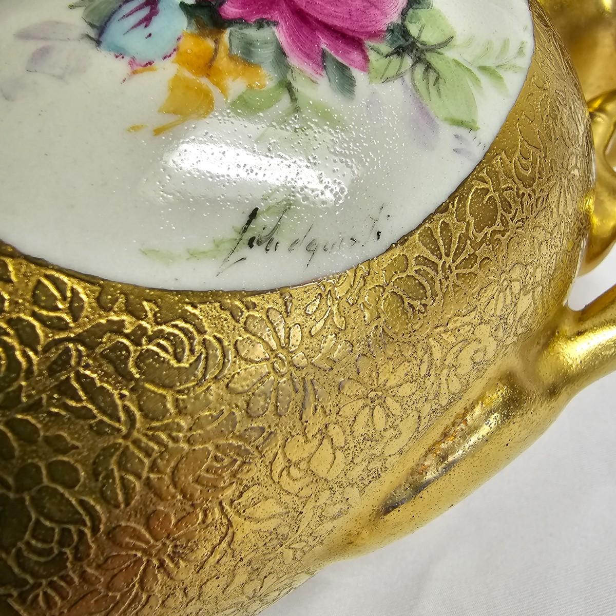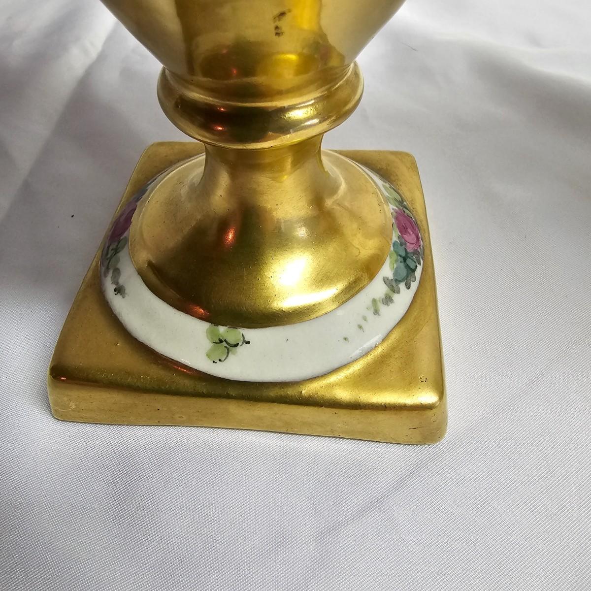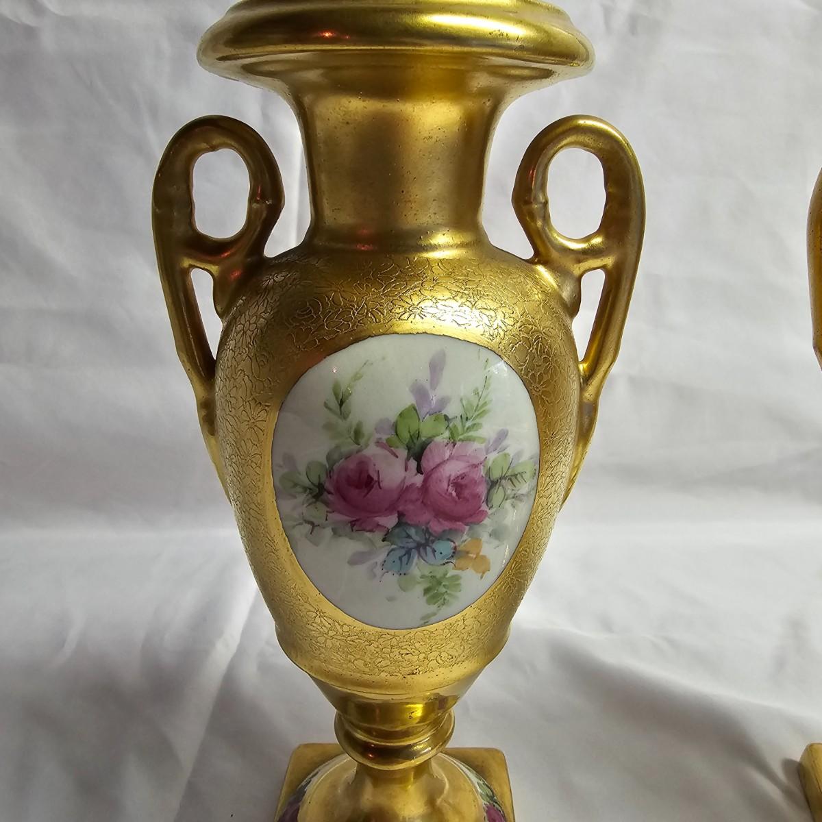 A pair of gold hand painted Limoges urns, one is saigned. Ceramic with floral painted fronts and base. Urns are 5" x 10"H, have swirled handle design. Some minor discoloration on bases, see photos for details. Shipping available.