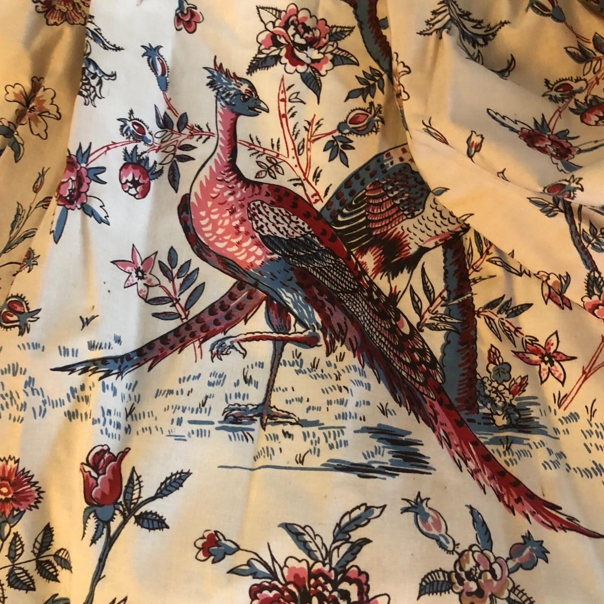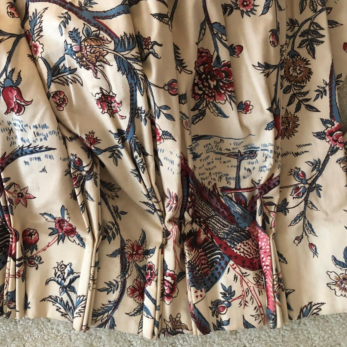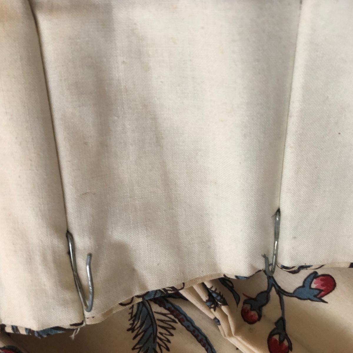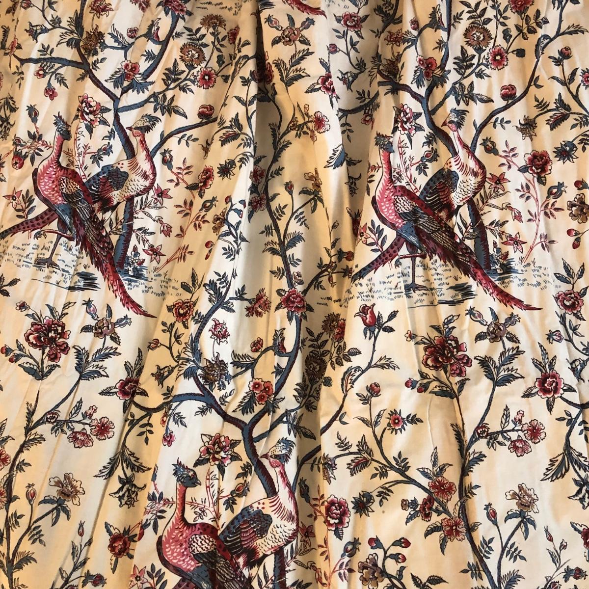 This lot includes two peacock valances which are mounted to the wall. Buyer will need to remove them from the wall (screwdriver needed or drill) and are welcome to take the wooden mounts. Both valances extend about 7.5” from the wall and are 18” long. The lengths vary with the shorter valance being about 114” and the longer one being 168” long. Each panel has ten metal clips at the top and each are 33” wide - at the top. Each panel is 83” long and lined from top to bottom. There are also four tie backs. Please note that there are faint water marks on three of the panels (see pictures). Shipping Available.