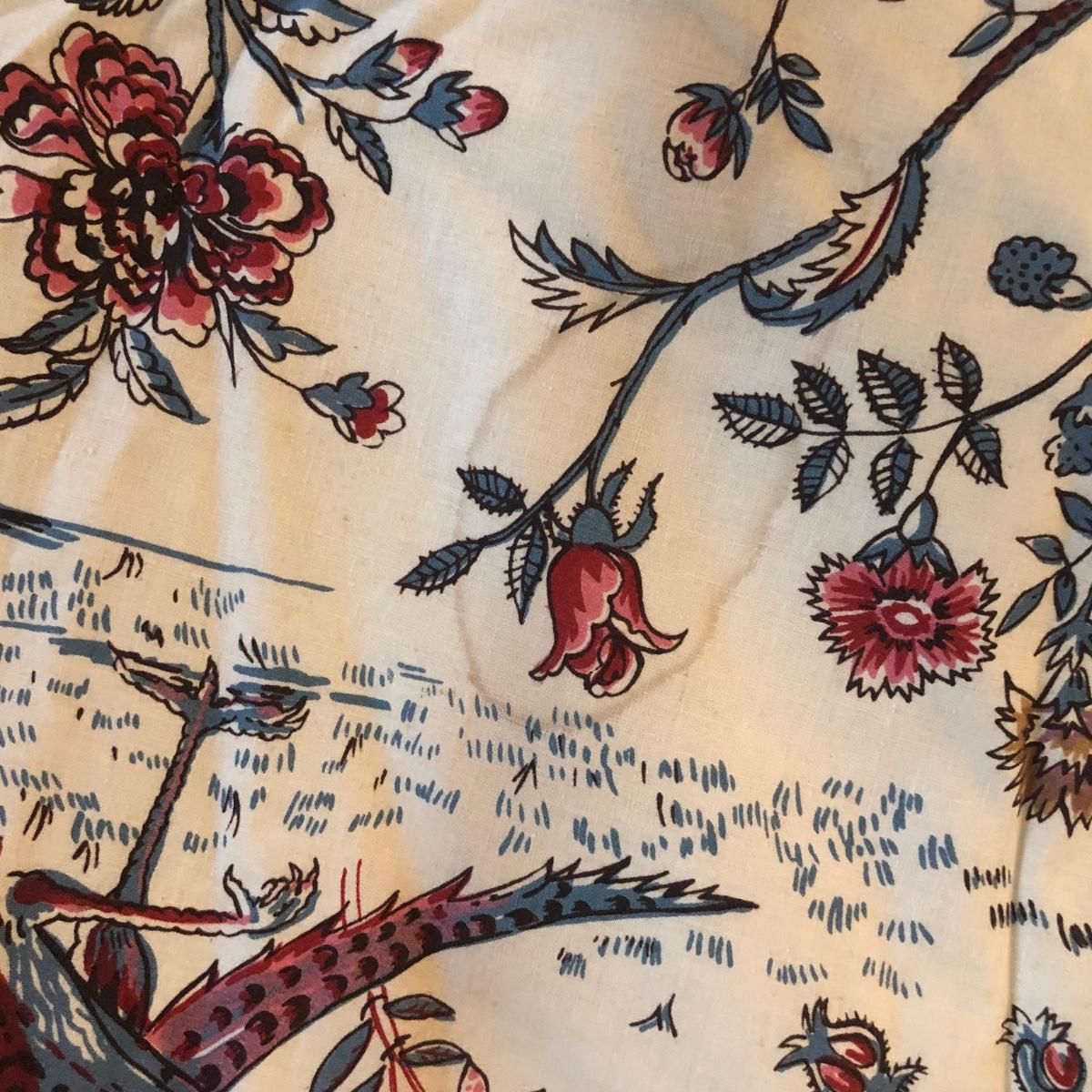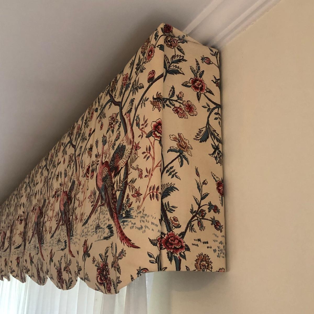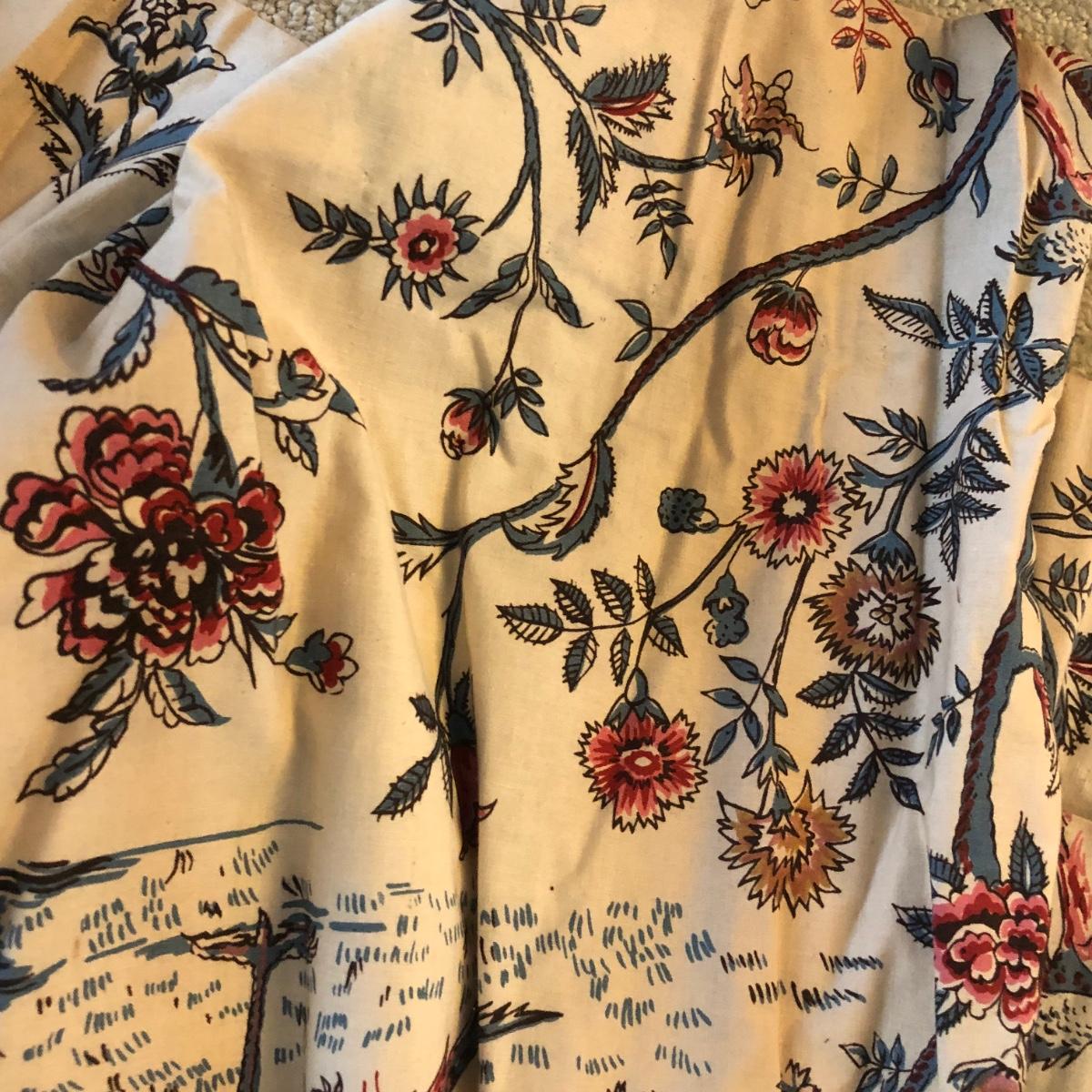This lot includes two peacock valances which are mounted to the wall. Buyer will need to remove them from the wall (screwdriver needed or drill) and are welcome to take the wooden mounts. Both valances extend about 7.5” from the wall and are 18” long. The lengths vary with the shorter valance being about 114” and the longer one being 168” long. Each panel has ten metal clips at the top and each are 33” wide - at the top. Each panel is 83” long and lined from top to bottom. There are also four tie backs. Please note that there are faint water marks on three of the panels (see pictures). Shipping Available.