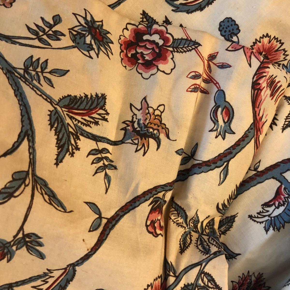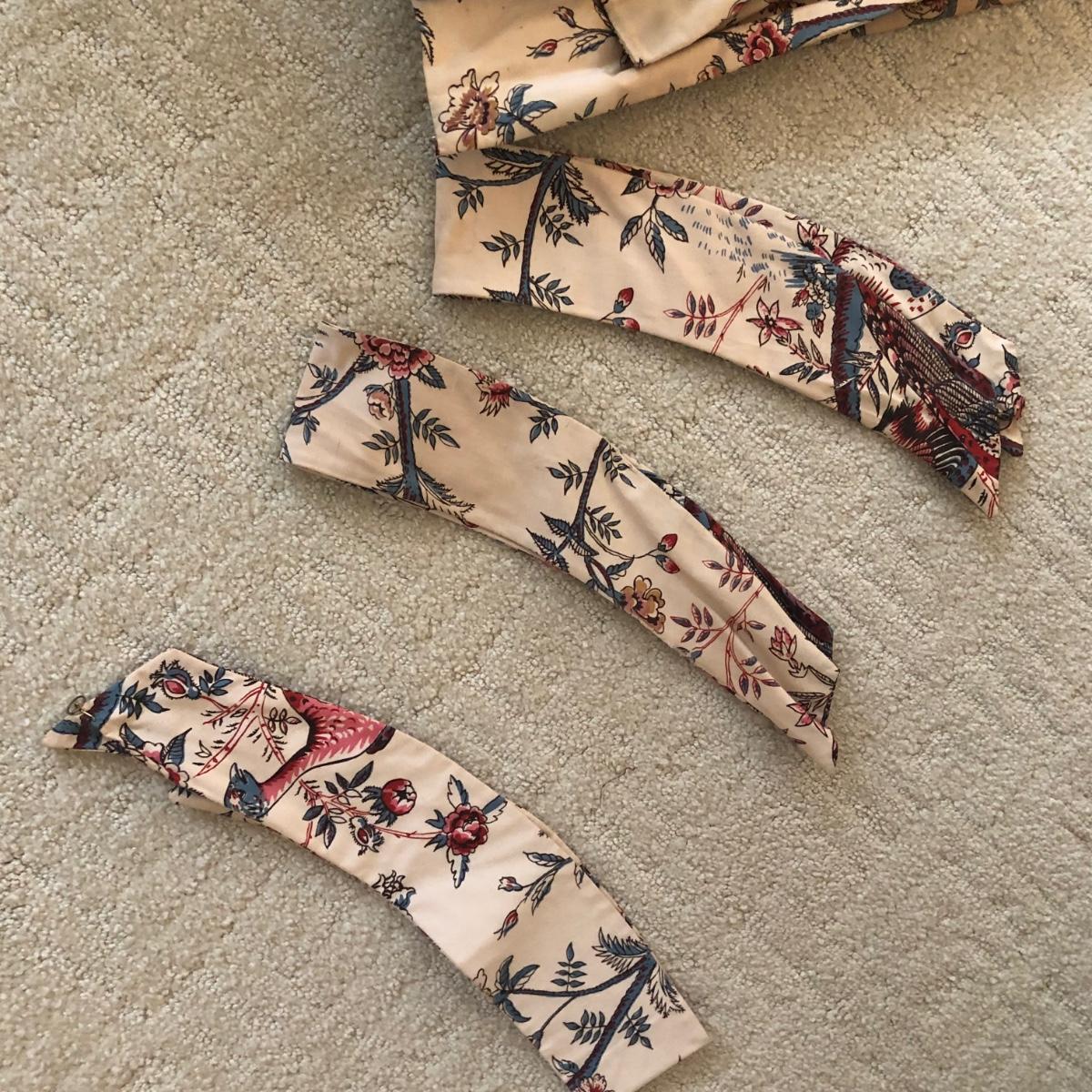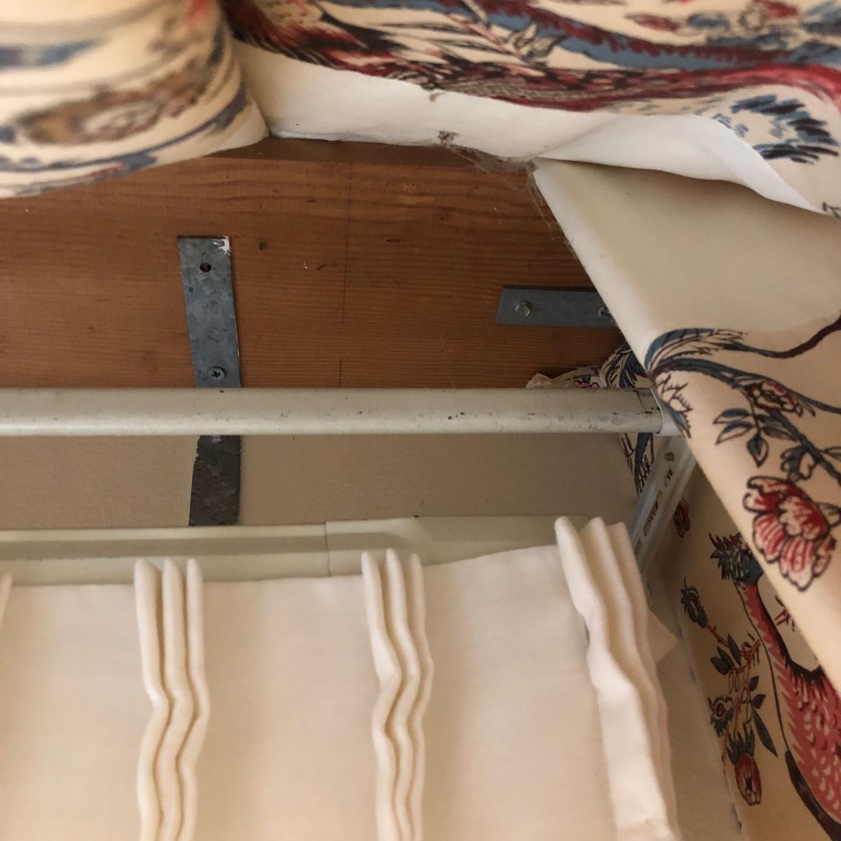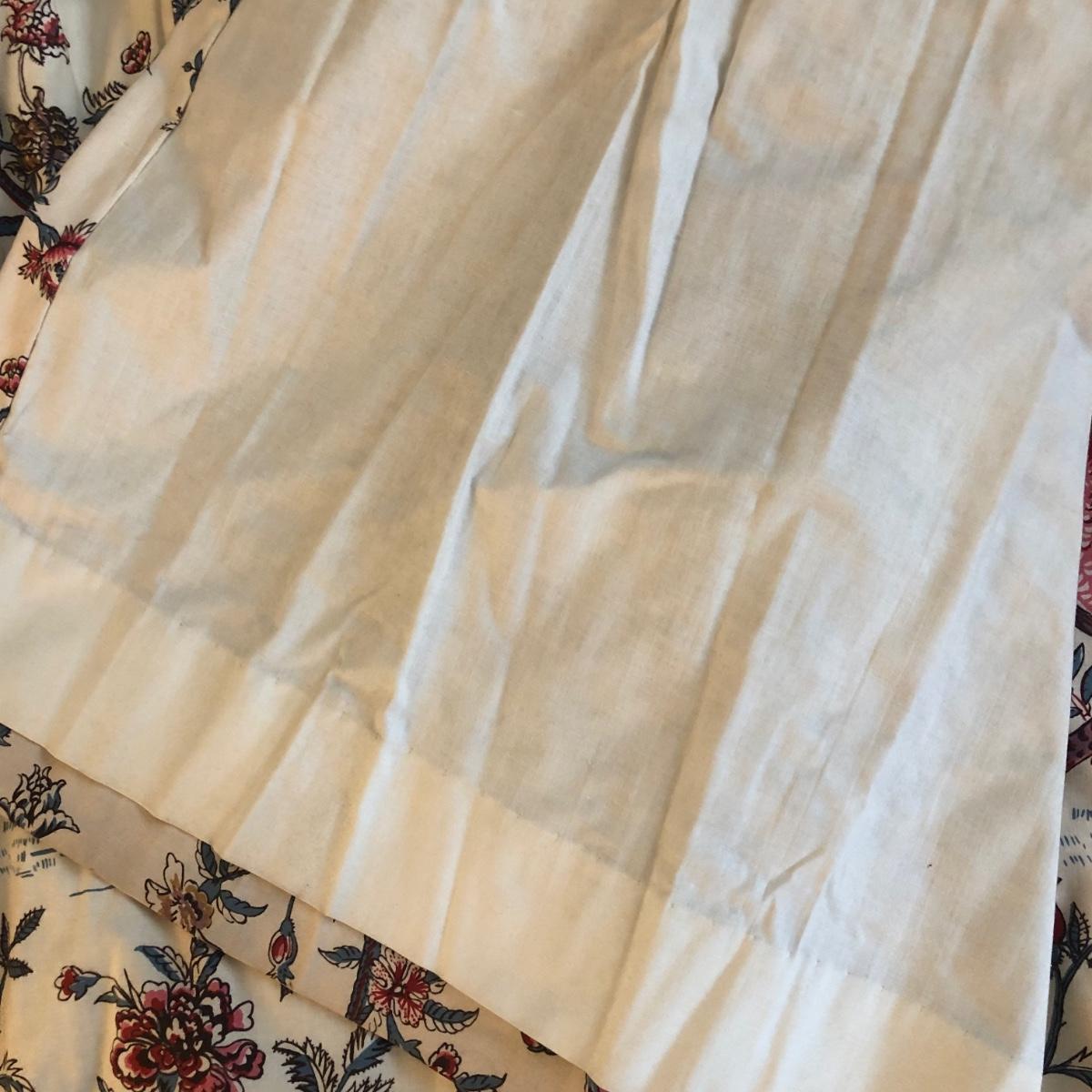 This lot includes two peacock valances which are mounted to the wall. Buyer will need to remove them from the wall (screwdriver needed or drill) and are welcome to take the wooden mounts. Both valances extend about 7.5” from the wall and are 18” long. The lengths vary with the shorter valance being about 114” and the longer one being 168” long. Each panel has ten metal clips at the top and each are 33” wide - at the top. Each panel is 83” long and lined from top to bottom. There are also four tie backs. Please note that there are faint water marks on three of the panels (see pictures). Shipping Available.