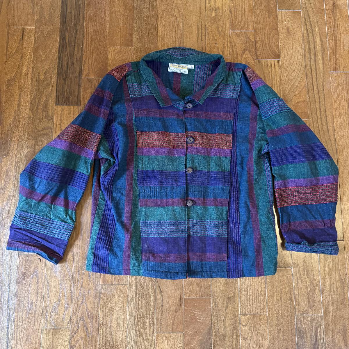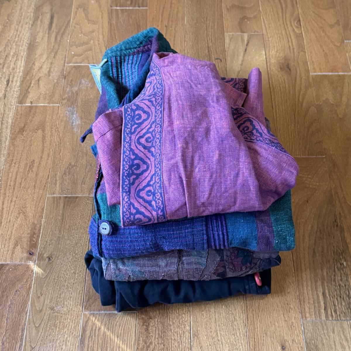 This lot includes one Skye Smocks jacket -size large, one light brown coat - size small/medium, one Two Lips originals jacket - size small, and a purple shirt by The Association for Craft Producers - size M/L. Shipping available.