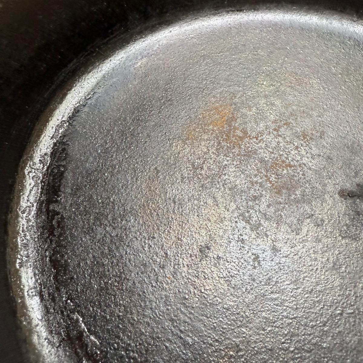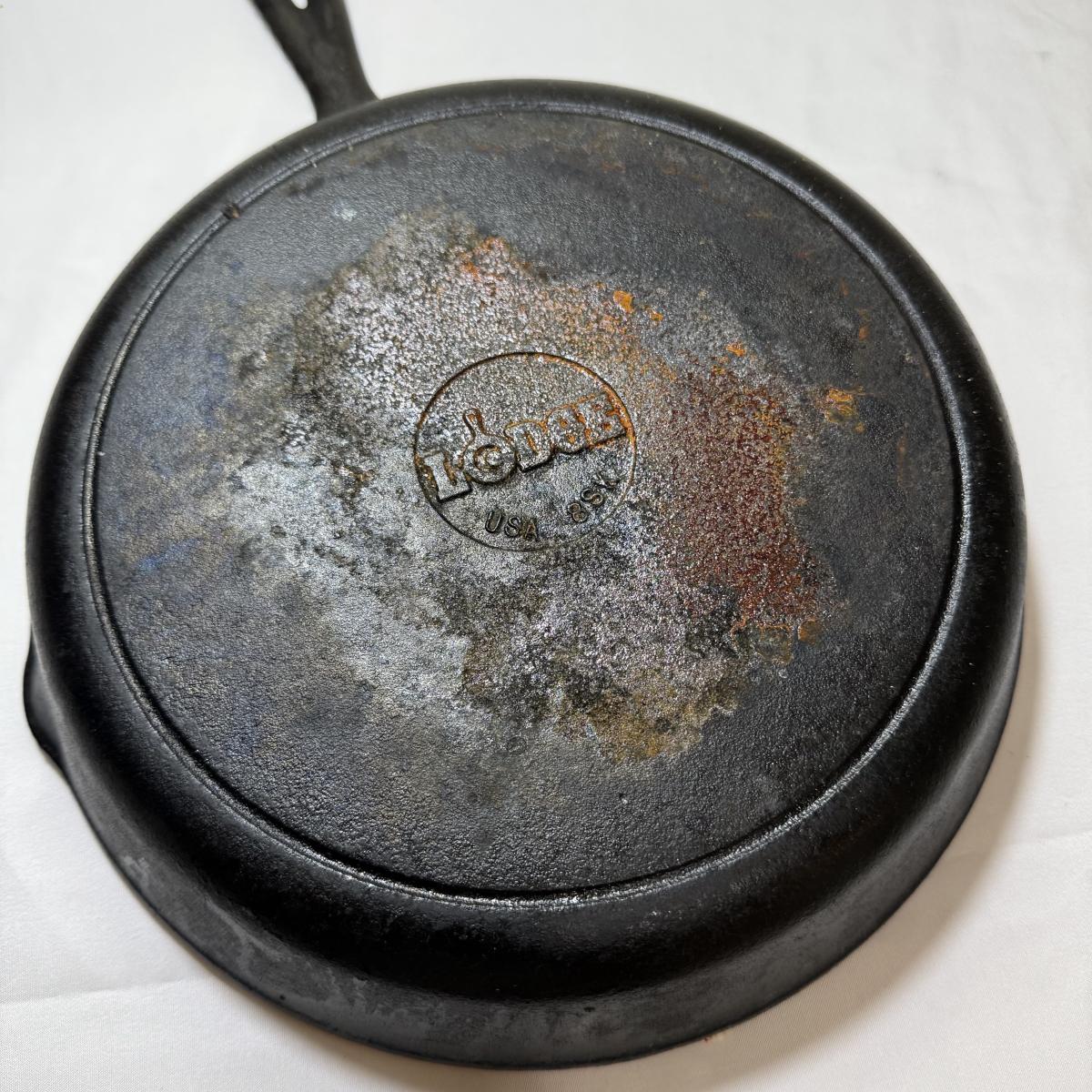 Two Lodge brand cast iron pans. The larger is 10“D and the smaller is 8“D. They both appear to be well seasoned, and the larger pan has some rust on the bottom.