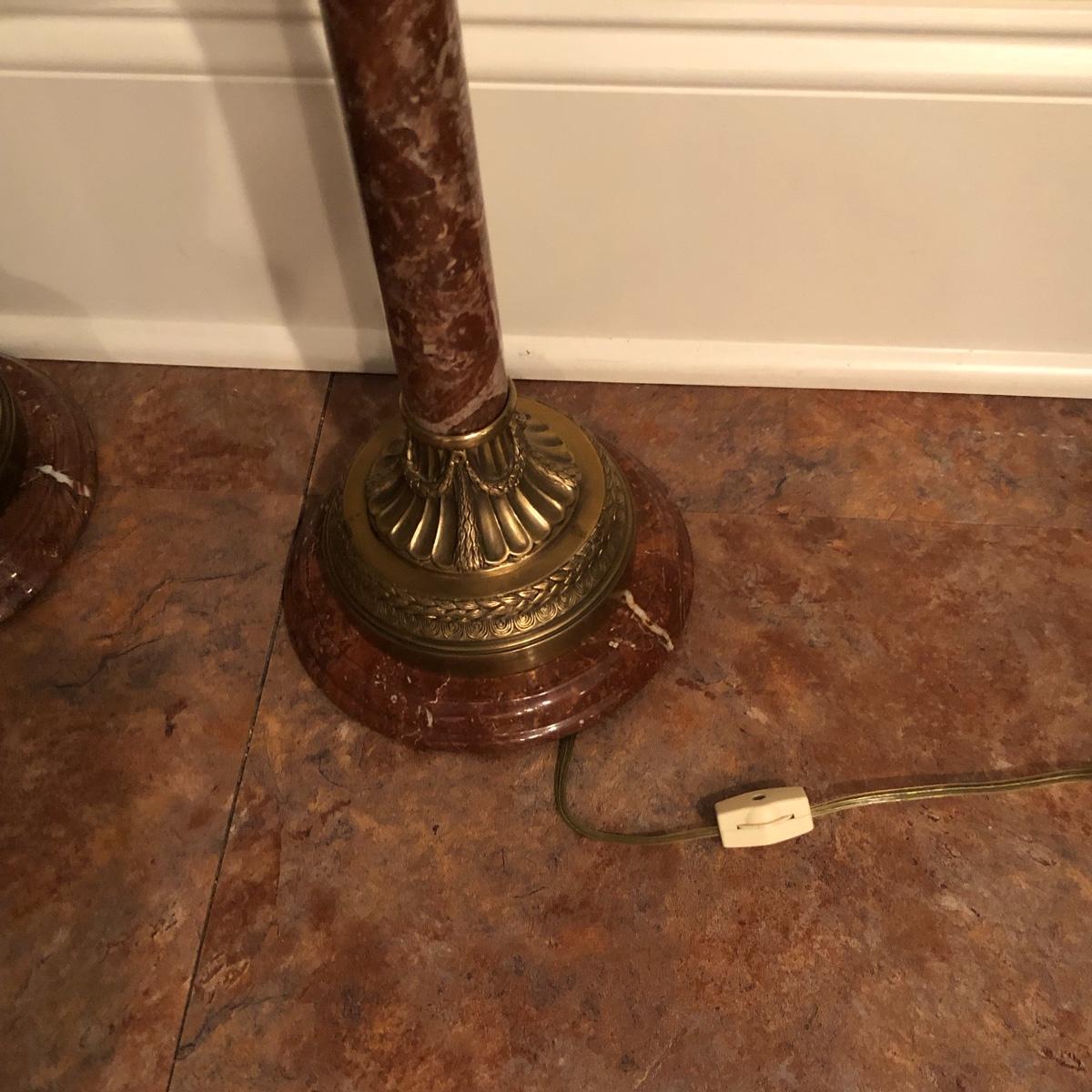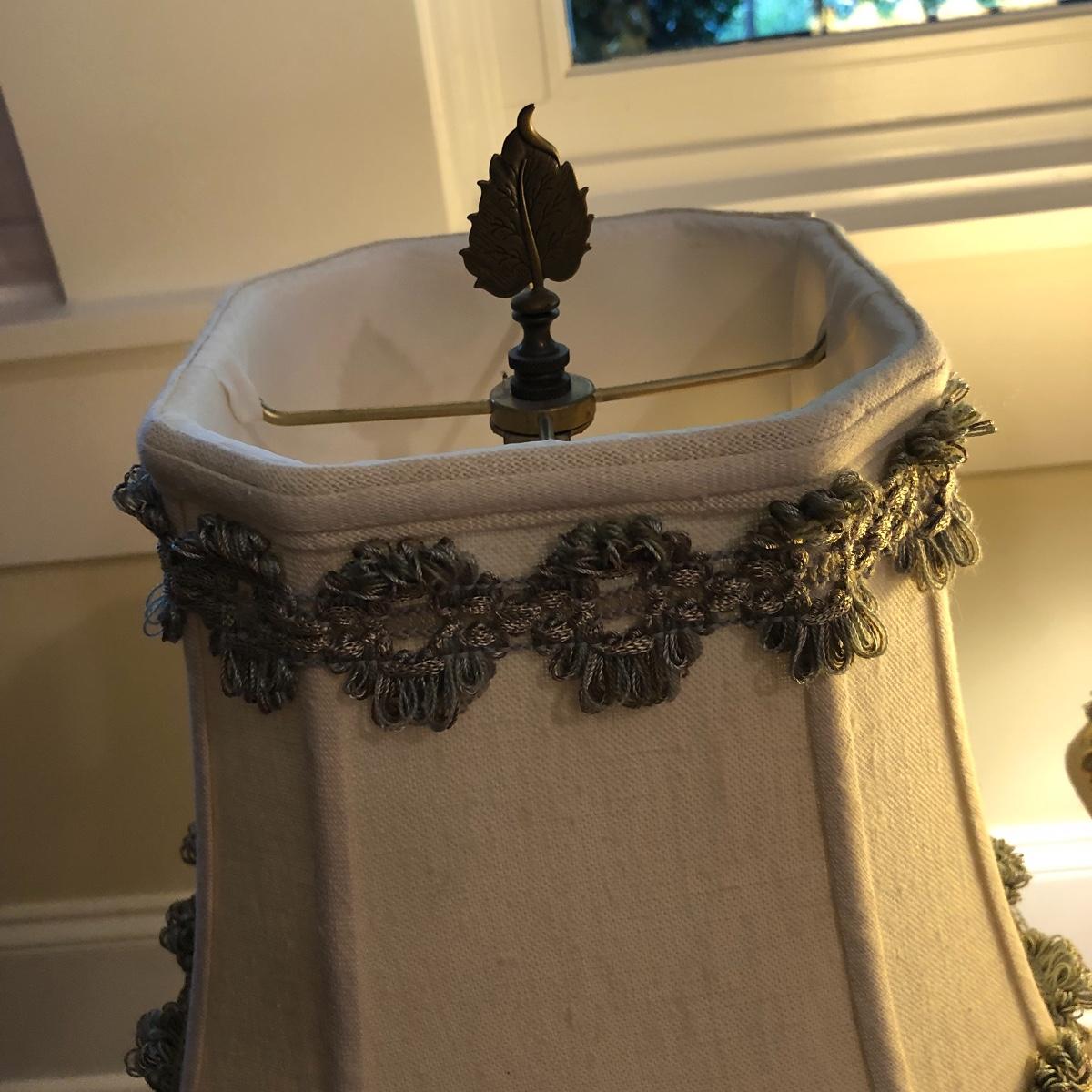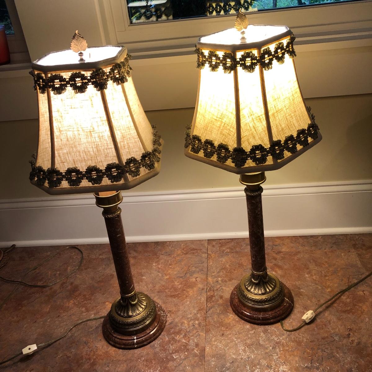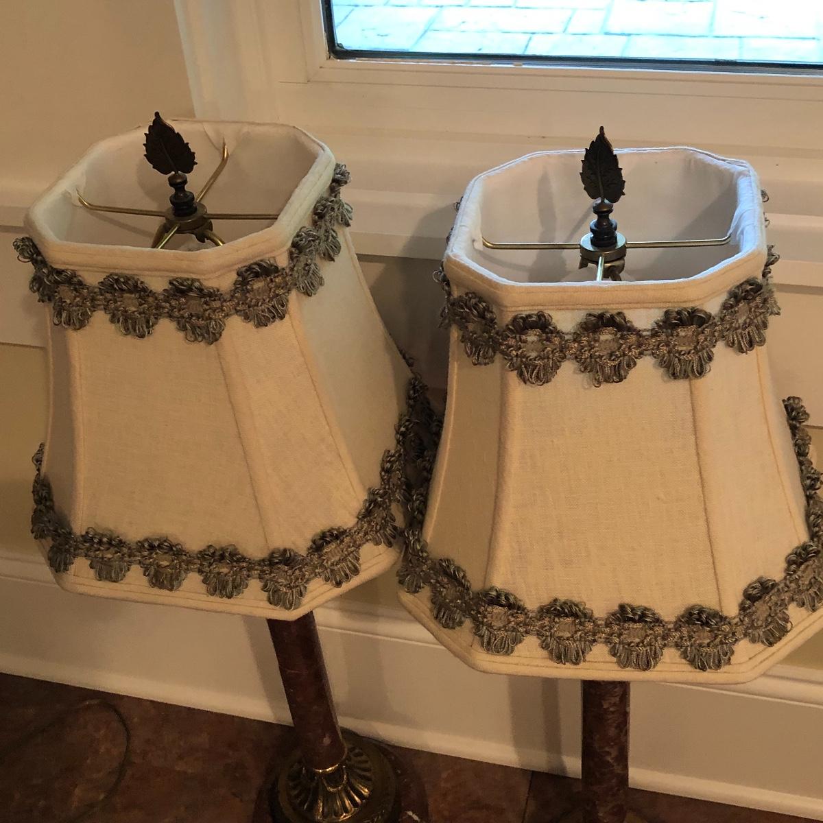 Two marble like lamps with with decorative embroidered circular tassels.The finials are sculpted leaves. The lamps measure approximately 31” tall with the base measuring 7” in diameter. Local pick up only.