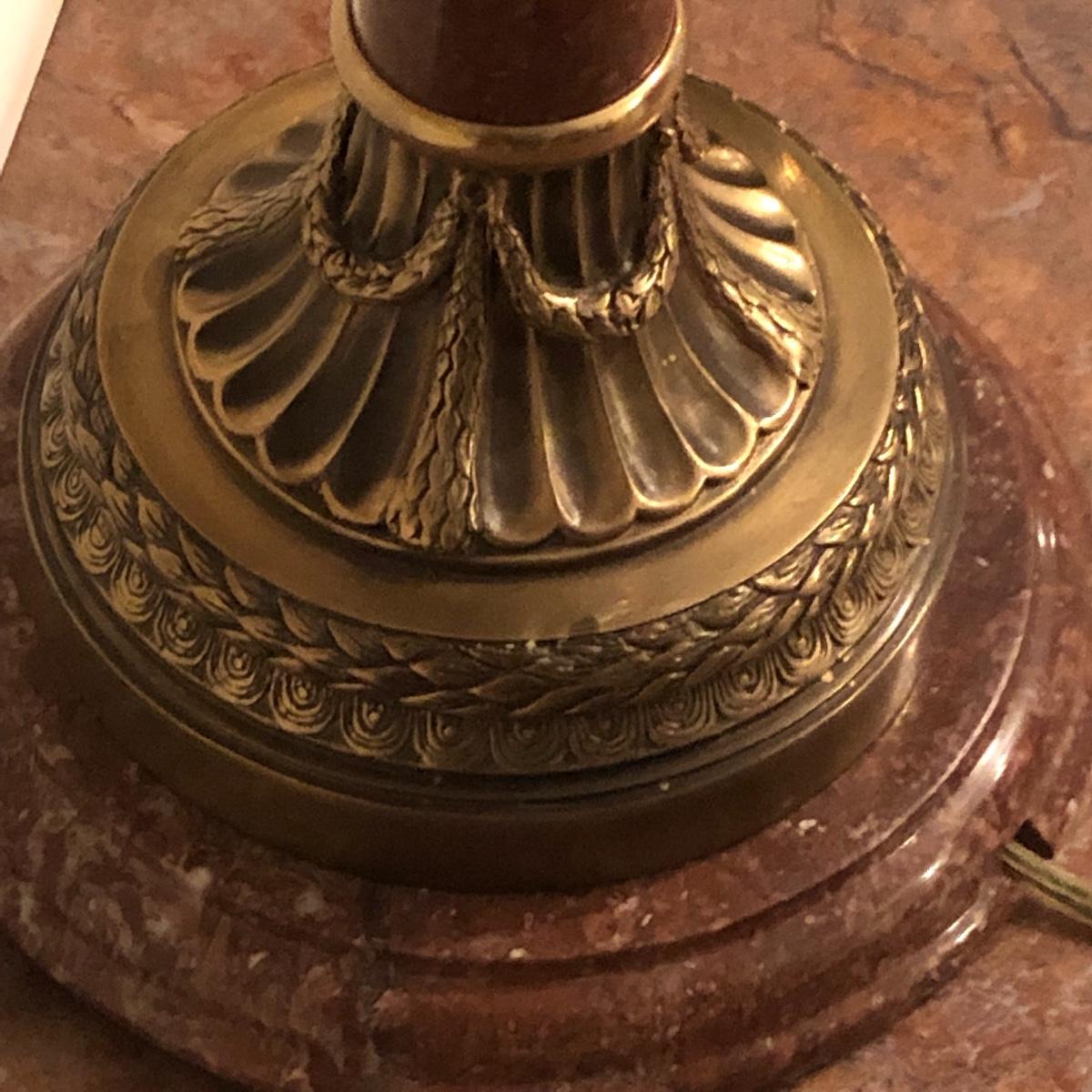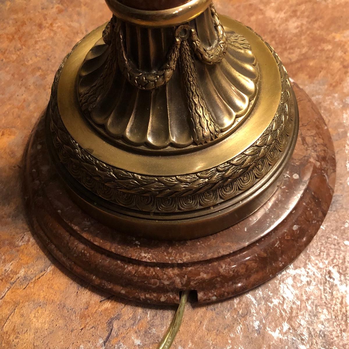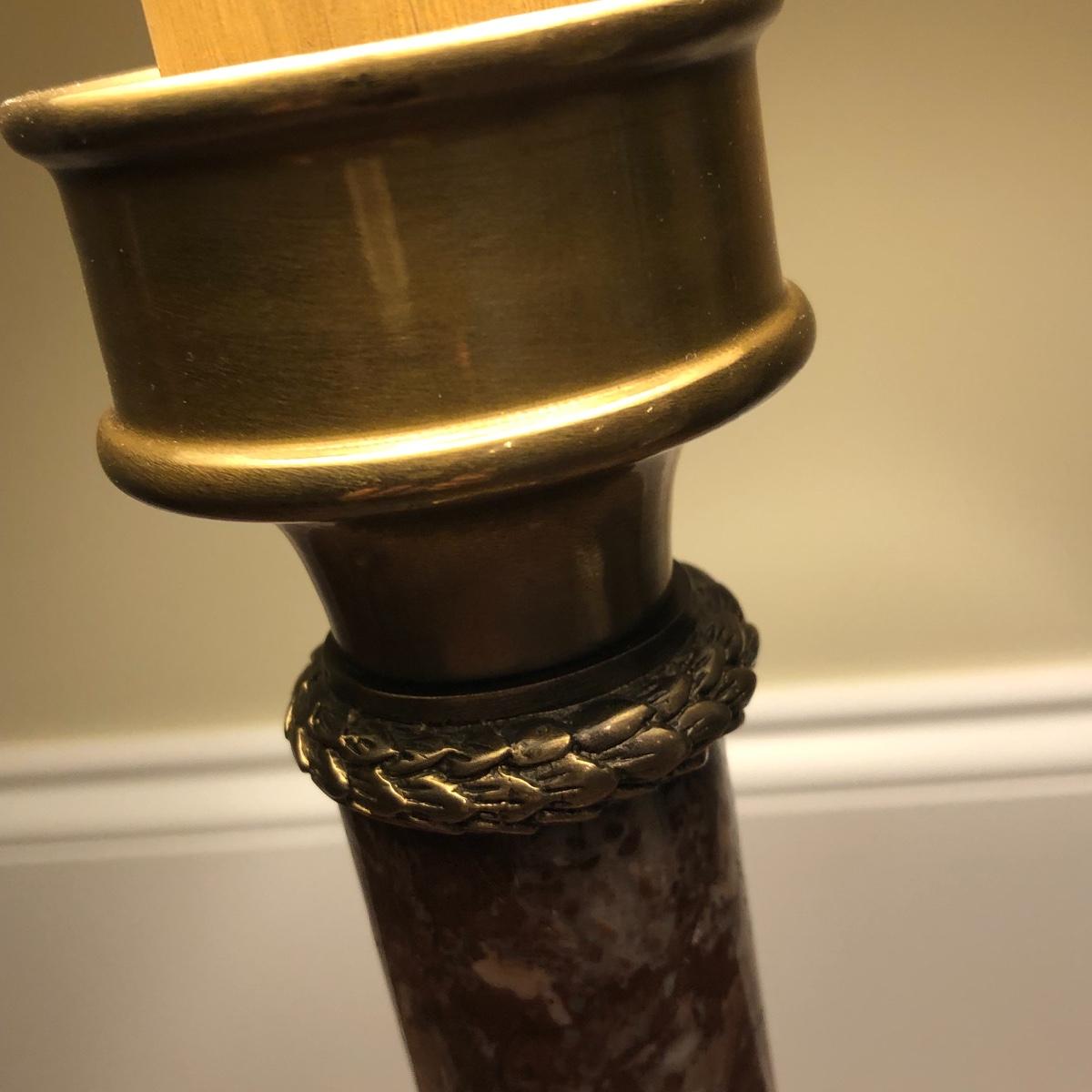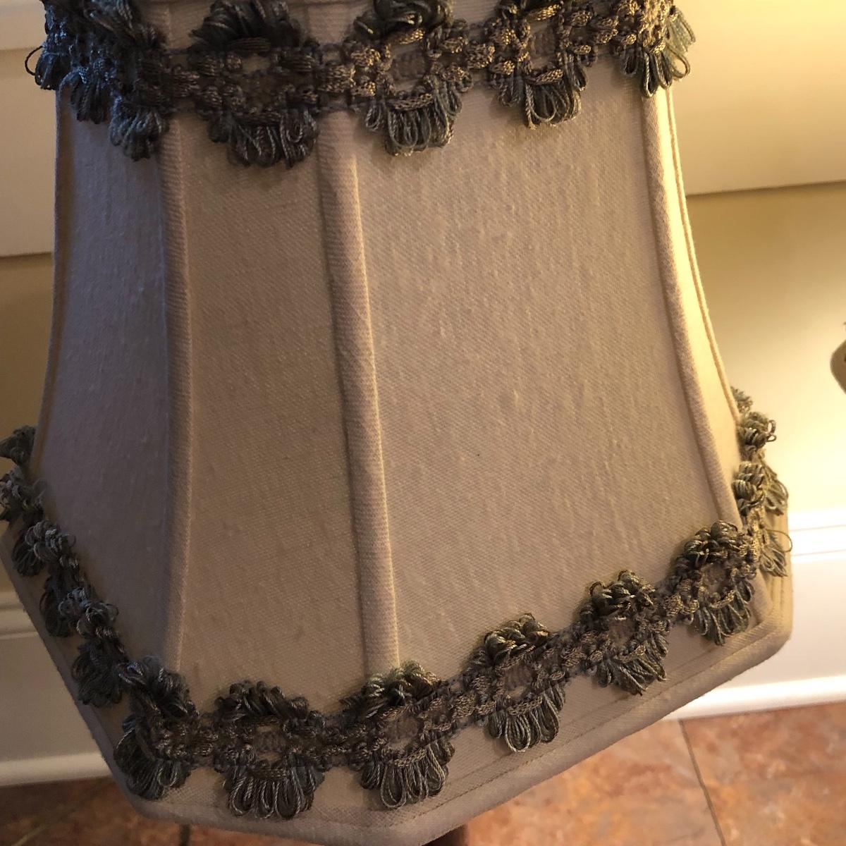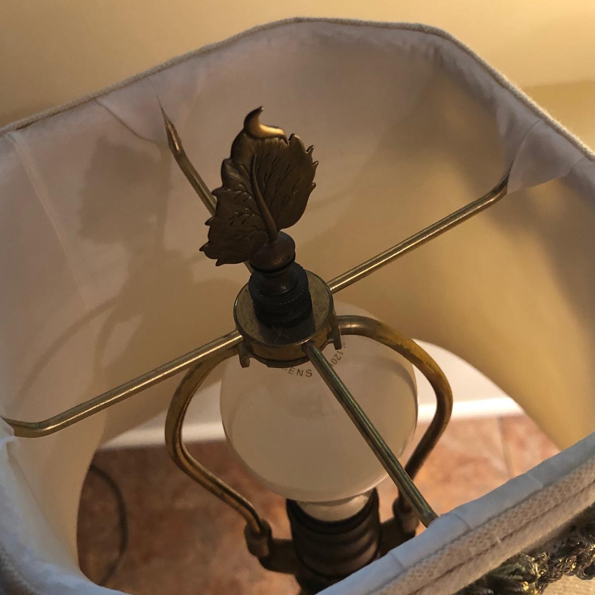 Two marble like lamps with with decorative embroidered circular tassels.The finials are sculpted leaves. The lamps measure approximately 31” tall with the base measuring 7” in diameter. Local pick up only.