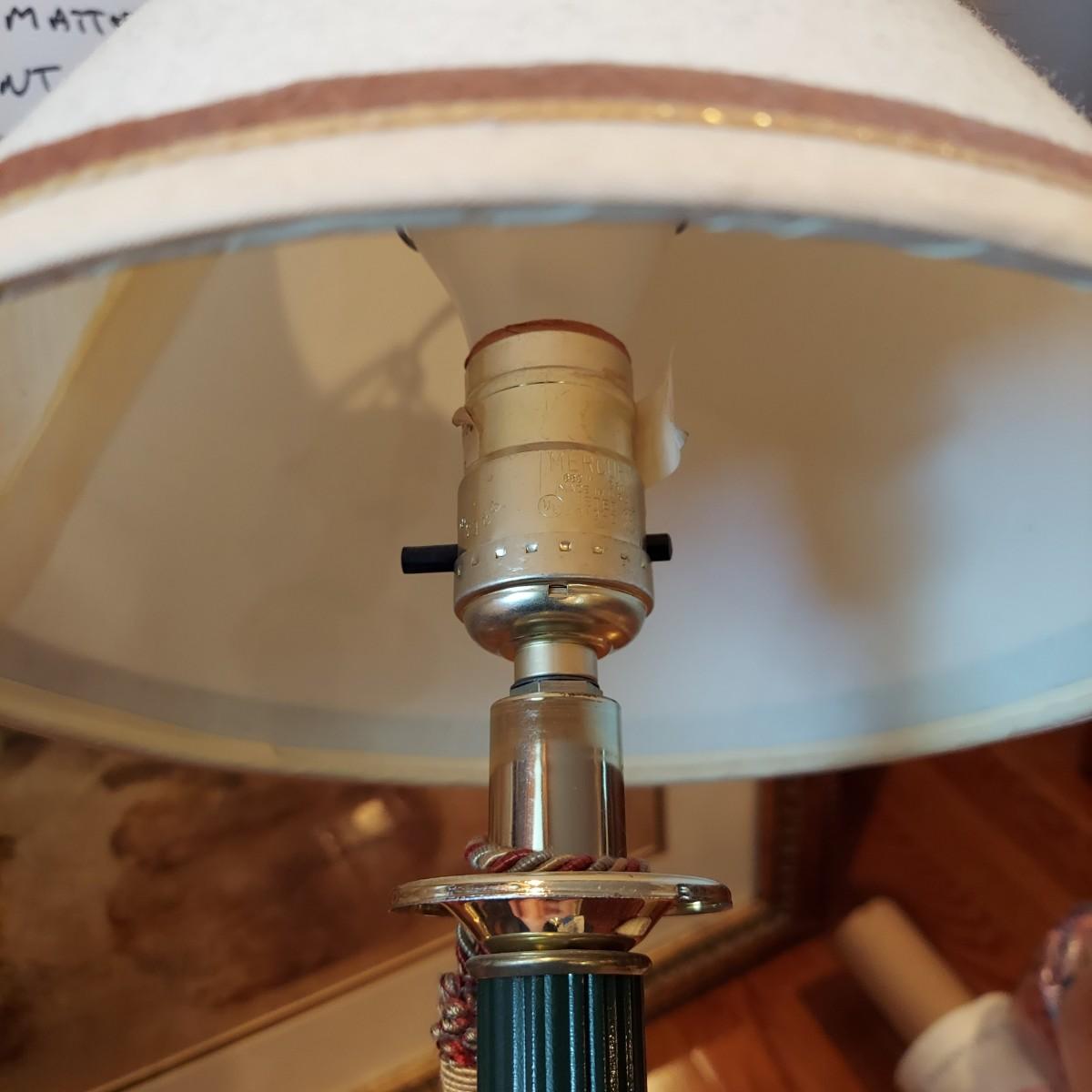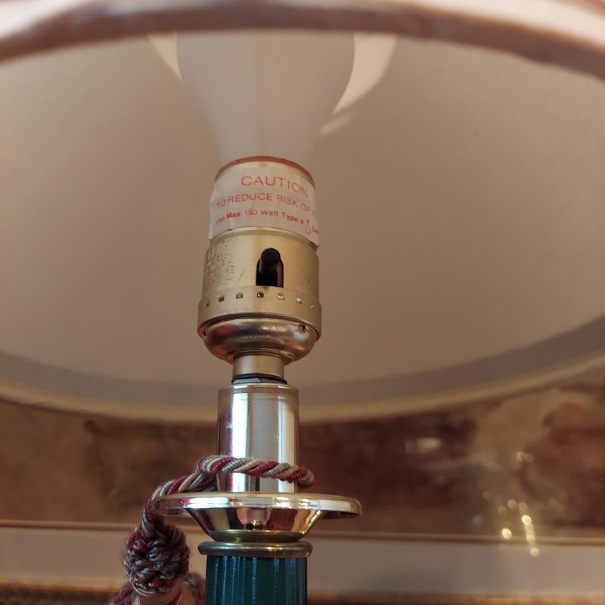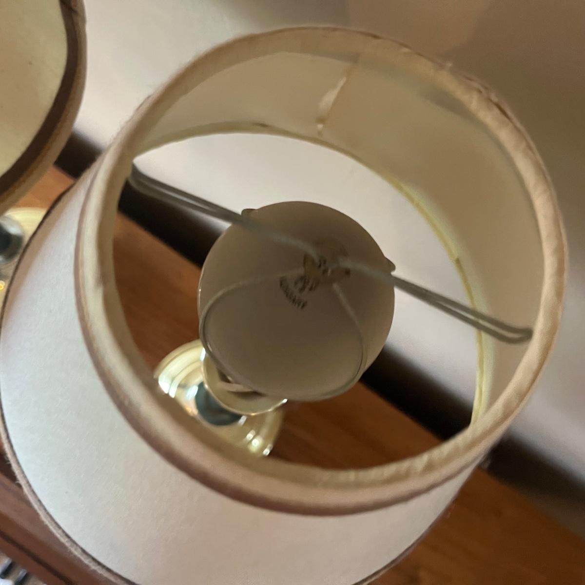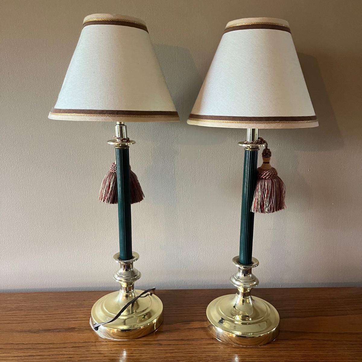 Lot includes two matching lamps with brass colored accents. Lamps measure 9”D x 23”H including shade. Both turned on when plugged in.