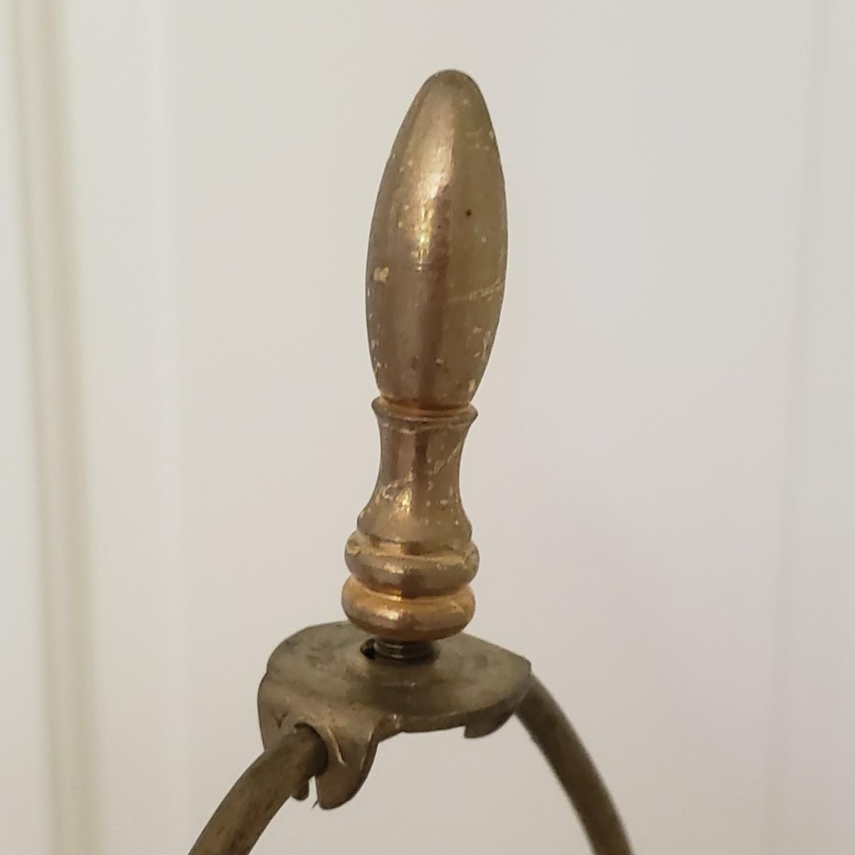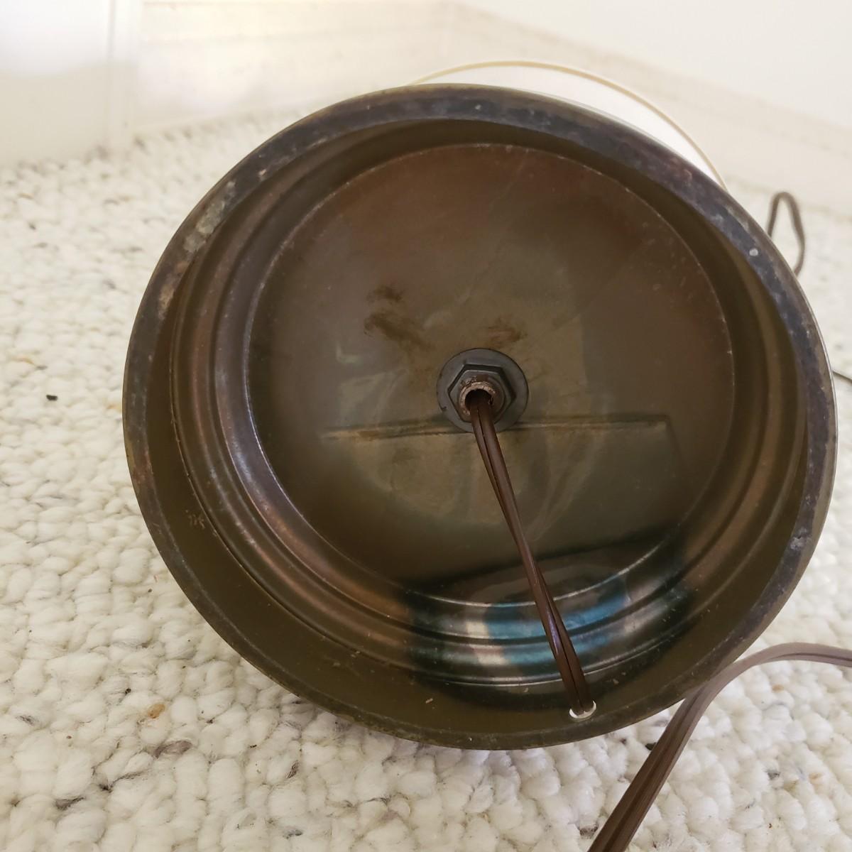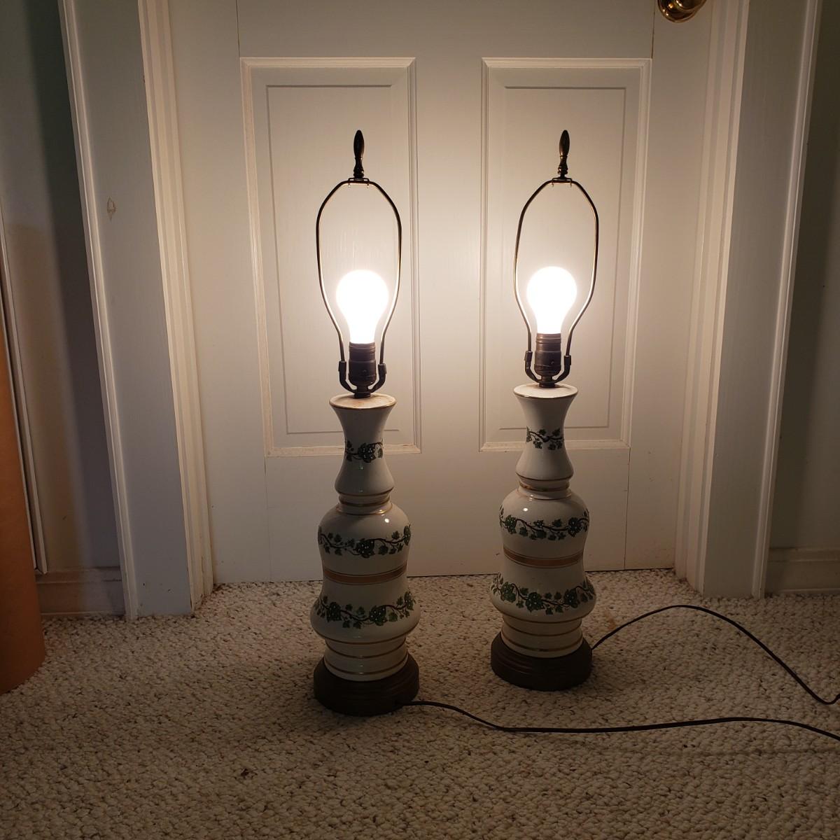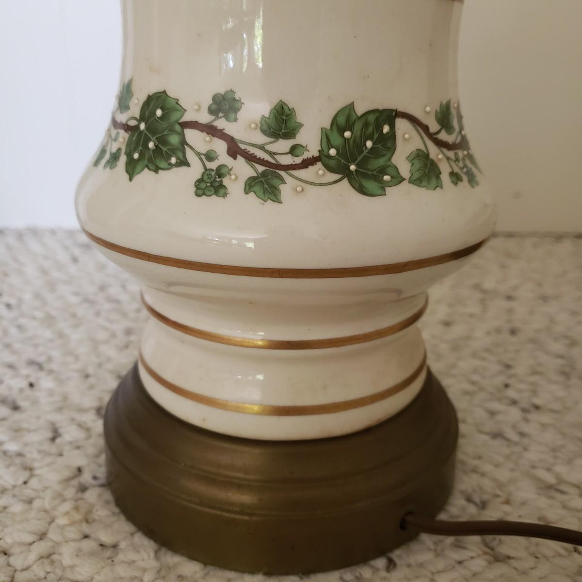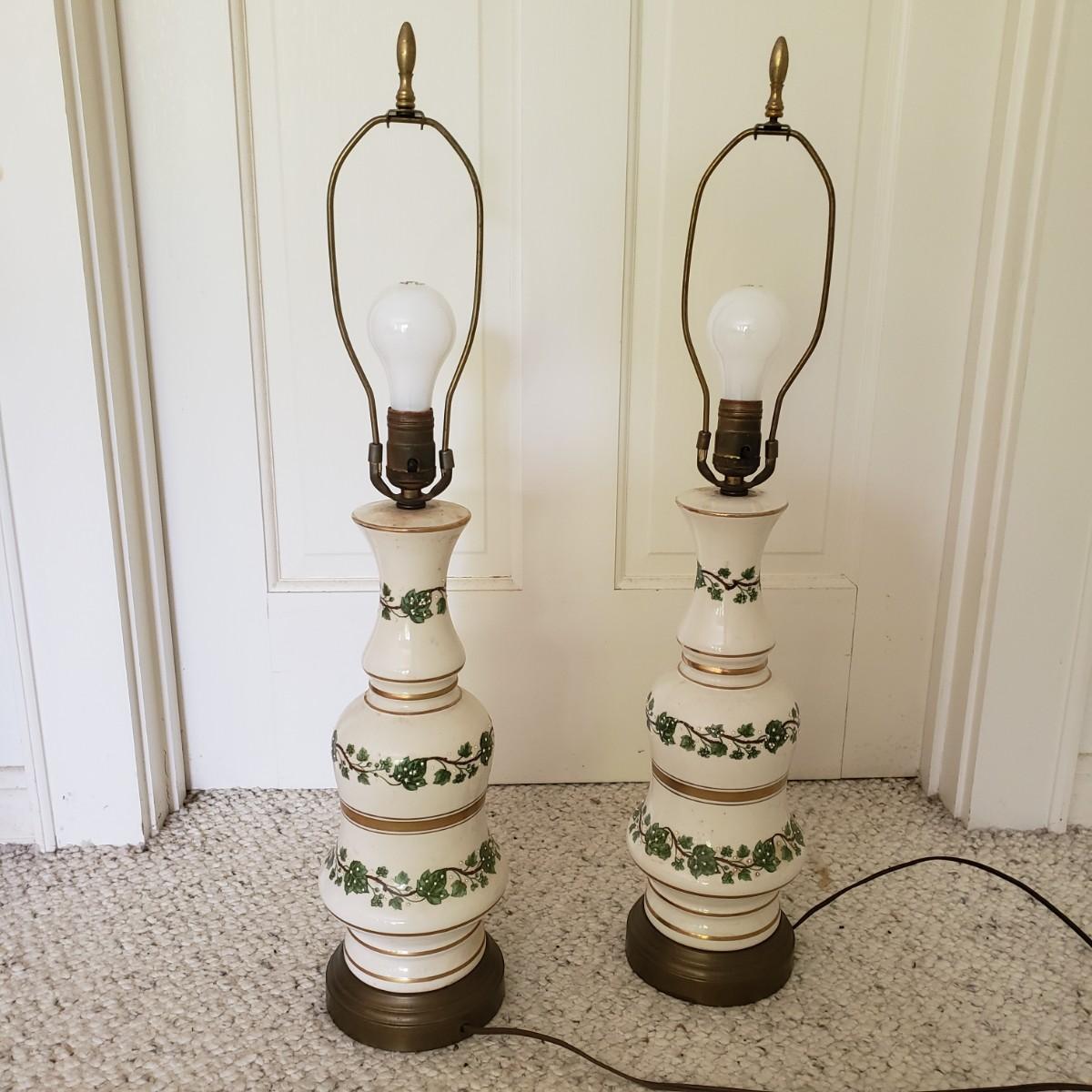 Two matching lamps with ivy and gold stripes on metal bases. Both power on when plugged in. The lamps measure 6" x 28"H. The invy pattern has textured white dots. One of the lamps has an electrical taped cord.