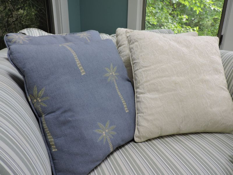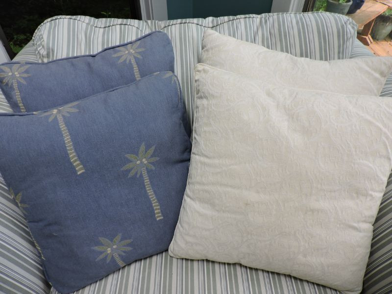 Two blue pillows with tan and green palm trees and two cream brocade accent pillows. 18” square