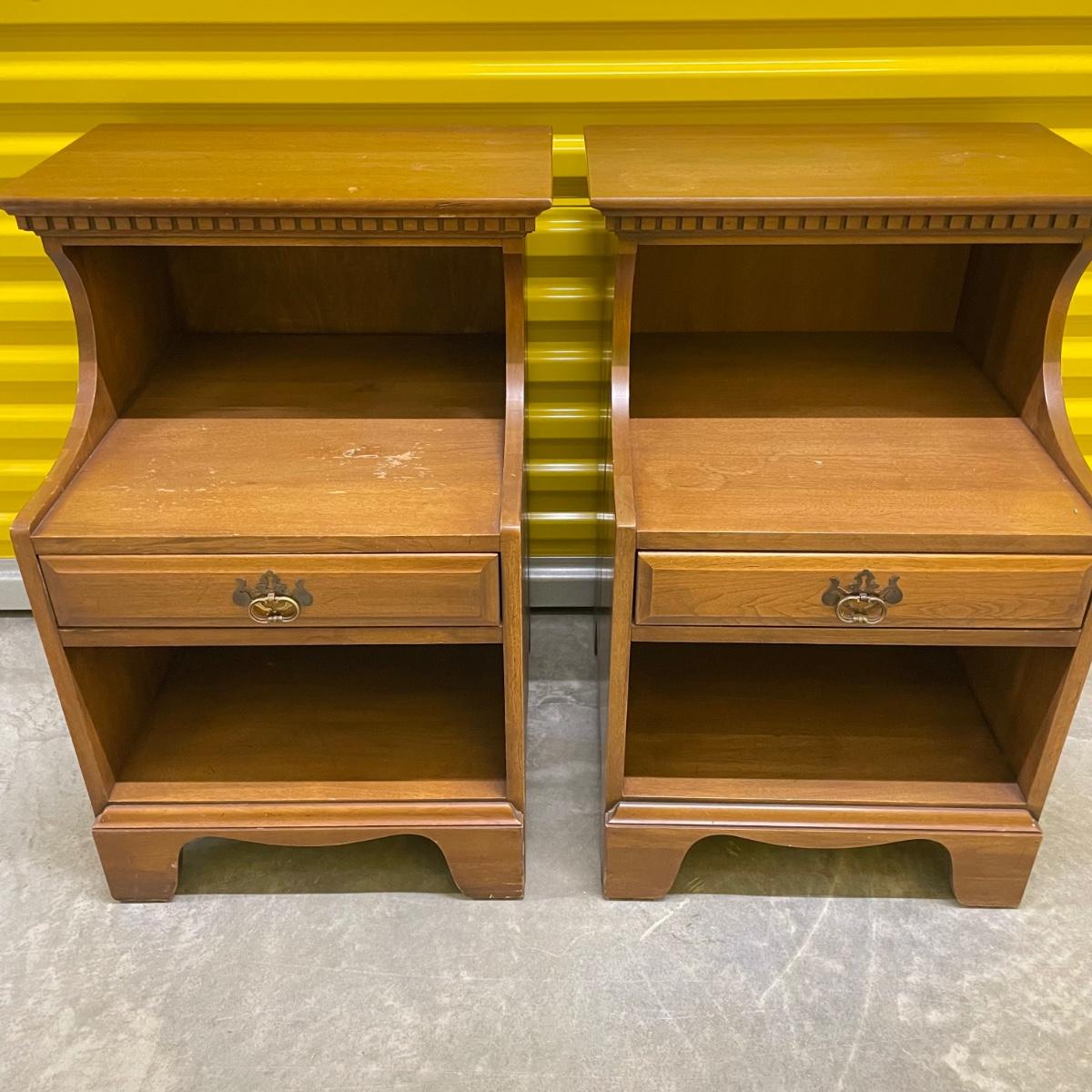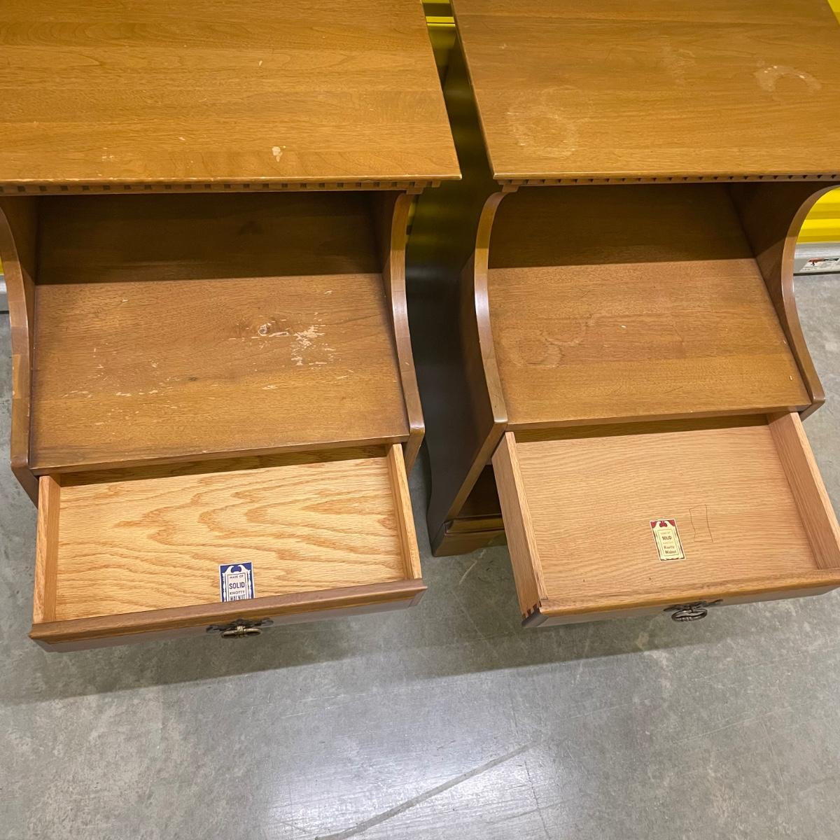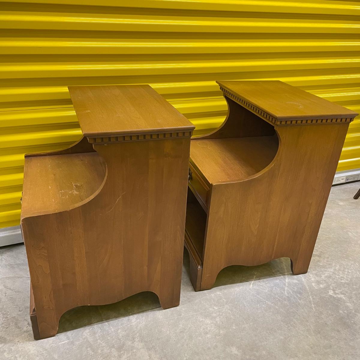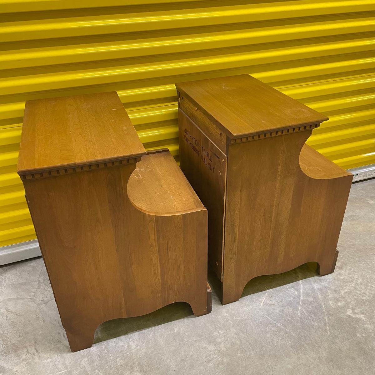 Two solid walnut bedside step tables from Davis Cabinet Co with ample storage and one dovetail drawer. Both tables have blemishes on the table top and top shelf. These sturdy pieces measure 20.25” x 19.75” x 28.25”. Tables match a Davis Cabinet Co dresser that can found in another lot in this sale. See images. Local pick up only.