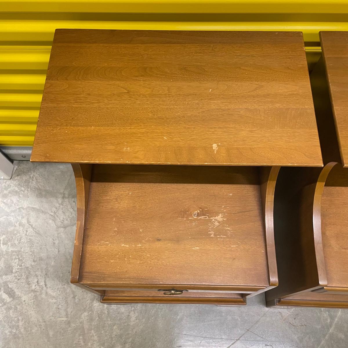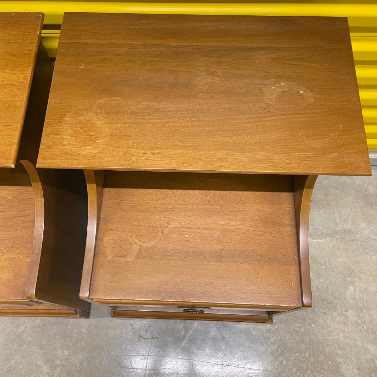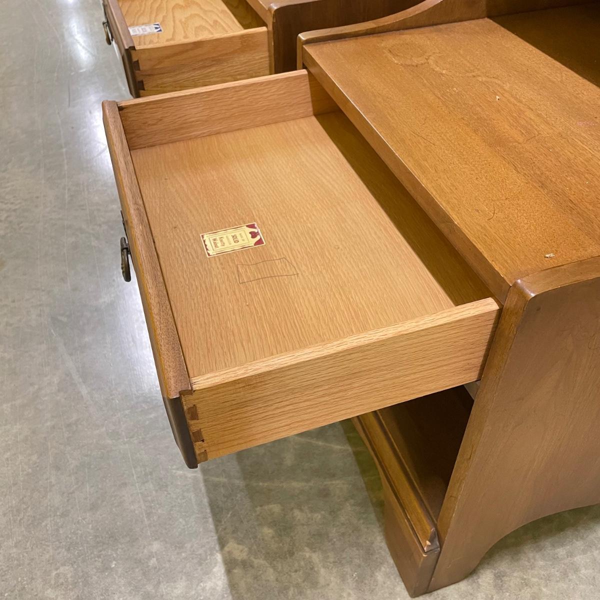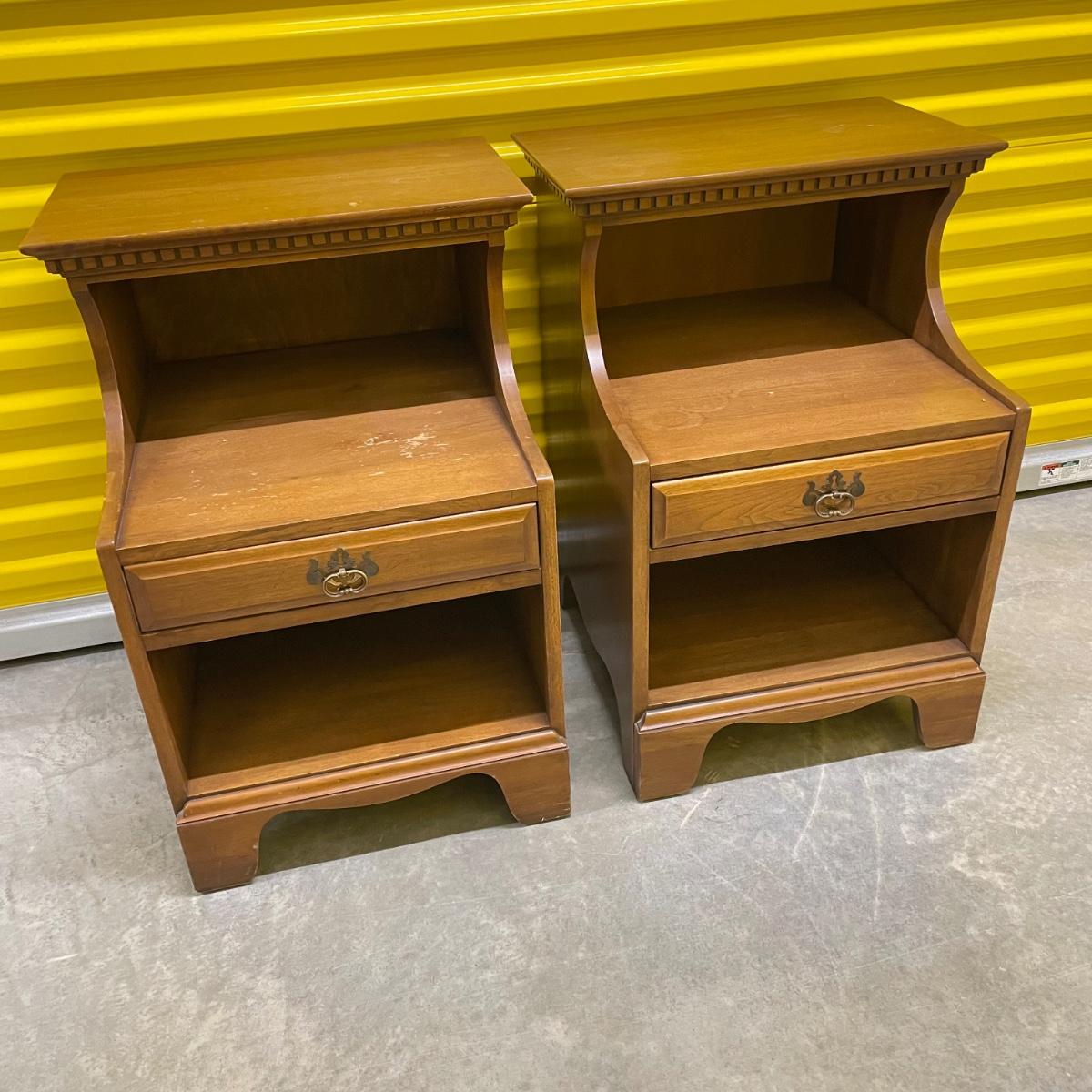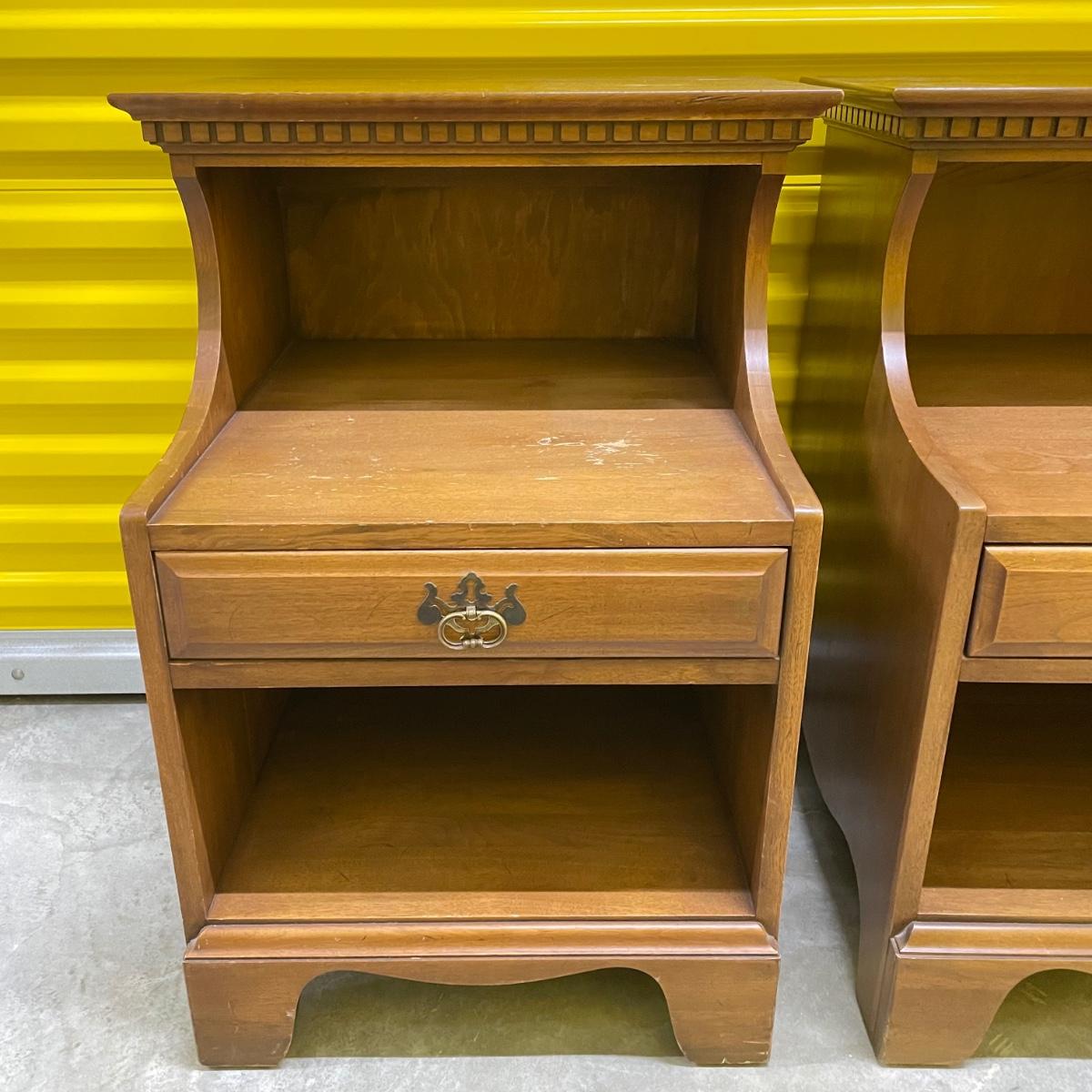 Two solid walnut bedside step tables from Davis Cabinet Co with ample storage and one dovetail drawer. Both tables have blemishes on the table top and top shelf. These sturdy pieces measure 20.25” x 19.75” x 28.25”. Tables match a Davis Cabinet Co dresser that can found in another lot in this sale. See images. Local pick up only.