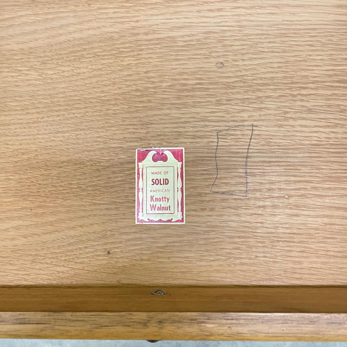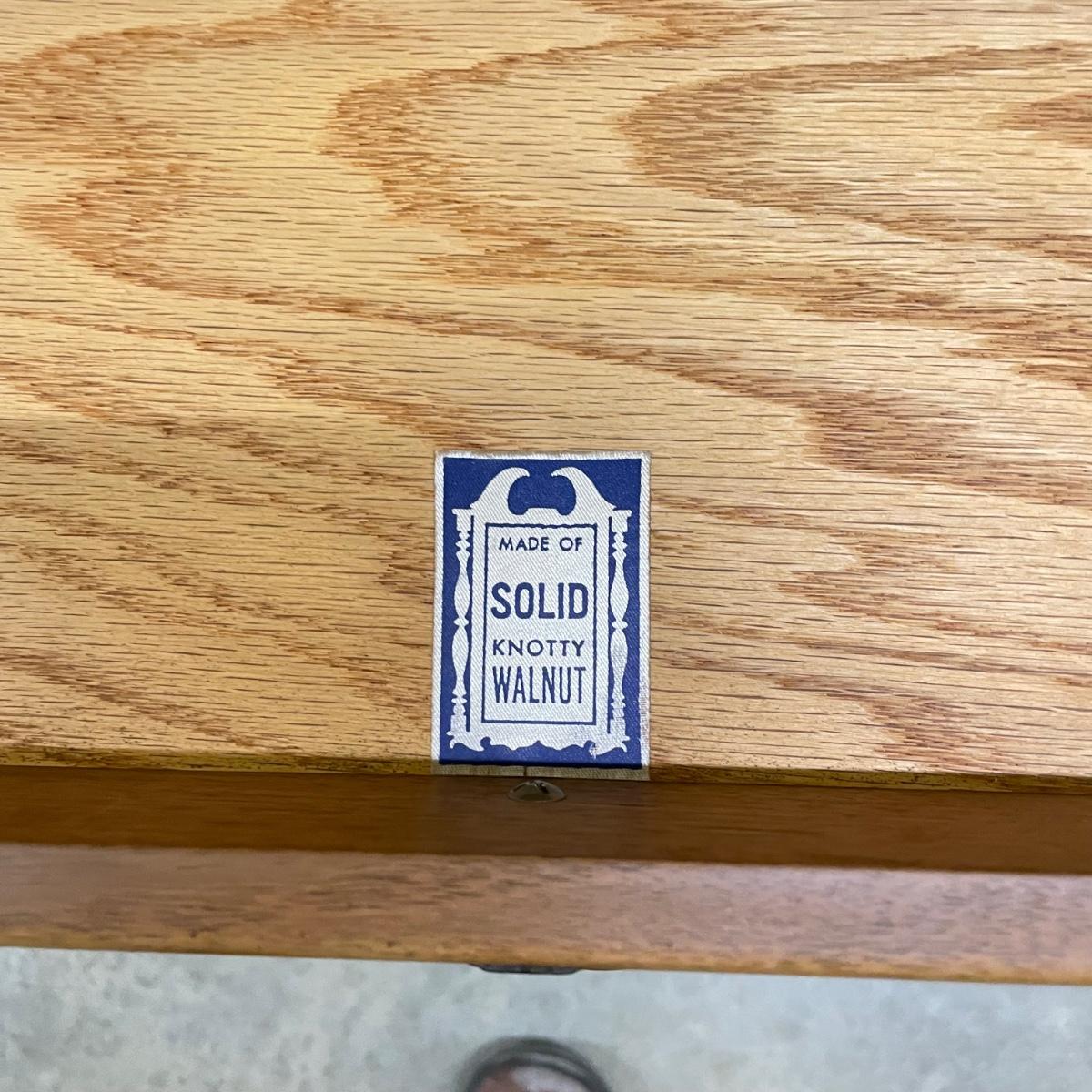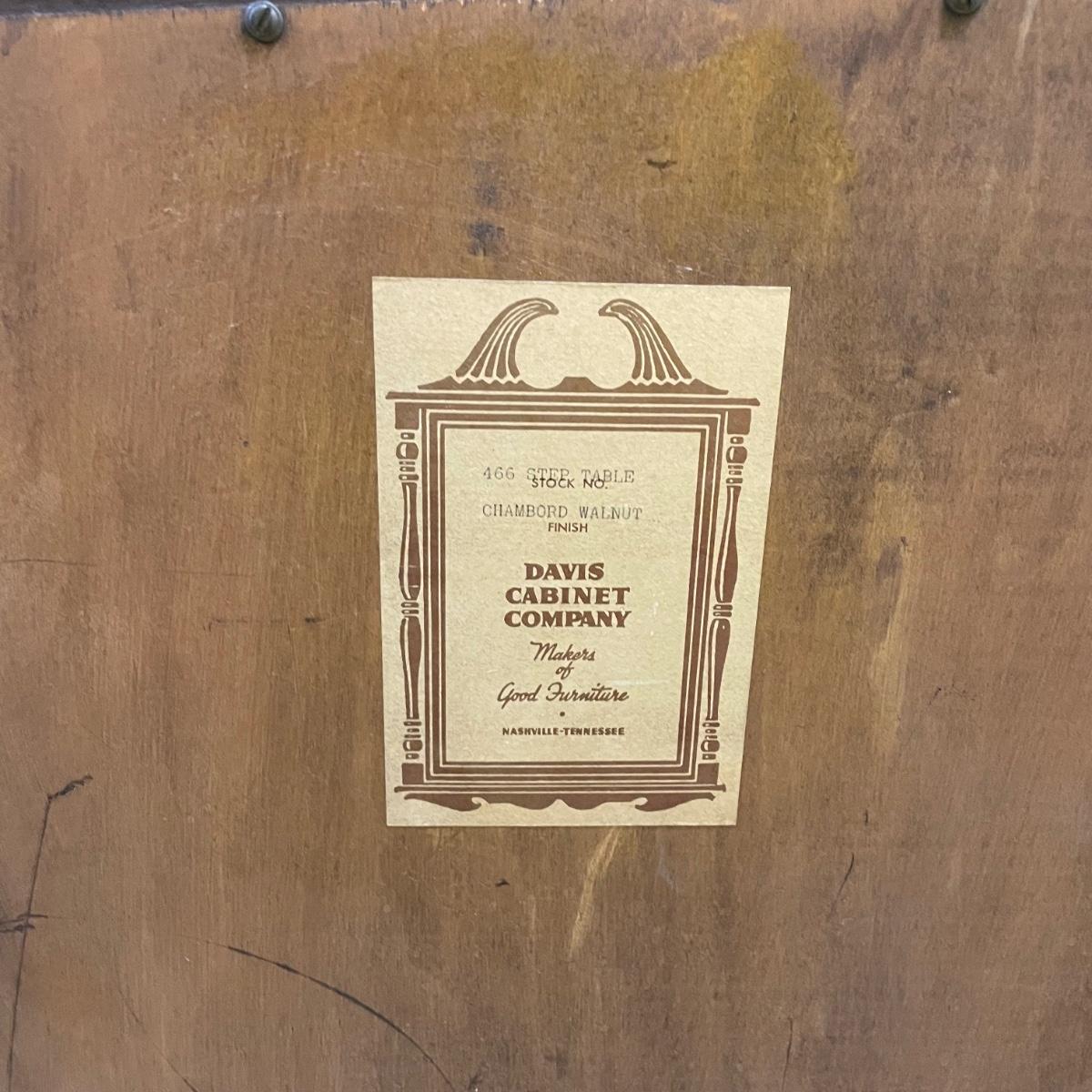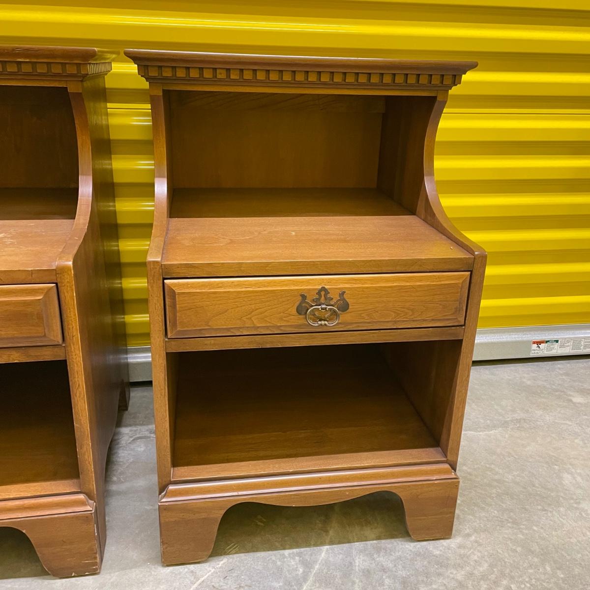 Two solid walnut bedside step tables from Davis Cabinet Co with ample storage and one dovetail drawer. Both tables have blemishes on the table top and top shelf. These sturdy pieces measure 20.25” x 19.75” x 28.25”. Tables match a Davis Cabinet Co dresser that can found in another lot in this sale. See images. Local pick up only.