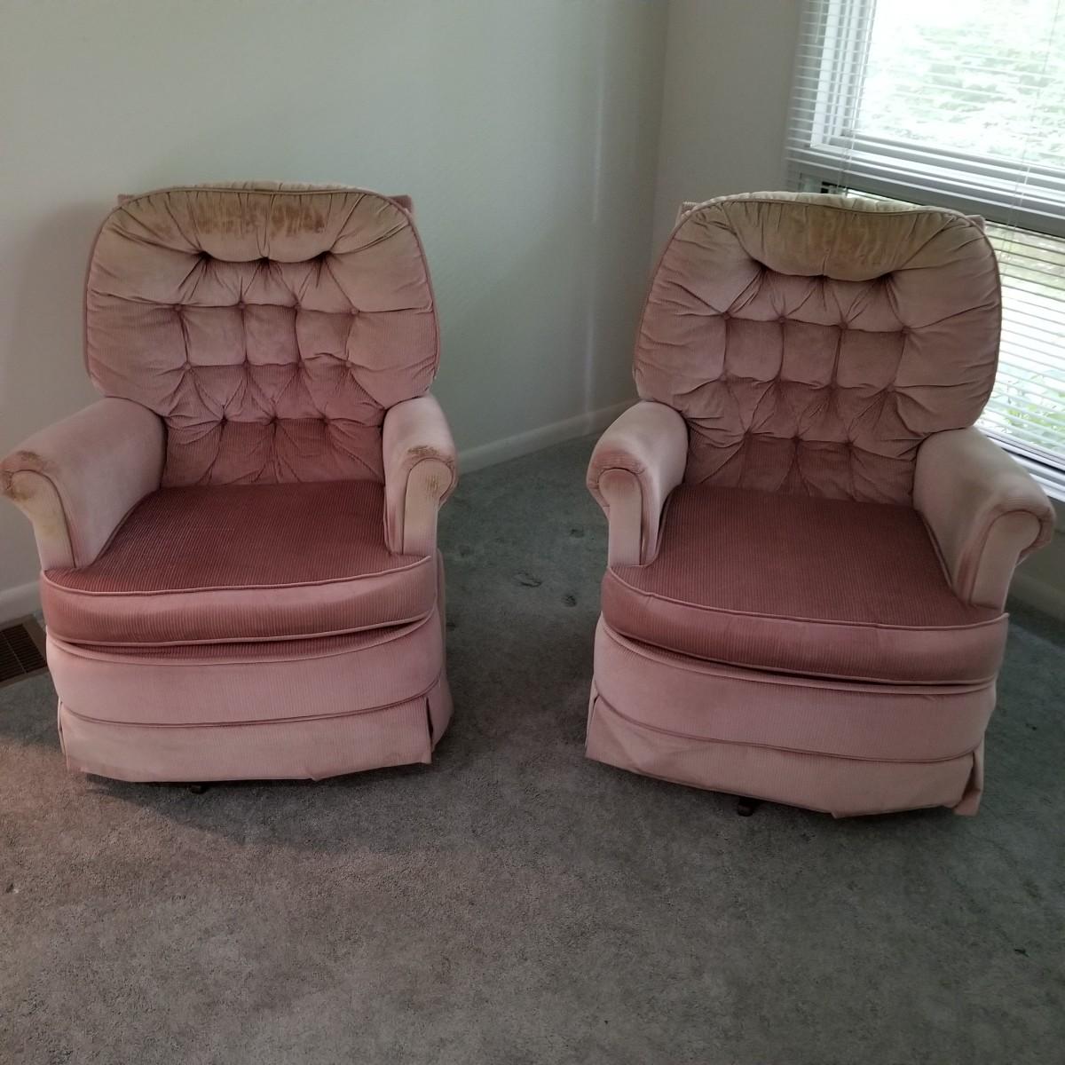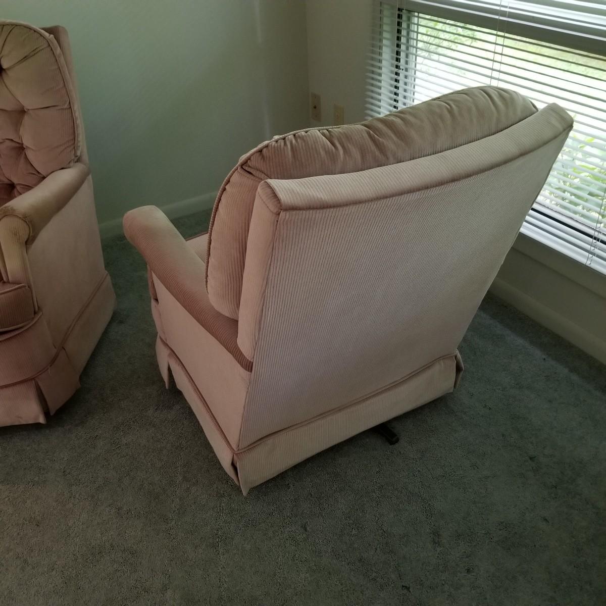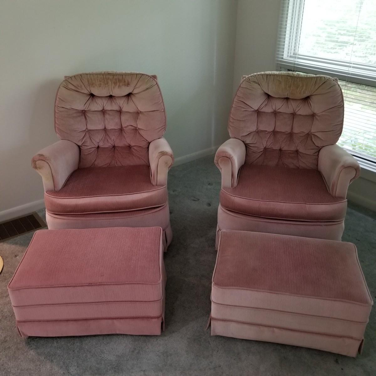 A pair of mauve colored swivel rockers with matching ottomans, made by Les Brown Chair Company.  Button tufted backs with skirts all around.  Micro suede fabric is slightly discolored on arms and headrests. Chairs measure 29"x34"x36" with a 17" seat height. Ottomans are 24"x16"x12" with wood legs. See photos for detail.  Local pickup only.