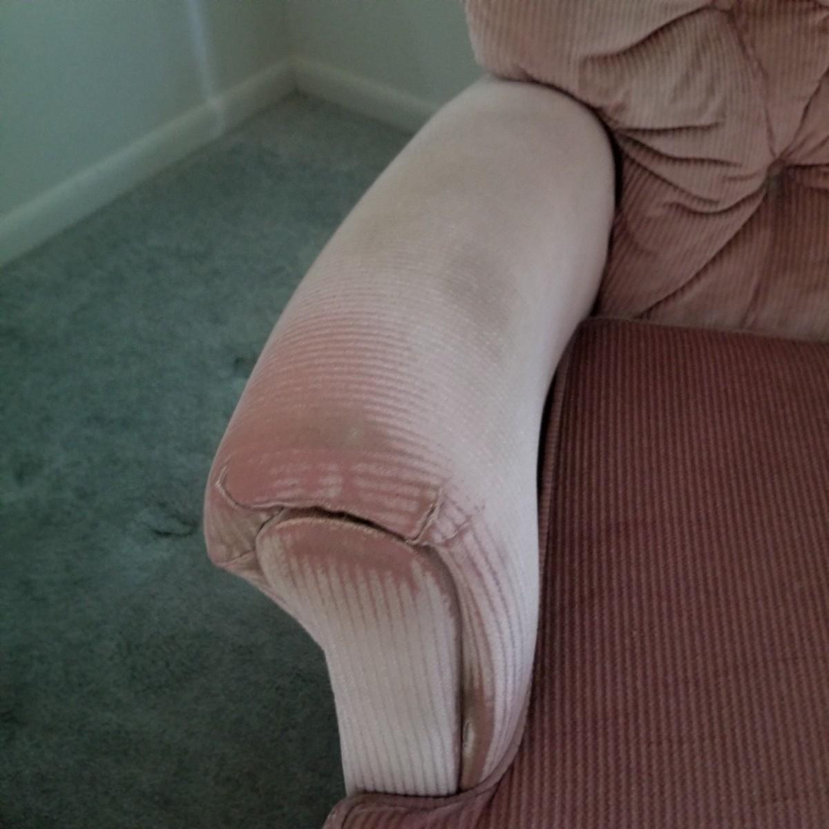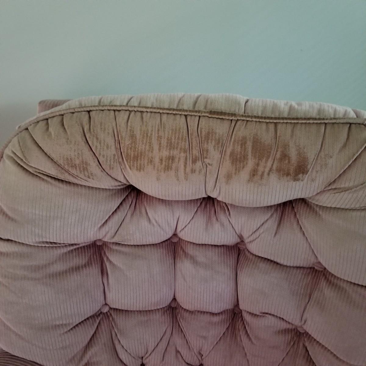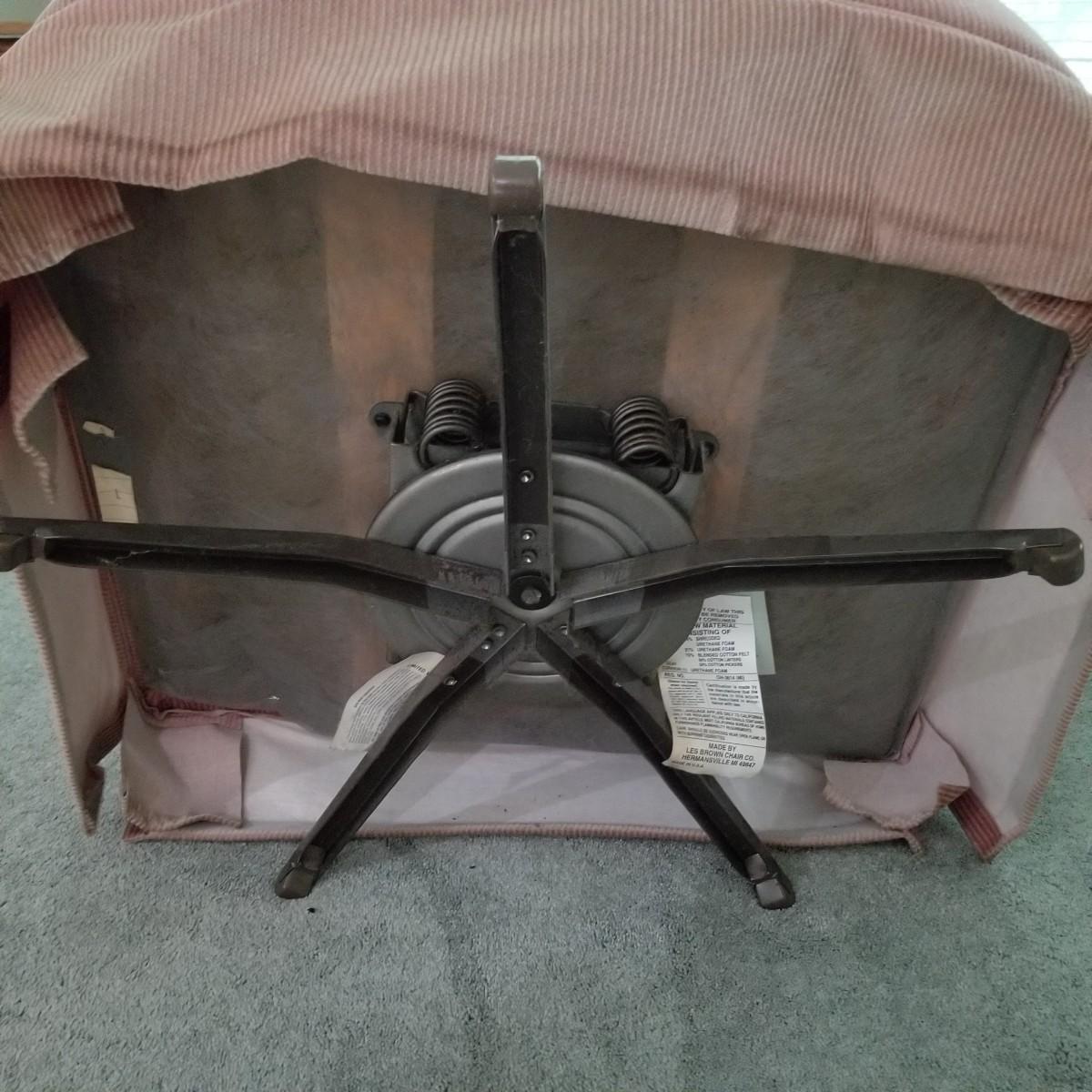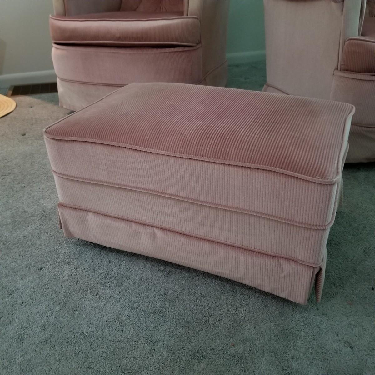 A pair of mauve colored swivel rockers with matching ottomans, made by Les Brown Chair Company.  Button tufted backs with skirts all around.  Micro suede fabric is slightly discolored on arms and headrests. Chairs measure 29"x34"x36" with a 17" seat height. Ottomans are 24"x16"x12" with wood legs. See photos for detail.  Local pickup only.