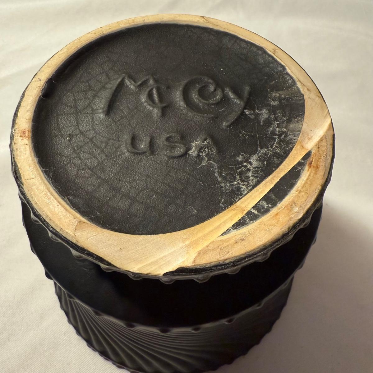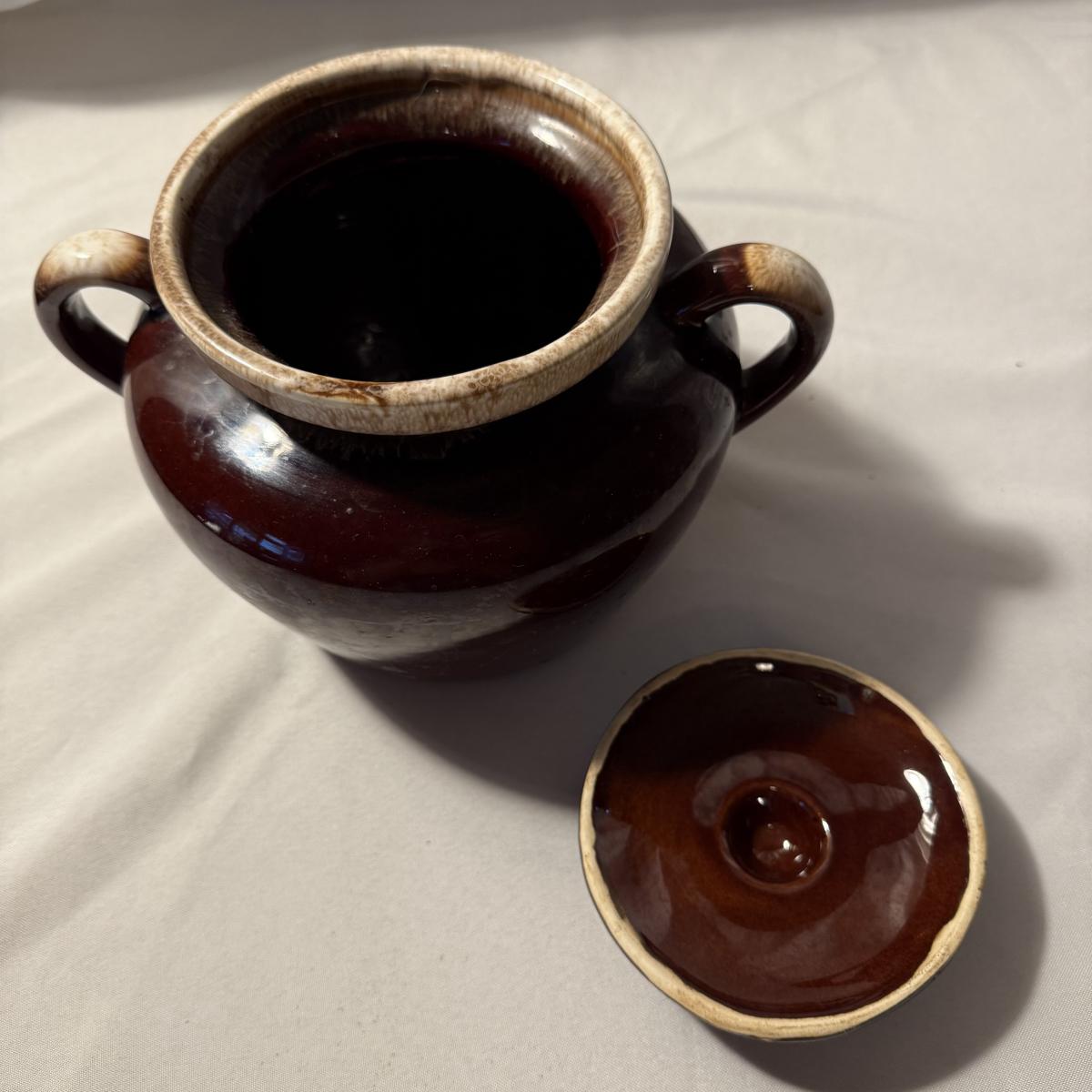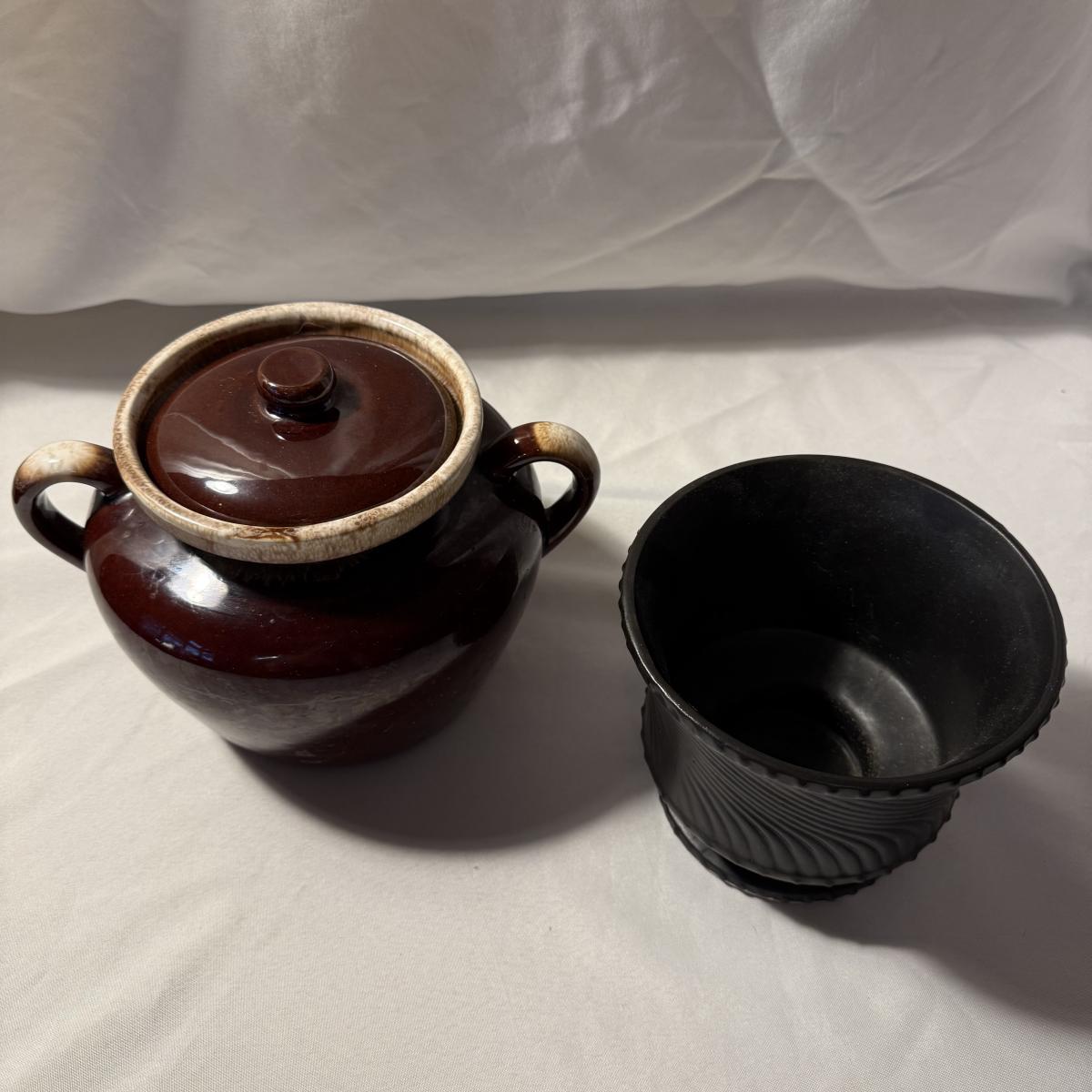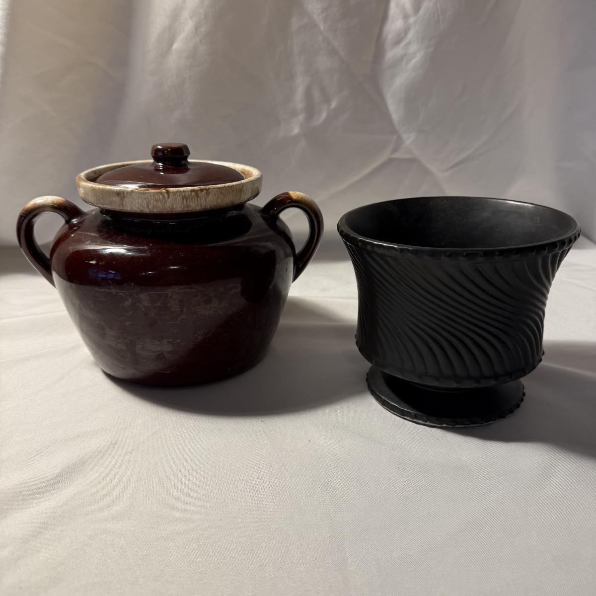 This lot contains two McCoy pottery vessels. The first is a black swirl pedestal planter. This item measures 6”D x 5.5”H. The next item is a McCoy bean pot with brown drip glaze. This pot comes with a lid, two handles, and measures 9” x 8” x 7.5”H. Shipping available.