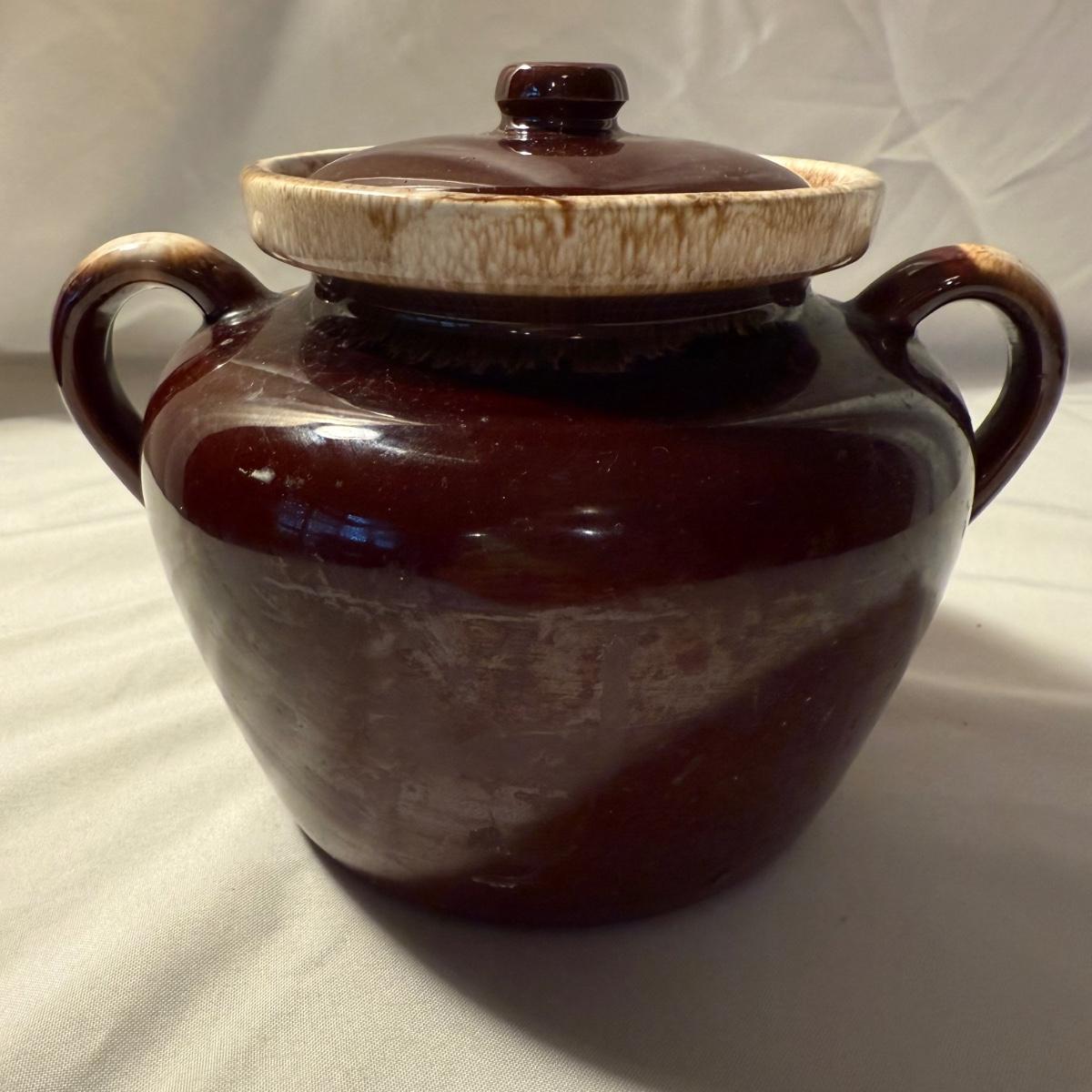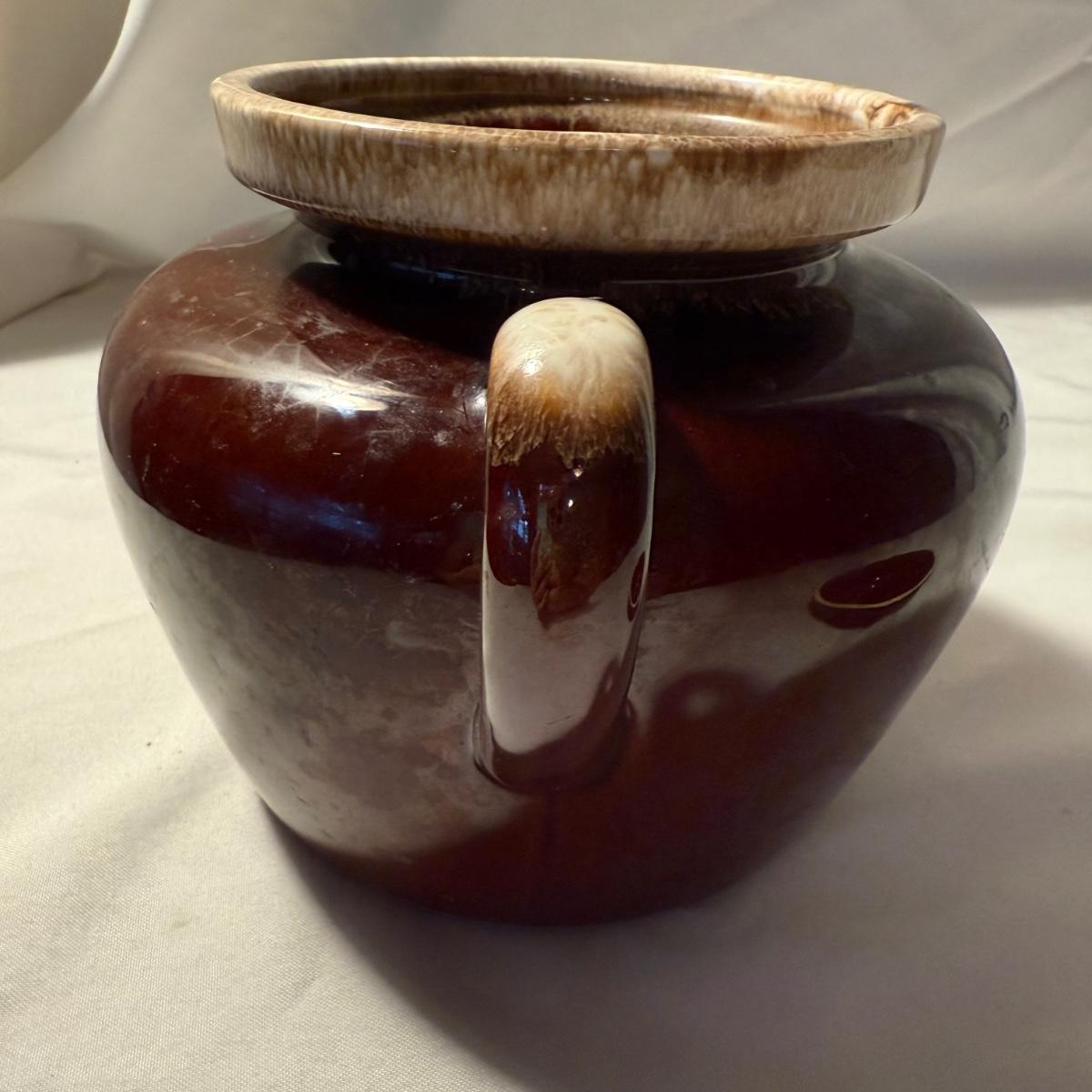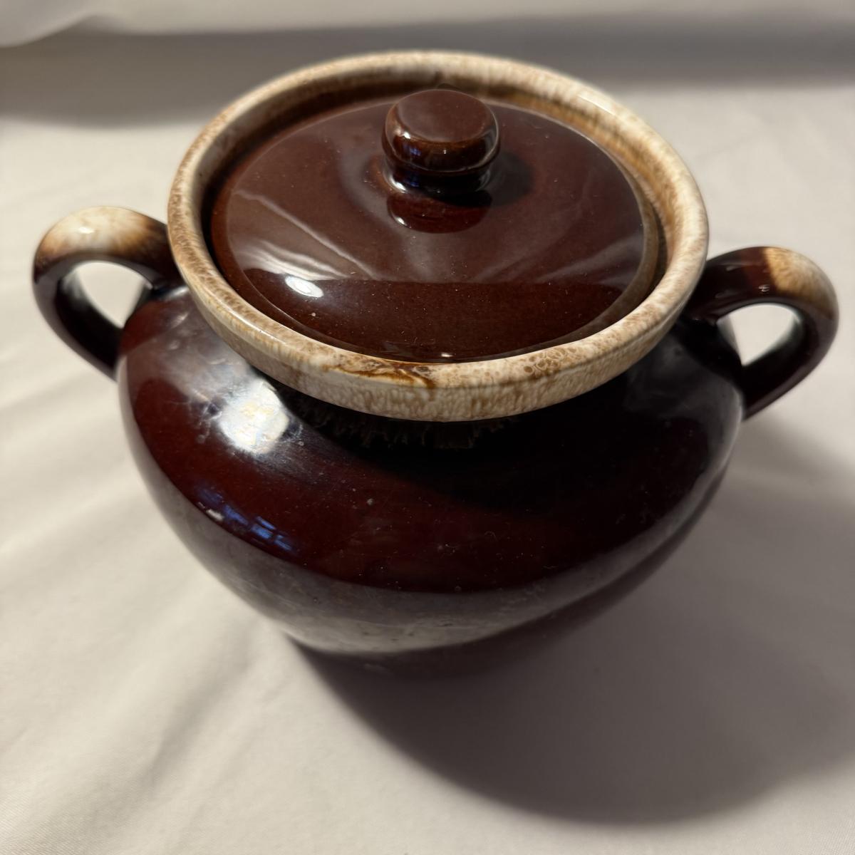 This lot contains two McCoy pottery vessels. The first is a black swirl pedestal planter. This item measures 6”D x 5.5”H. The next item is a McCoy bean pot with brown drip glaze. This pot comes with a lid, two handles, and measures 9” x 8” x 7.5”H. Shipping available.
