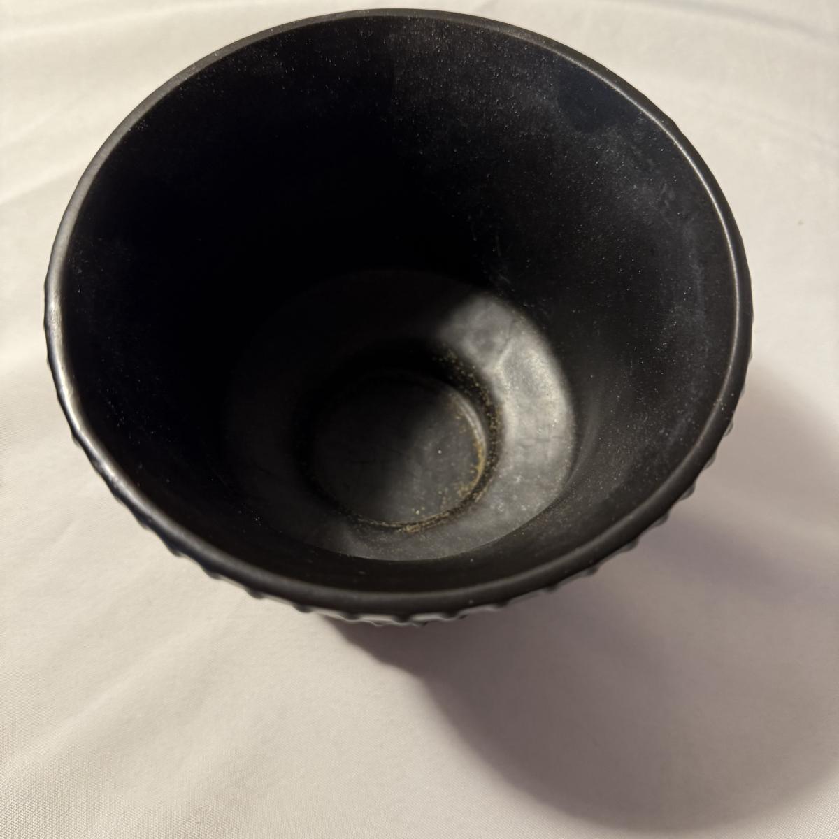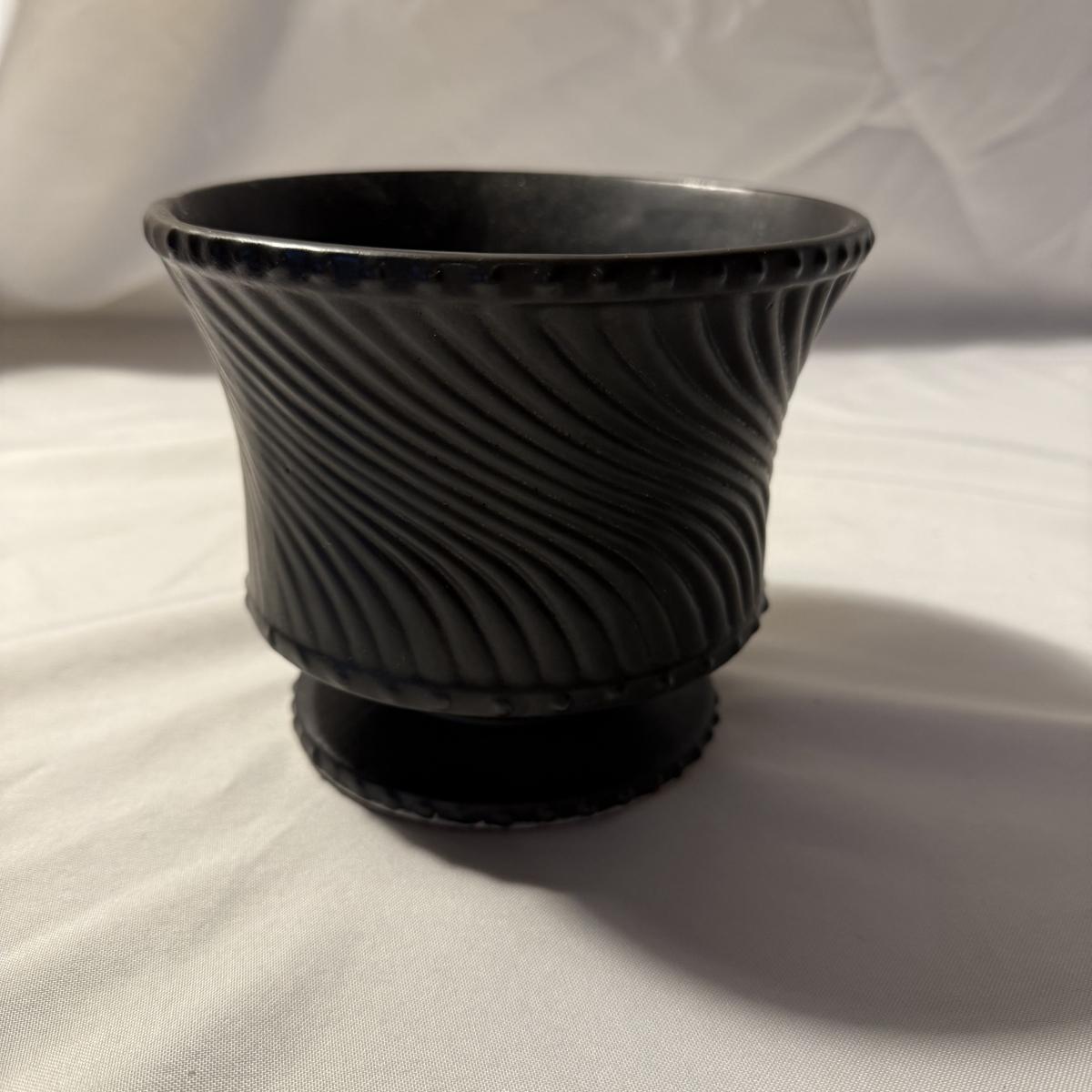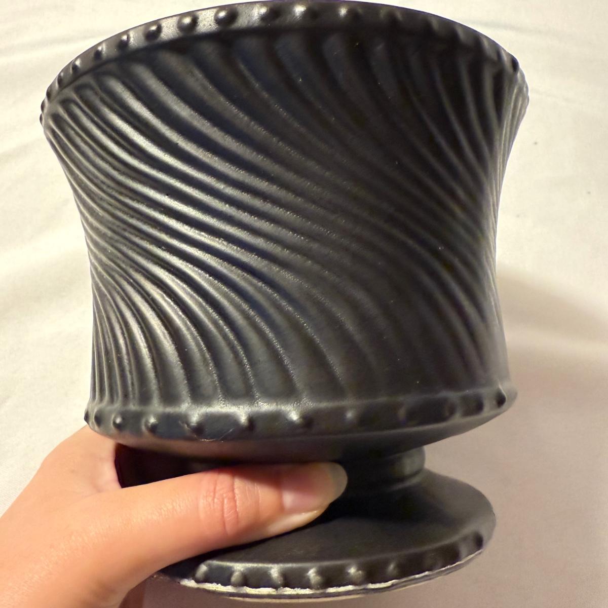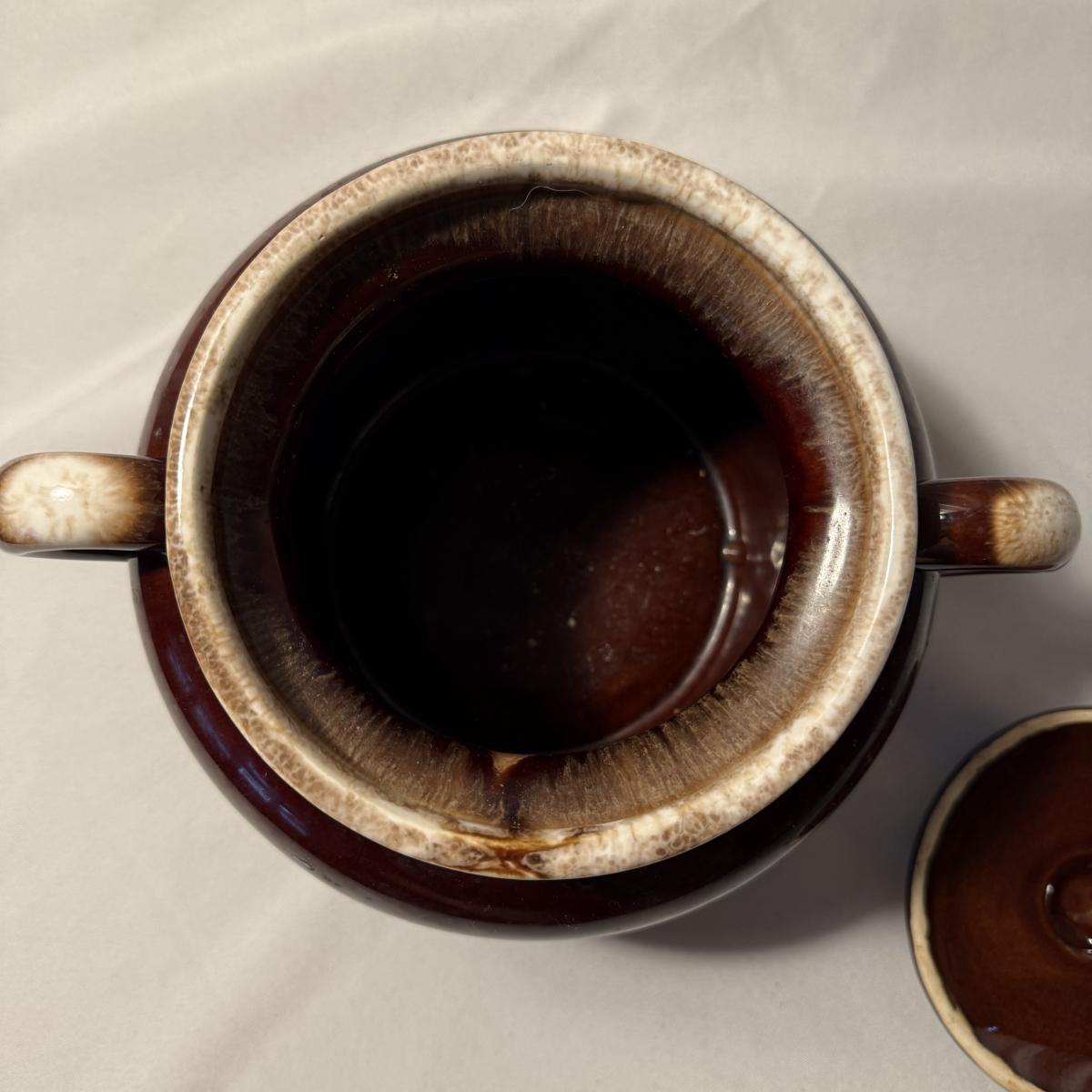 This lot contains two McCoy pottery vessels. The first is a black swirl pedestal planter. This item measures 6”D x 5.5”H. The next item is a McCoy bean pot with brown drip glaze. This pot comes with a lid, two handles, and measures 9” x 8” x 7.5”H. Shipping available.