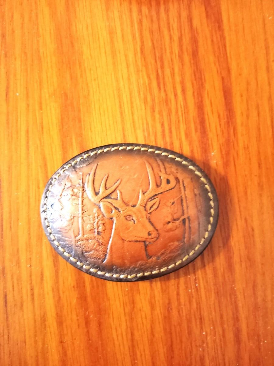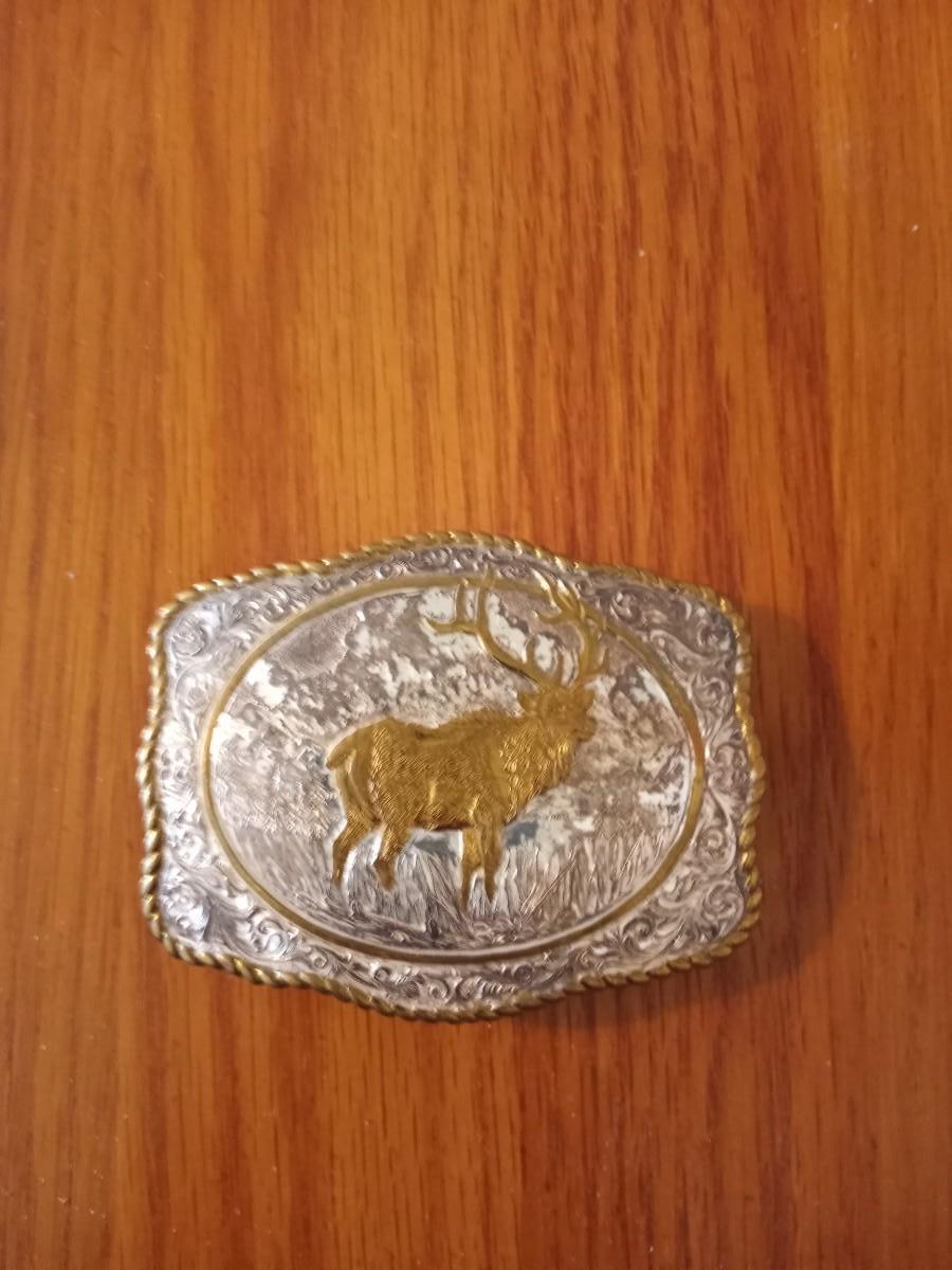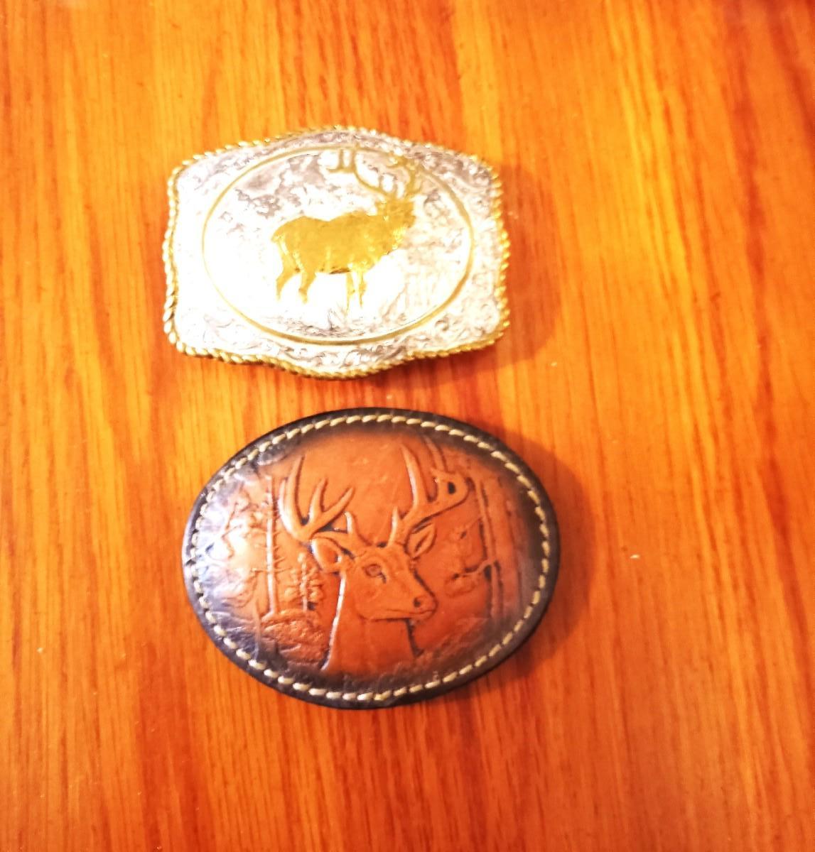 TWO MENS BELT BUCKLES LEATHER ELKHEAD AND SILVER PLATE ELK