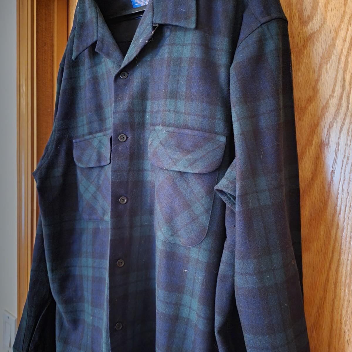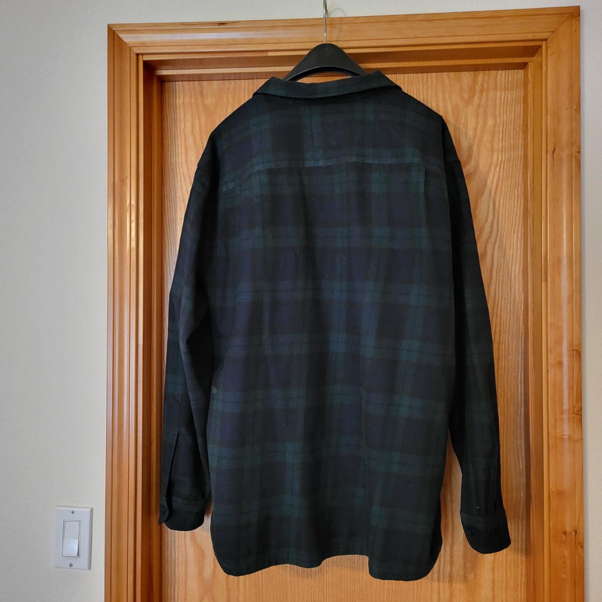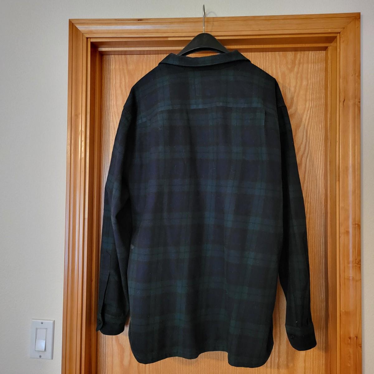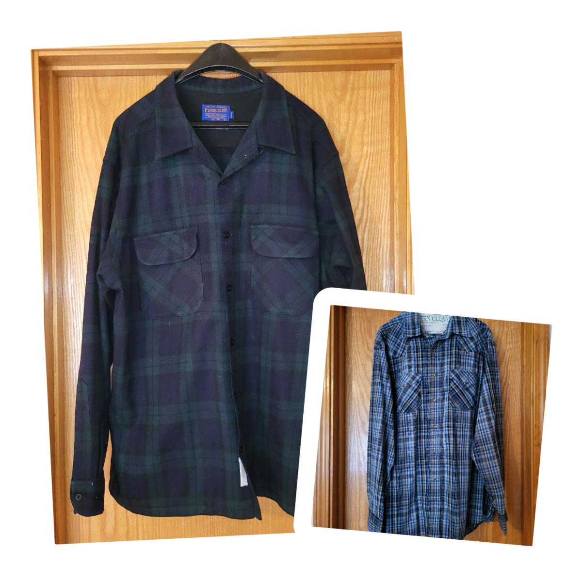 Blue casual shirt with small plaid pattern. Blue/green wool plaid flannel. Both are size XL.