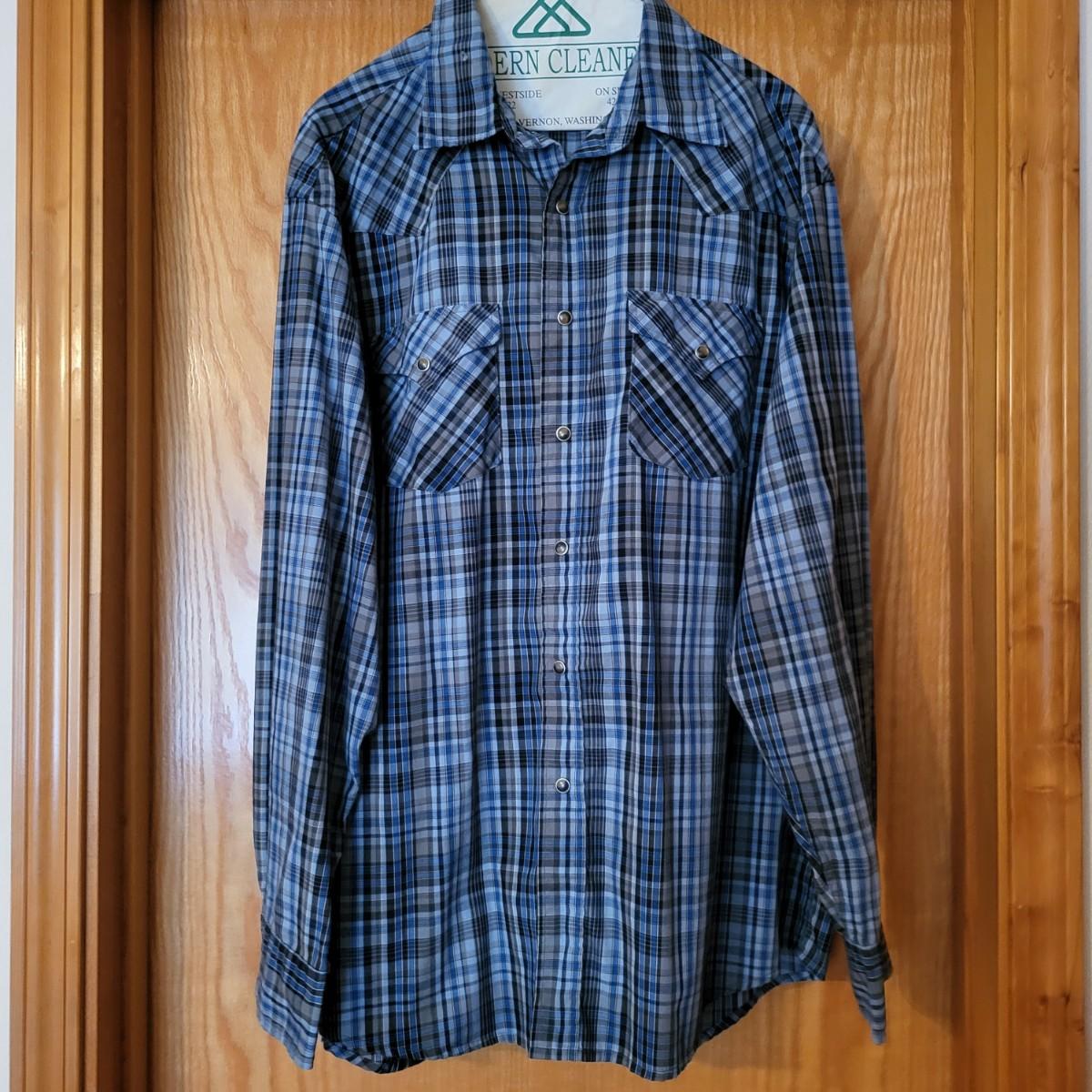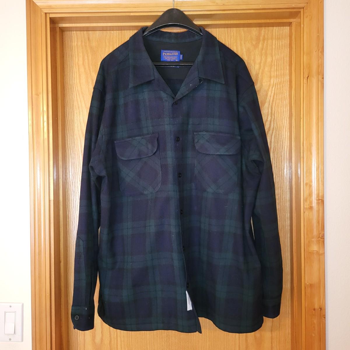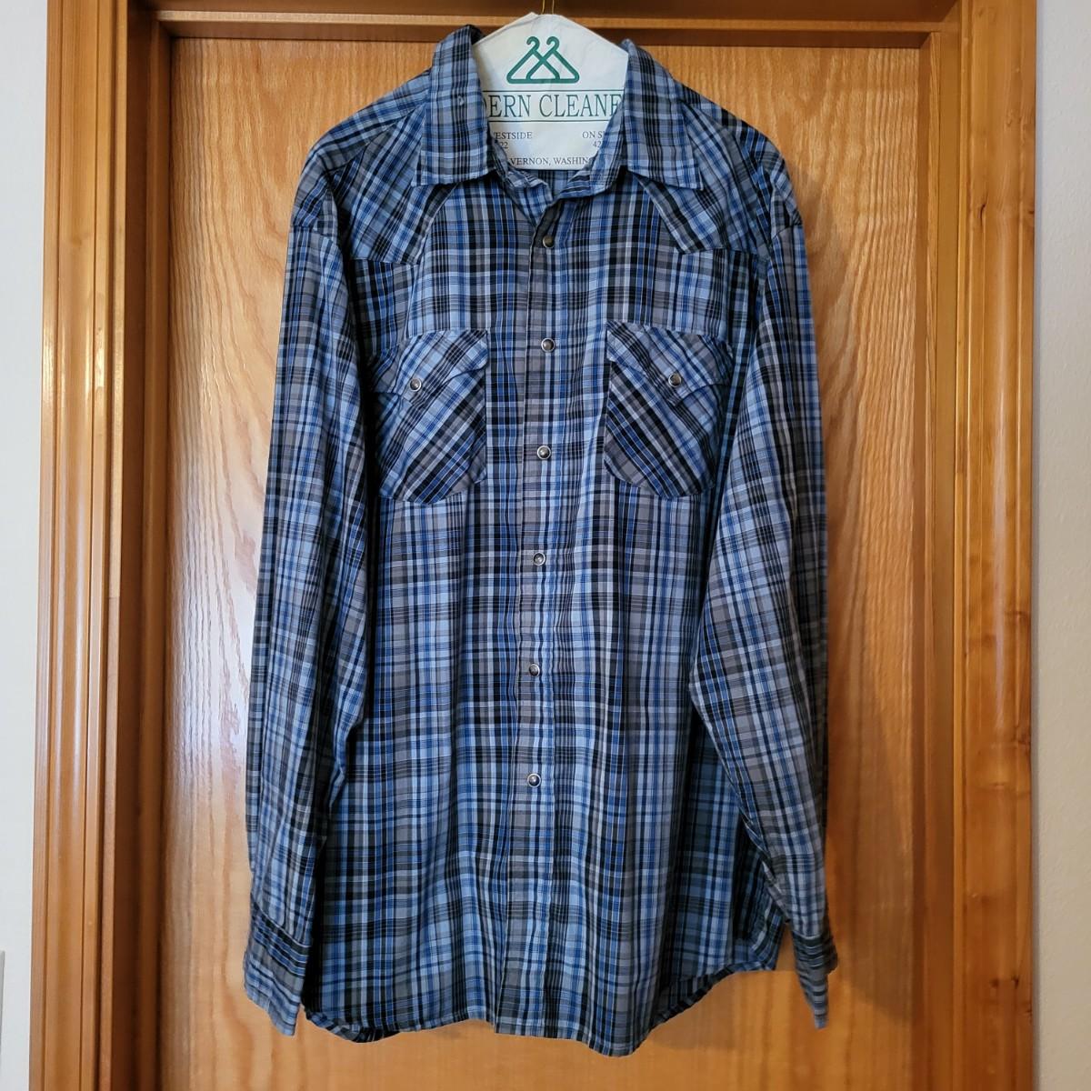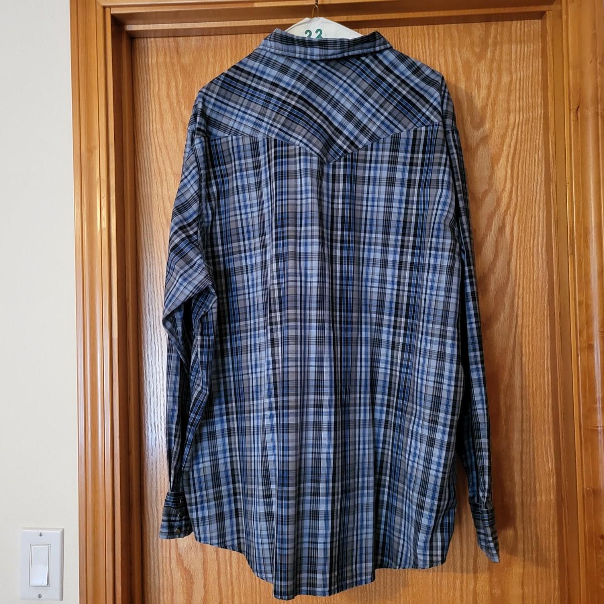 Blue casual shirt with small plaid pattern. Blue/green wool plaid flannel. Both are size XL.