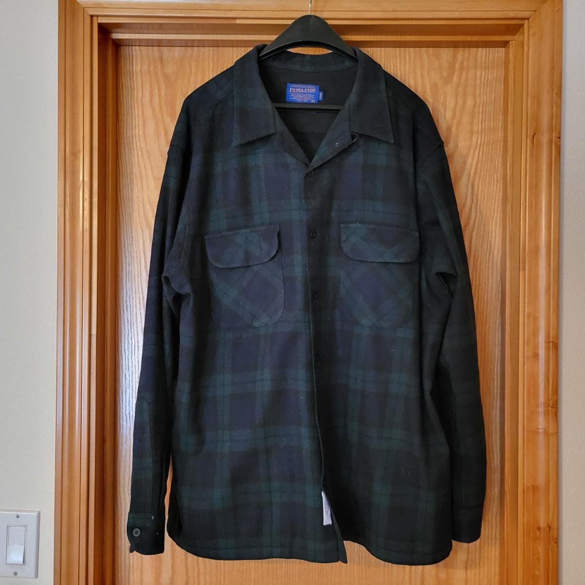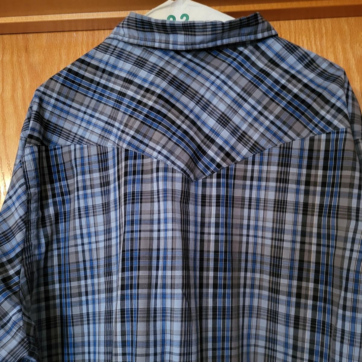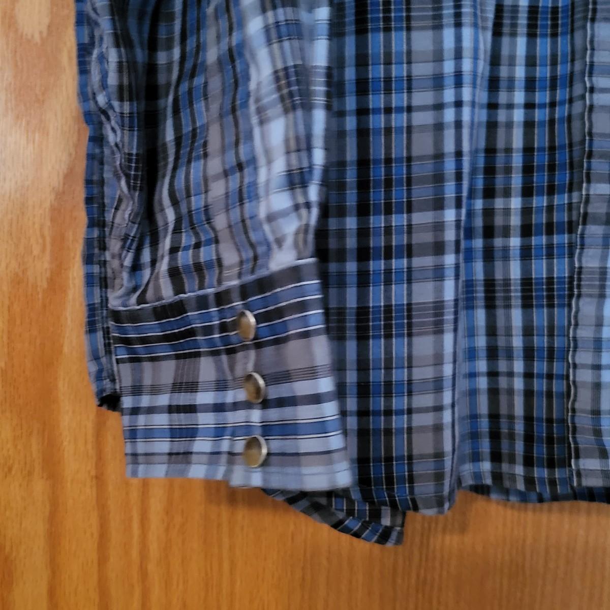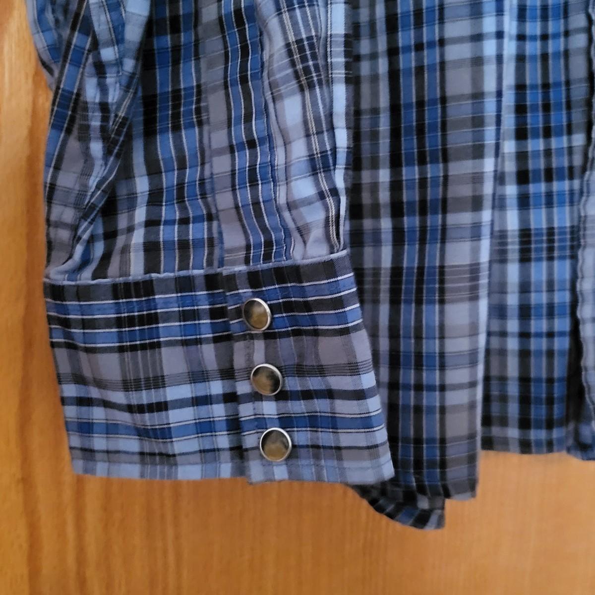 Blue casual shirt with small plaid pattern. Blue/green wool plaid flannel. Both are size XL.