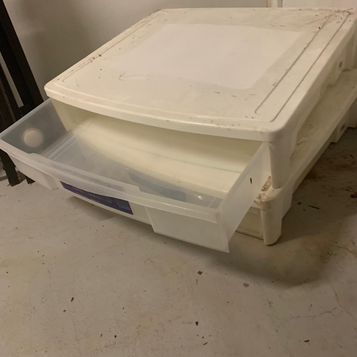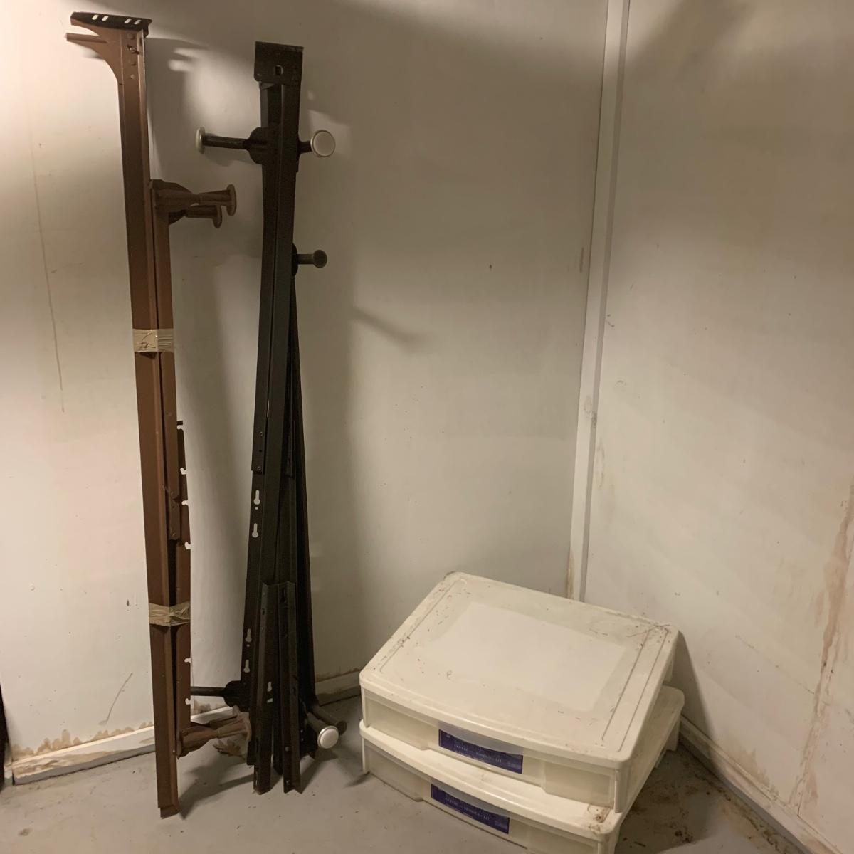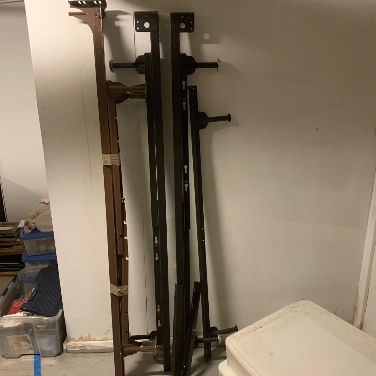 Thea two metal frames appear to be fully intact but were not set up to verify. Both are adjustable and the black one has a center support. The two bins are dirty but in good working order with slide out drawers. Measurement in pix of label. Local pick up only.